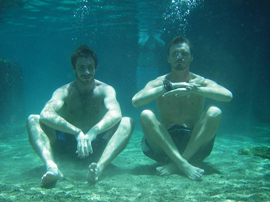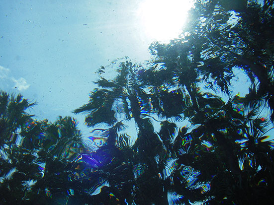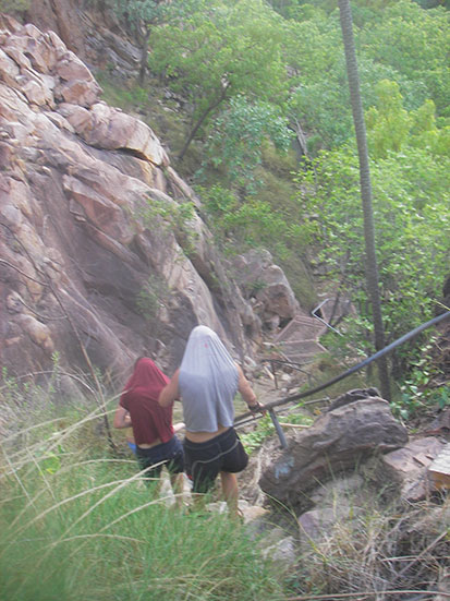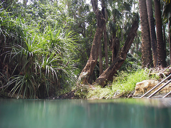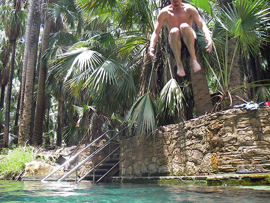 Vor Katherine stand ein Schild mit irgendeinem „Hot Pool“. Pool klang gut. Was uns dann erwartete, war perfekt. Wunderbares klares Wasser, ringsherum Palmen mit Fledermäusen beim Mittagsschlaf. Keine Zeit vergeuden, rein ins Nass! Ich nur mit Shorts. Das Paradis! Die Mittagshitze ging an uns locker vorrüber. Wir planschten, tauchten und genossen einfach die Abkühlung an diesem schönen Ort, umso mehr nach der vergangenen harten Nacht. Wunderbar! Waterproof Camera rocks again.