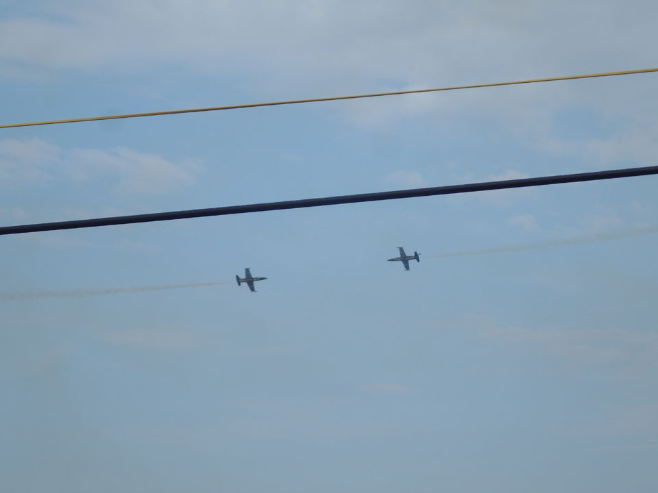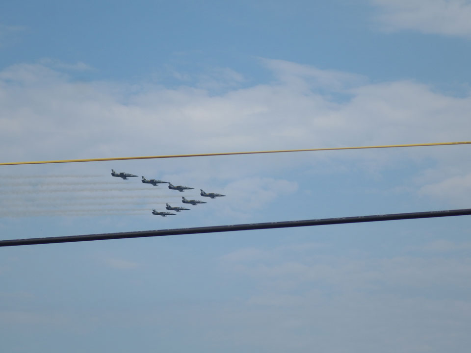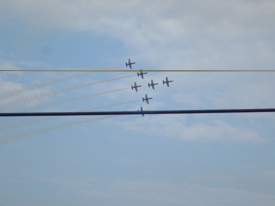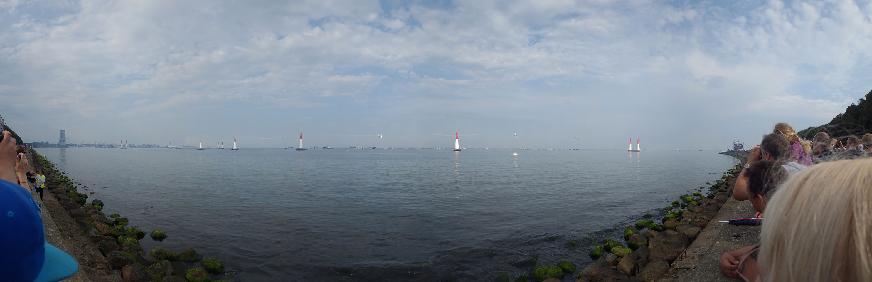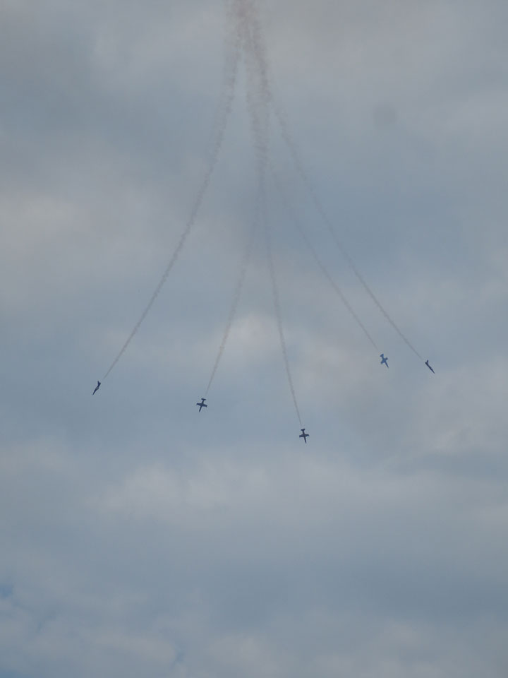 Irgendwie ist so ein Rennsport gegen die Zeit und ohne sichtbare Konkurrenten nur halb interessant. Ich fand’s OK, der Kommentator versuchte immer Stimmung in die Bude zu bekommen. Die Flieger drehten halt ihren Runden und die Skills sind schon ganz gut. Die Pausenshow mit Düsenjets war besser.