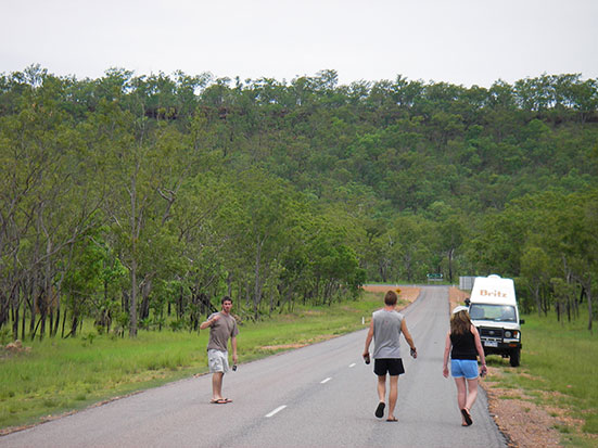 Ein Stopp im wahnsinnig grünen Batchelor brachte uns ein paar Dosen Spaghetti und Baked Beans ein. Mit gefrorenem Toast machten wir weiter in den Litchfield National Park. An einem kleinen See wurden hatten wir Mittagessen. Die Fliegen waren auch hier etwas lästig. Warme Spghetti mit Bohnen auf Toast. Lecker!