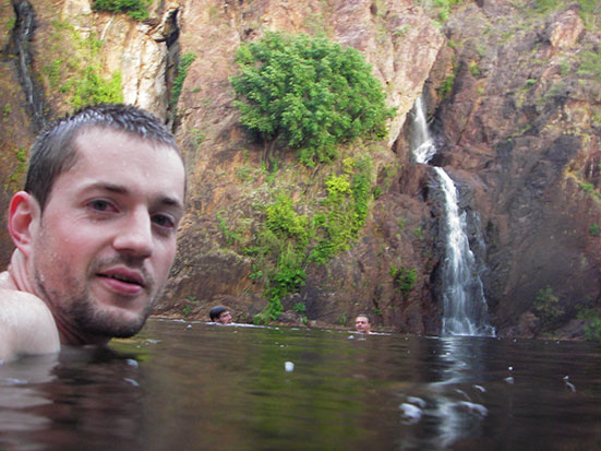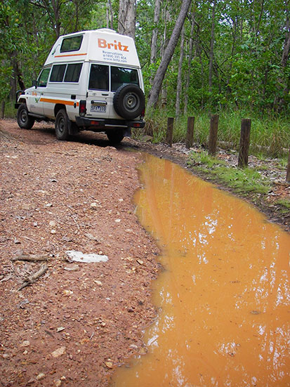 Vorbei an Pine Creek und noch einer Tanke mit Wasserbüffel kamen wir gut voran. Ich setzte mich ans Steuer. Im Litchfield Park wollten wir eine 4WD Strecke ausprobieren. Der Weg dahin war nicht so einfach zu finden. Wir rollten auf kurvigen Wegen hin und her und wieder hin. Dann für länger und sahen schließlich, dass der Track geschlossen war. So ein Mist! Wahrscheinlich hat der Regen bissel was weggewaschen. Die Alternativroute führte uns erst mal nach Adelaide River. In der Nähe war ein Wasserfall. Immer gut für eine Erfrischung.