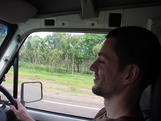 Die Irin fuhr einen Dirt-Track und machte sich damit sehr wertvoll. Blitze zuckten an den Wolken entlang und schlugen weit weg in die Erde ein. Eine coole Lightshow. Wir entfernten uns auf unserem Weg vom Gewitter. Immer wieder überholten uns ein paar Autos von hinten. Bei der Strecke hier war jedoch volle Aufmerksamkeit angesagt. Sobald wir auf befestigter Straße waren stand ein Schild: Darwin 43 km. Freude!
