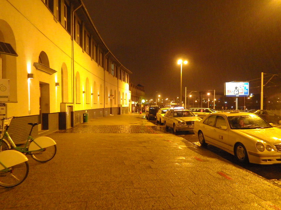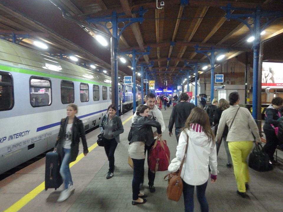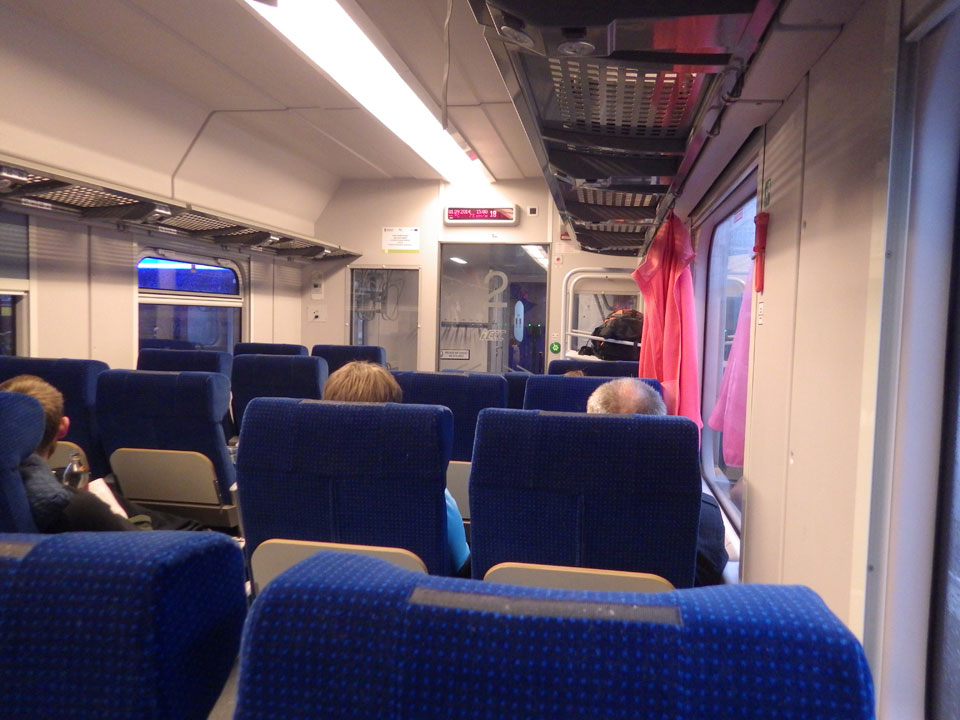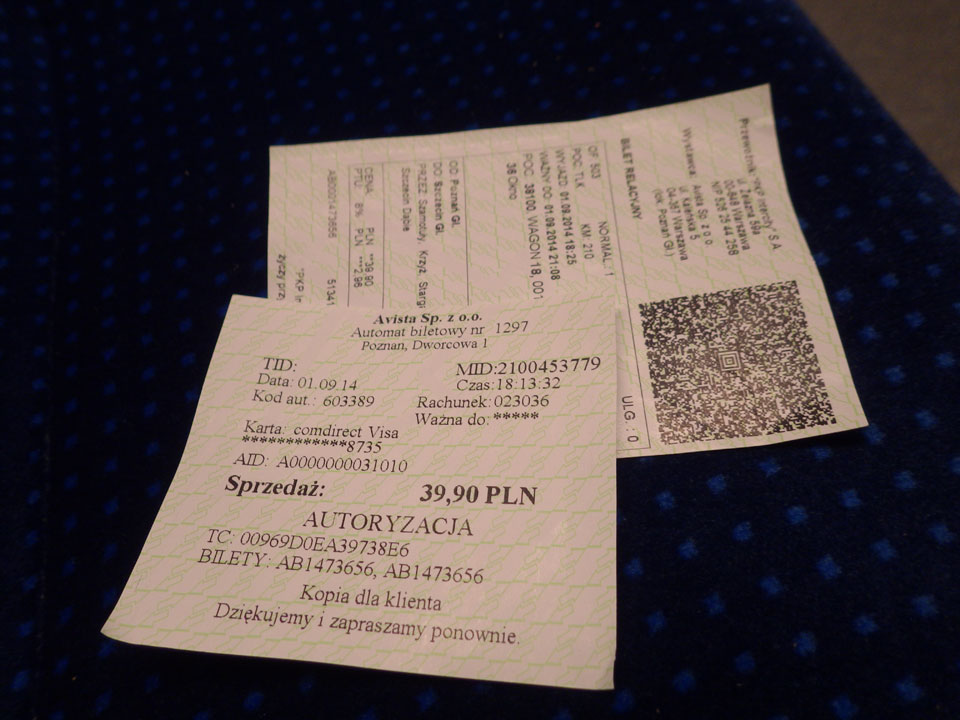 Mit der Straßenbahn dann kurz vor 18:00 Richtung Bahnhof. Wieer stieg ich eine Station zu zeitig aus. So hechelte ich mit dem Gepäck im Nieselregen, kaufte mein Ticket am Automaten (PLN 39,90). Dann kam ein Zug, Szczecin stand dran. Ich rein, suchte meinen Platz und dann saß ich. Nichts bewegte sich. Auf dem Nachbarbahnsteig fuhr ein modernerer Zug ein – sah eher nach meinem Aus, auch Szczecin und meine Uhrzeit. Ich fragte nach, einer guckte mein Ticket an und ich saß im falschen. Da hatte ich es natürlich sehr eilig und wuchtete mich aus dem Wagon, hüpfte in den Zug gegenüber, was zufällig auch gleich mein Wagon war.