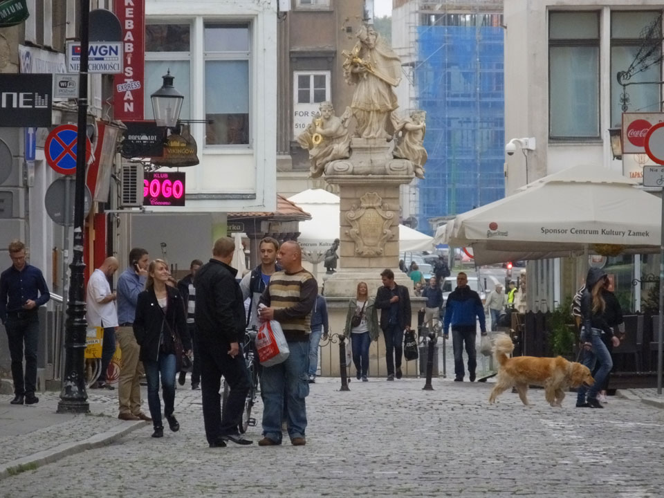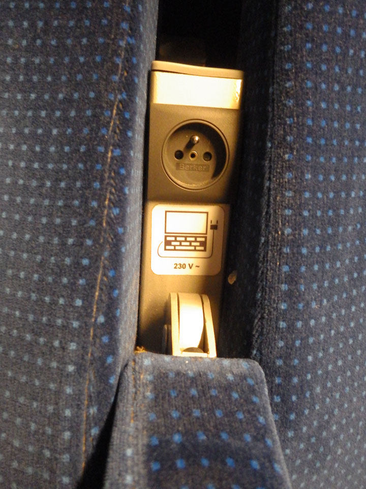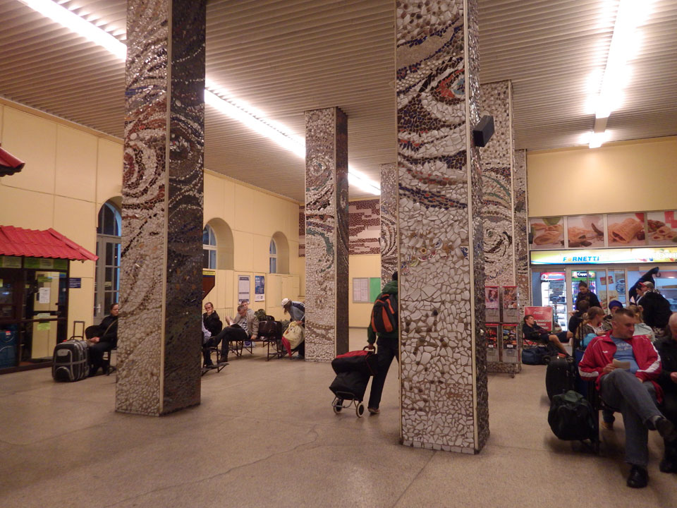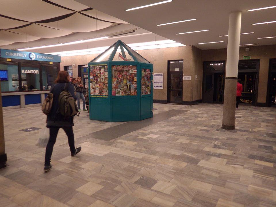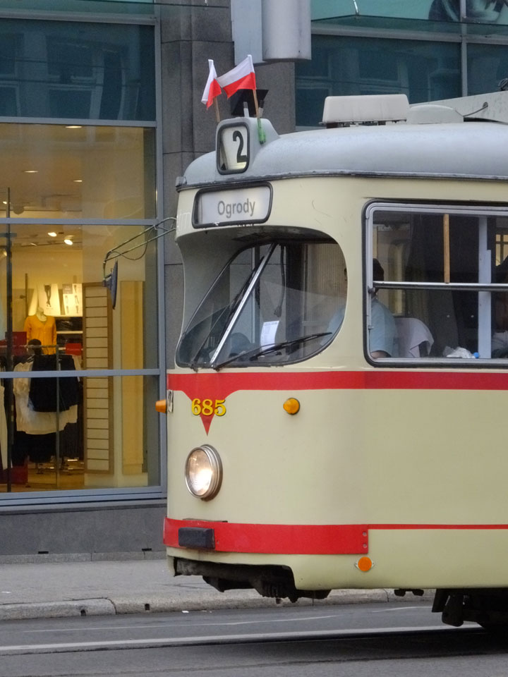 Mit der Straßenbahn dann kurz vor 18:00 Richtung Bahnhof. Wieer stieg ich eine Station zu zeitig aus. So hechelte ich mit dem Gepäck im Nieselregen, kaufte mein Ticket am Automaten (PLN 39,90). Dann kam ein Zug, Szczecin stand dran. Ich rein, suchte meinen Platz und dann saß ich. Nichts bewegte sich. Auf dem Nachbarbahnsteig fuhr ein modernerer Zug ein – sah eher nach meinem Aus, auch Szczecin und meine Uhrzeit. Ich fragte nach, einer guckte mein Ticket an und ich saß im falschen. Da hatte ich es natürlich sehr eilig und wuchtete mich aus dem Wagon, hüpfte in den Zug gegenüber, was zufällig auch gleich mein Wagon war.
