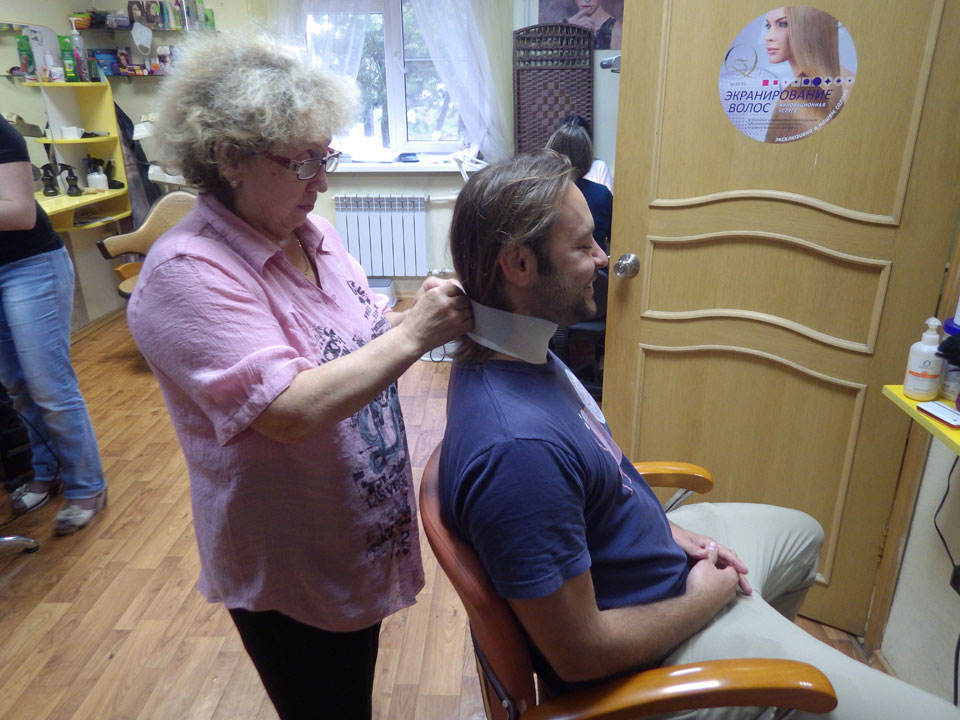Mit so viel Zeit bis zum Flug nach Vladivostok wussten wir nicht so richtig, was wir machen könnten. Wir wollten in die Stadt aber das Wetter wurde regnerisch. Der Amerikaner sollte noch ’nen Mullet-Haarschnitt bekommen. Ich sah dann auf dem Rückweg zum Flughafen einen Friseur und so nahm die Sache seinen Lauf.