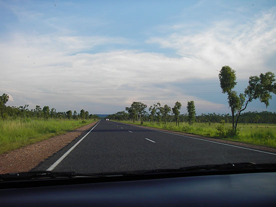 On the road again um 17:00. Raus aus Darwin, die gleiche Strecke, auf der wir vor einer Woche gekommen waren. Alles schien so viel länger zurück zu liegen. Der Platz, wo wir es per Anhalter versuchten… Rückzu sieht alles anders aus. War ich happy und auch etwas traurig. Vor uns lag wieder die endlos lange Straße. Das Wetter war gut und es gab einen Job zu erledigen. 2950km durften wir fahren, $500 maximale Spritkosten werden gesponsort. Ganz so weit sollte es aber nicht sein. Oder doch?