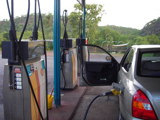 An der Tankstelle mit dem Wasserbüffel (neues nettes hilfsbereites Mädel zur Begrüßung) übernahm ich das Steuer für die zweite Hälfte nach Katherine. Nochmal um die 180km. Mit der Dunkelheit kam Regen auf. Blitze zuckten am Horizont. Die Roadtrains zogen gigantische Wasserwolken hinter sich her. Das schaffte auch der beste koreanische Scheibenwischer nicht mehr. War nicht ganz einfach aber Katherine war mit insgesamt um die 350km geradezu ein Katzensprung von Darwin. Ein Hüpfer auf der Karte. Wir überlegten uns die Route. Sollte die kürzeste Strecke asphaltiert sein, könnten wir viel Weg sparen. Ohne 4WD sind Schotterpisten in der Regensaison tabu. Das Wasser steigt an einigen Orten um Meter.