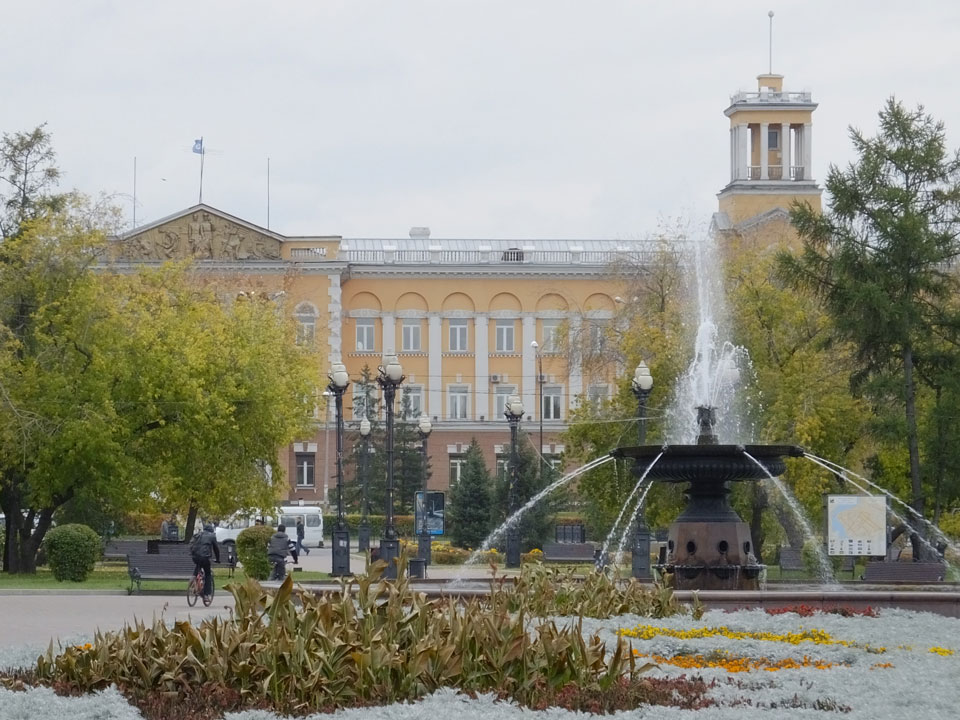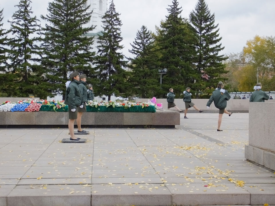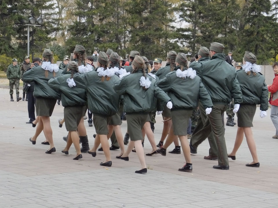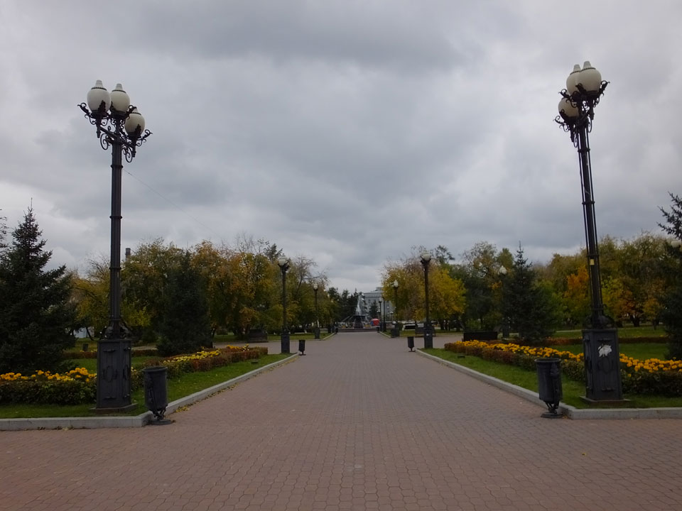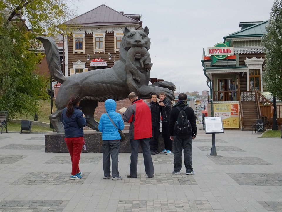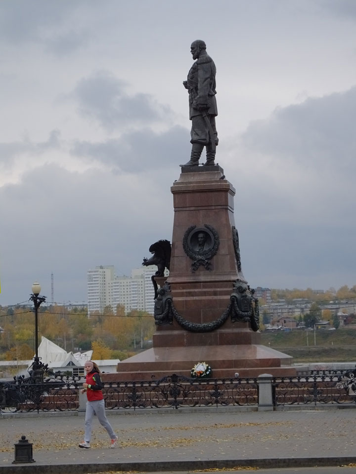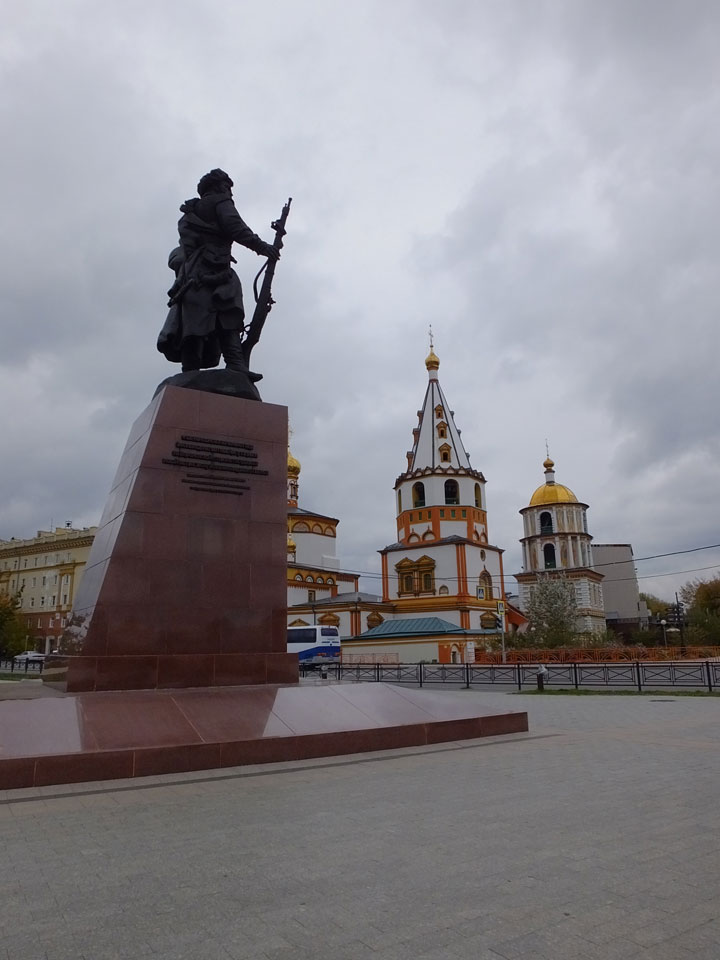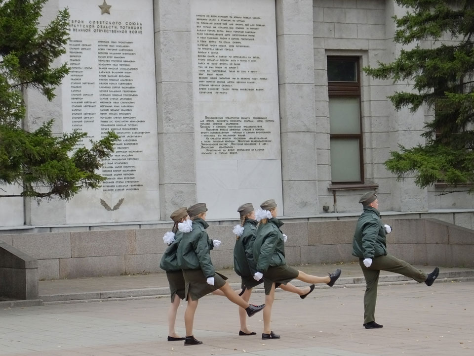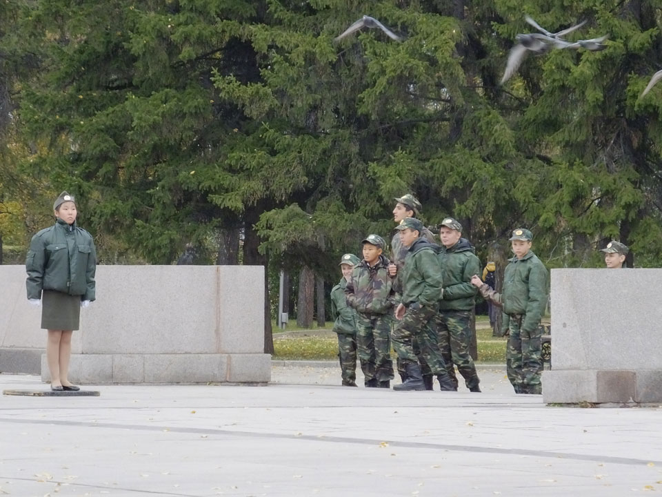 Nachmittags dann raus in’s heute graue Irkutsk. Gestern noch im T-Shirt in strahlender Sonne, heute bitterlich kalt. Ich stieg in Irkutsk umher, ging bis an den Fluss und sah so eine Art Mahnwach-Ablösung von jungen Mädels. Bedeckter Himmel und Herbstwetter machten den Stadtrundgang nicht gerade zum Vergnügen. Bei dem Wetter hatte ich auch keine Lust runter zum See zu fahren. Dauert eben auch komplett 2-3 Stunden.