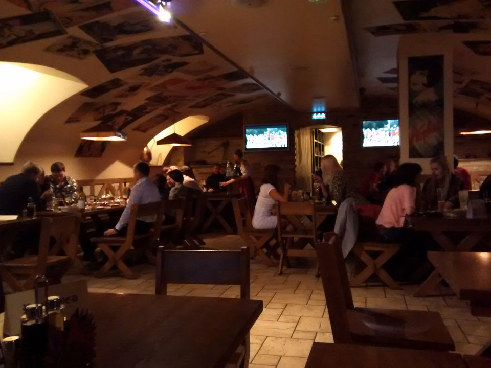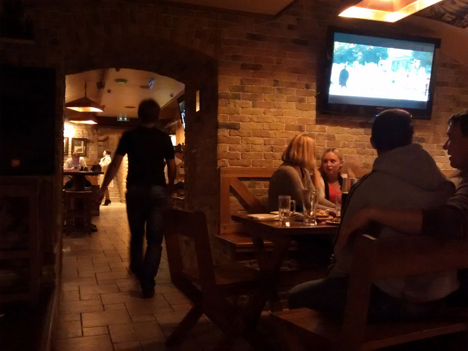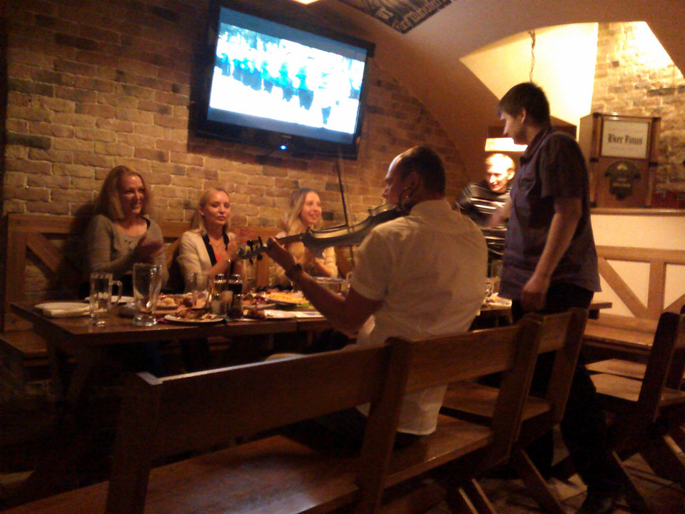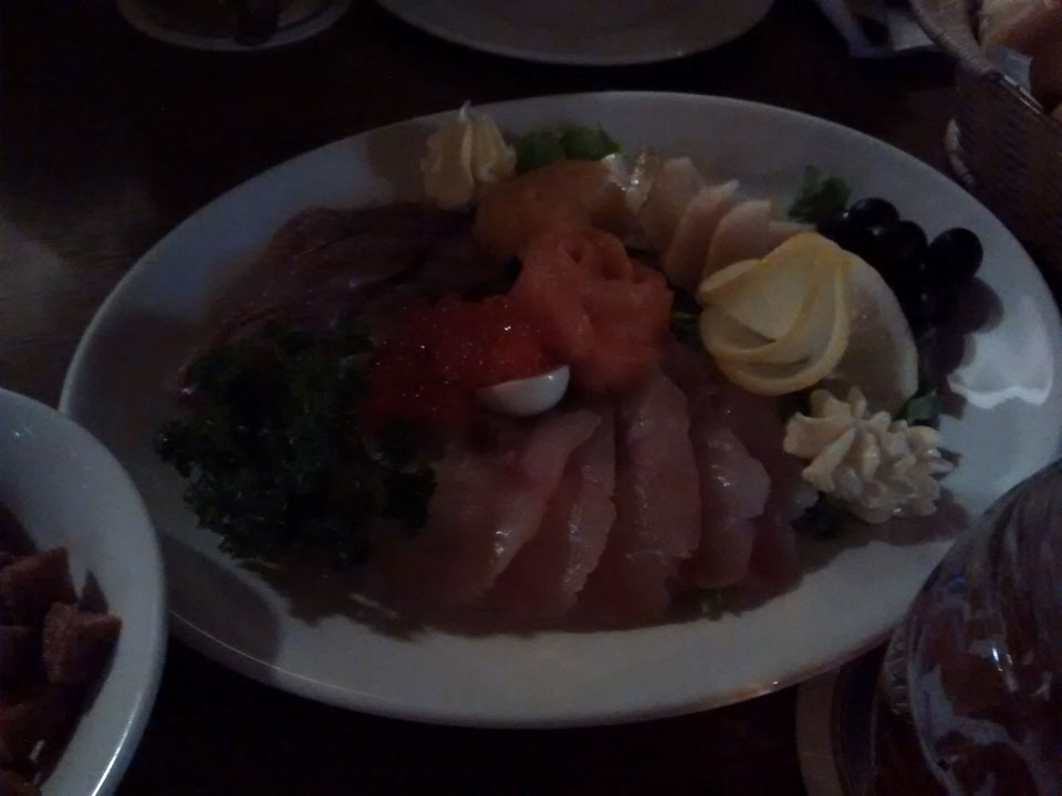 Wir nahmen zwei „Jiguli“ Bier und ich die Fischplatte. Ganz schön teuer für fast 700 RUB aber hier am Baikalsee hatte ich den lokalen Fisch Omul im Zug verpasst. Die Platte war das Geld dann auch wert mit allerhand aviar und Fischsorten. Live-Musik gab’s auch. Da sitzte ich nun in Sibirien in einem deutschen Bierhaus und es spielt ein Russe, mit Bayerhut „Get Lucky“ auf ’ner Geige. Ganz schön irre, die Welt. Ich war zufrieden.