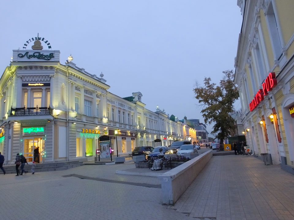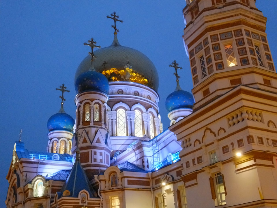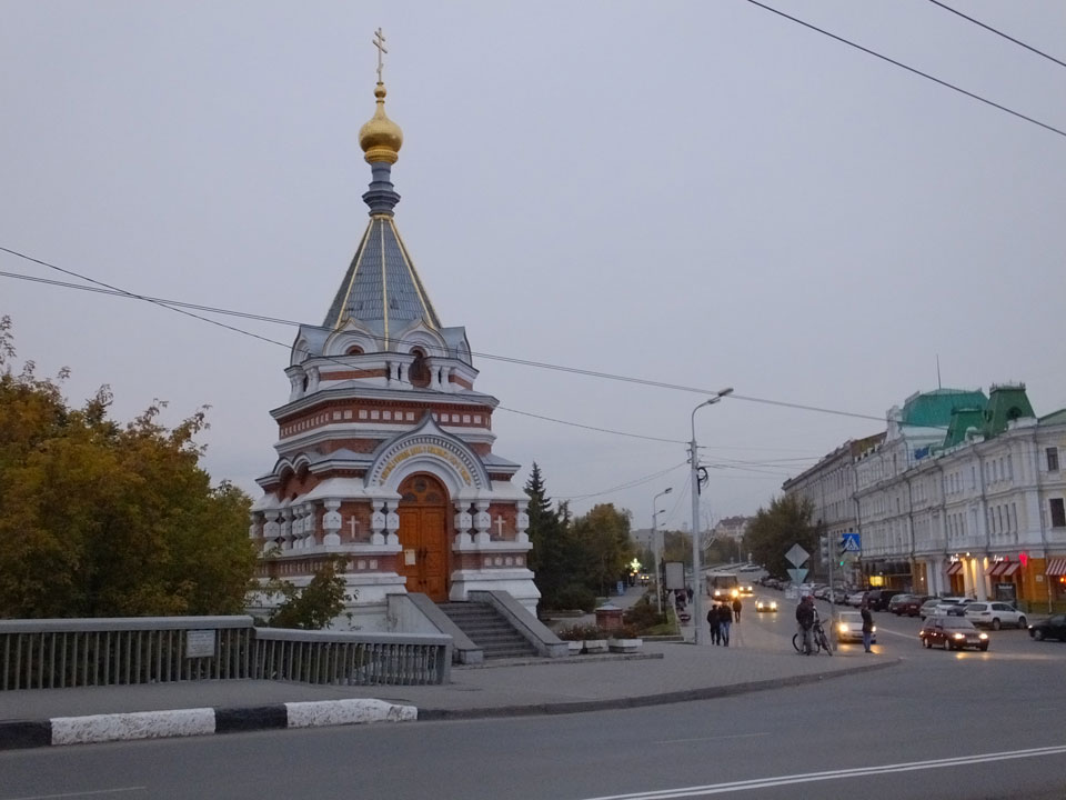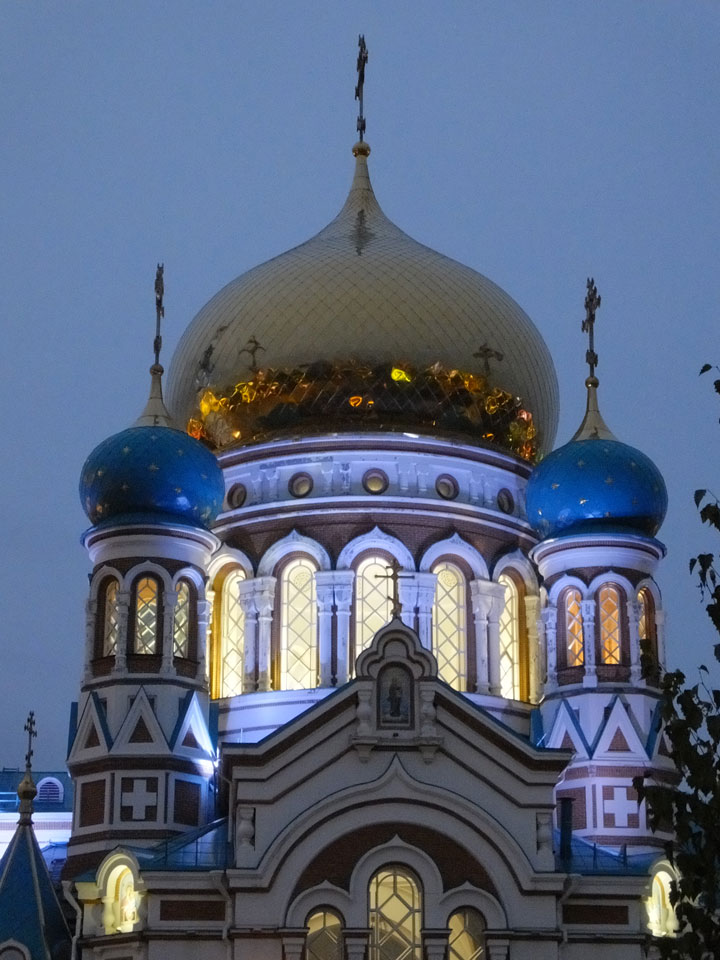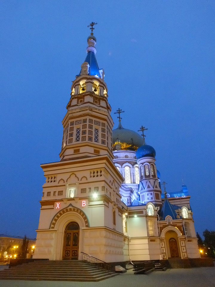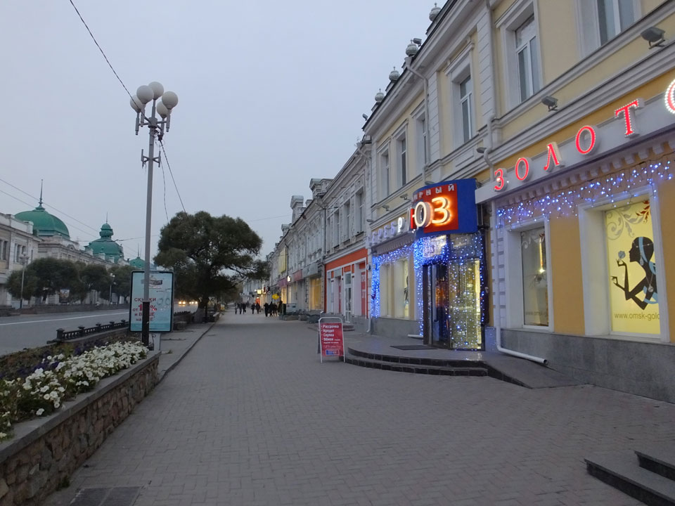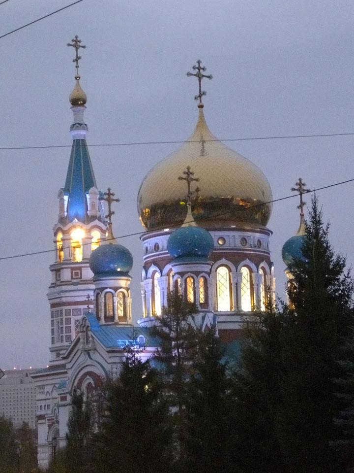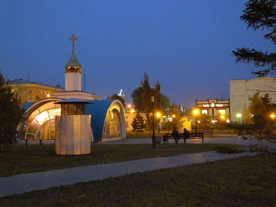 Weiter auf einer Fußgängerzone. Da ein paar Polygon-Strukturen und Museen. Ich wanderte weiter zur Shopping-Gegend über den Fluss. Da war Omsk überraschend teuer. Ein paar Leute können sich die Westklamotten eben überall leisten. Es wurde inzwischen dunkel und so fand ich auch noch eine Kirche, die ganz nett aussah. Ich habe somit in den reichlich 3 Stunden das meiste von Omsk gesehen.