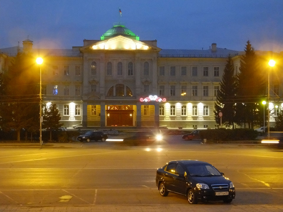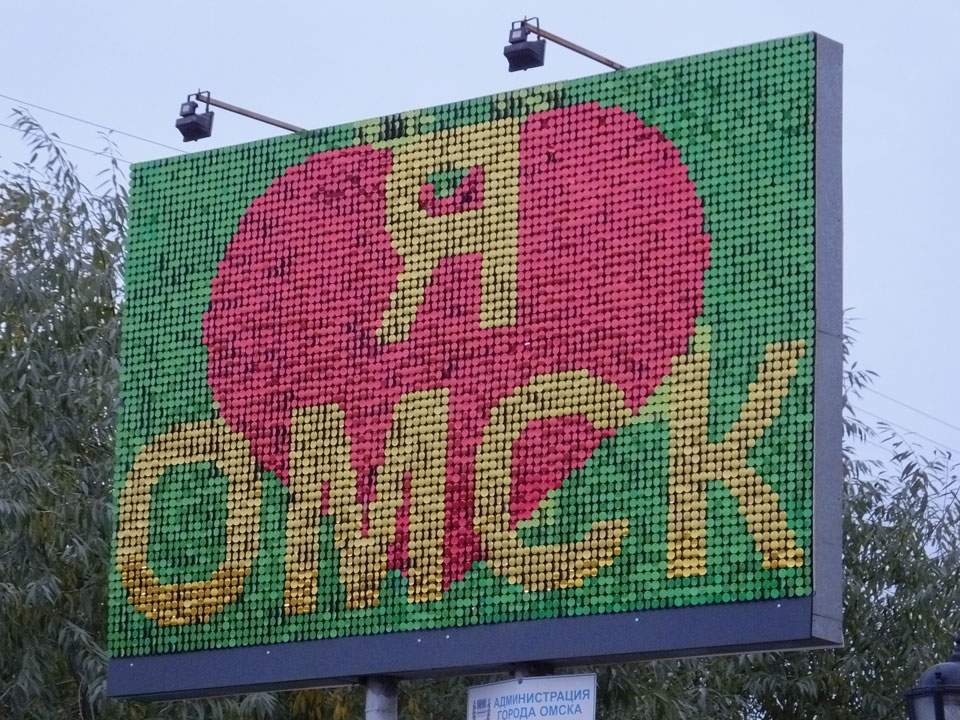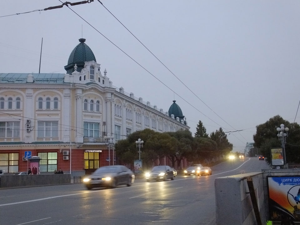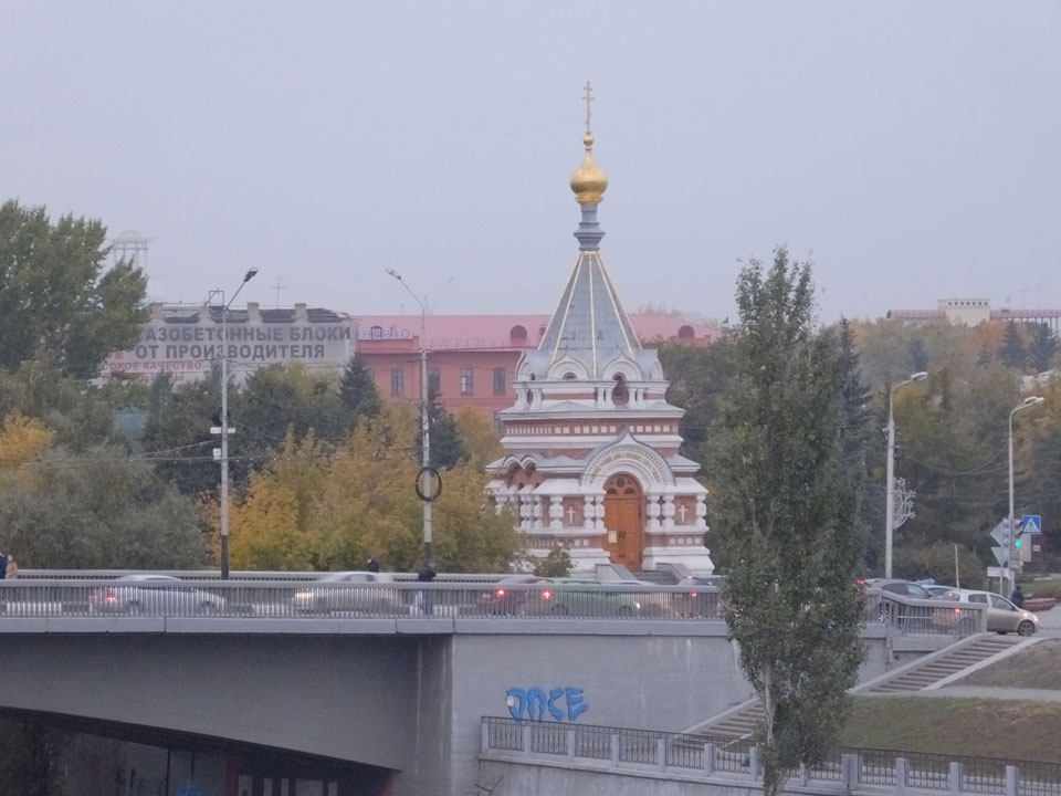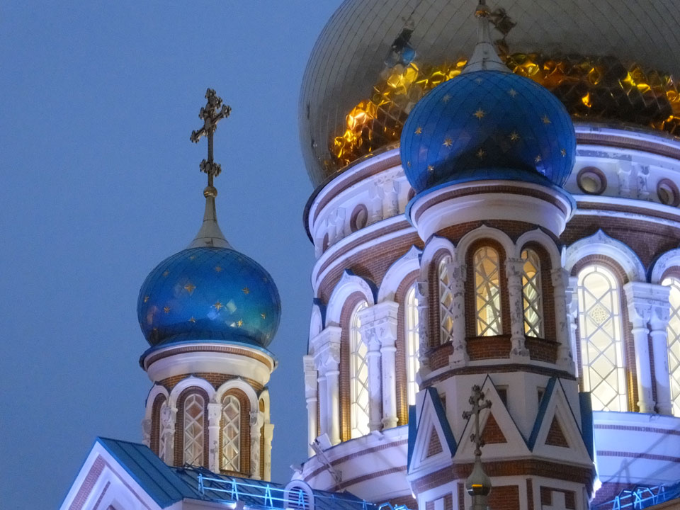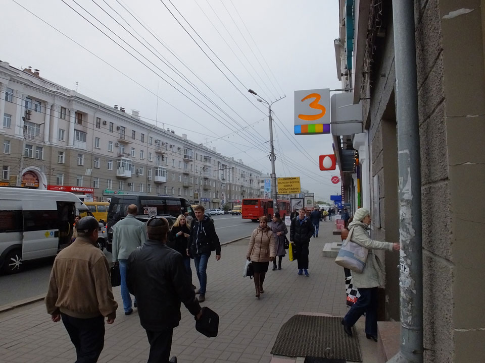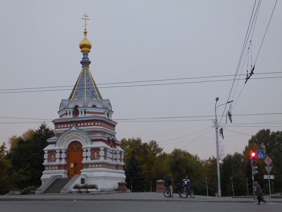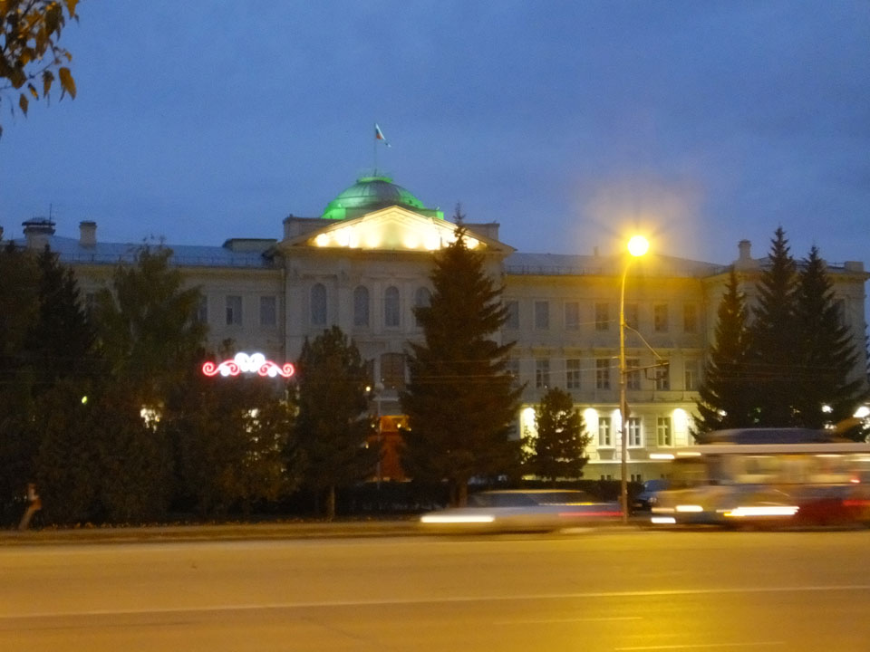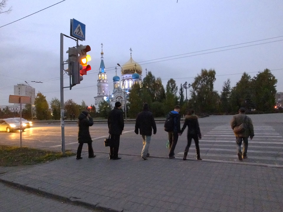 Weiter auf einer Fußgängerzone. Da ein paar Polygon-Strukturen und Museen. Ich wanderte weiter zur Shopping-Gegend über den Fluss. Da war Omsk überraschend teuer. Ein paar Leute können sich die Westklamotten eben überall leisten. Es wurde inzwischen dunkel und so fand ich auch noch eine Kirche, die ganz nett aussah. Ich habe somit in den reichlich 3 Stunden das meiste von Omsk gesehen.