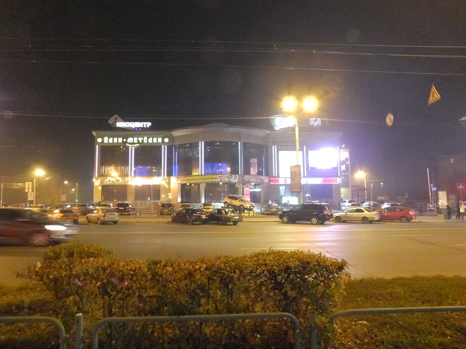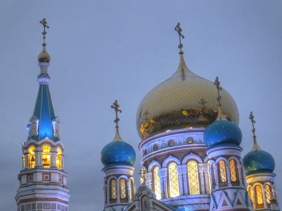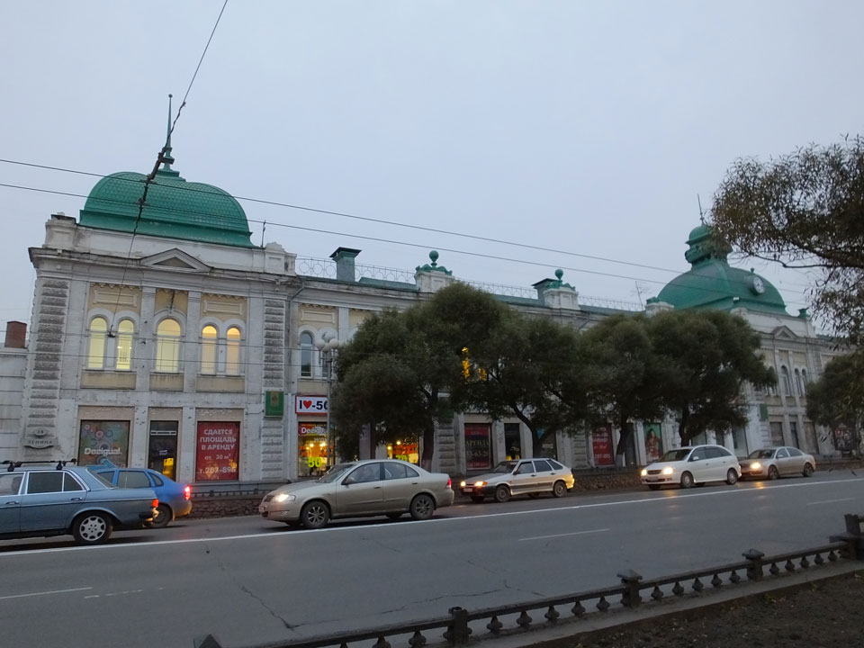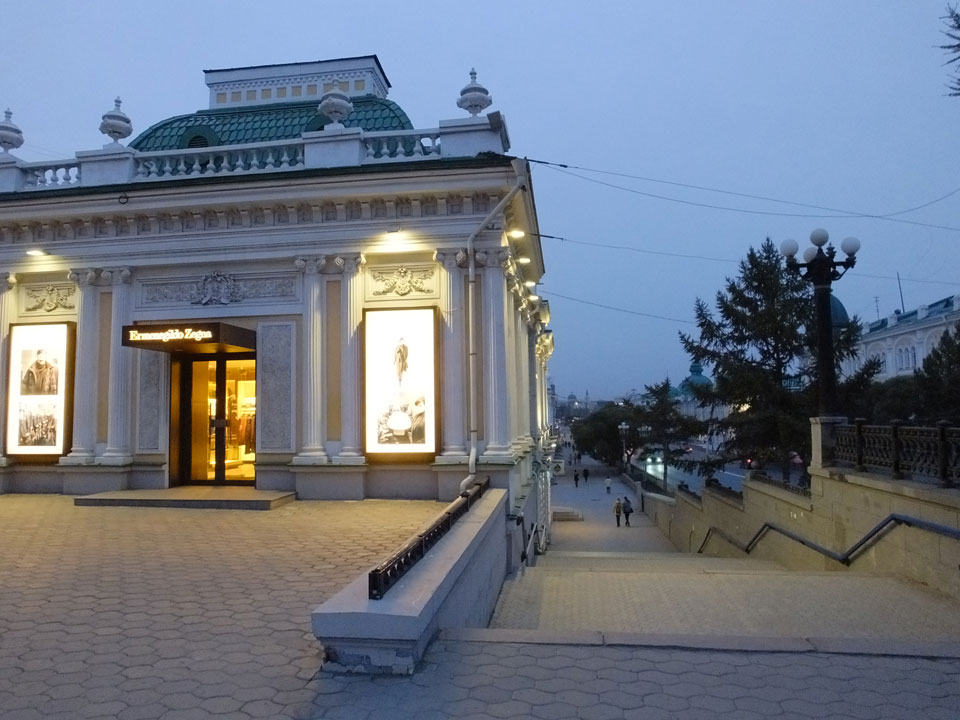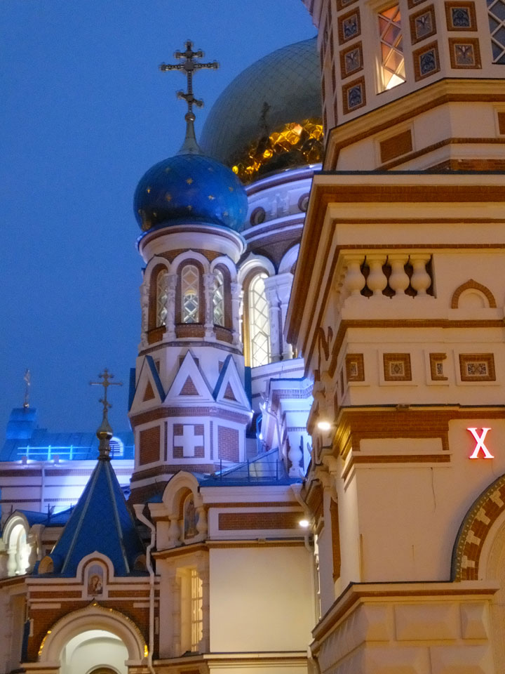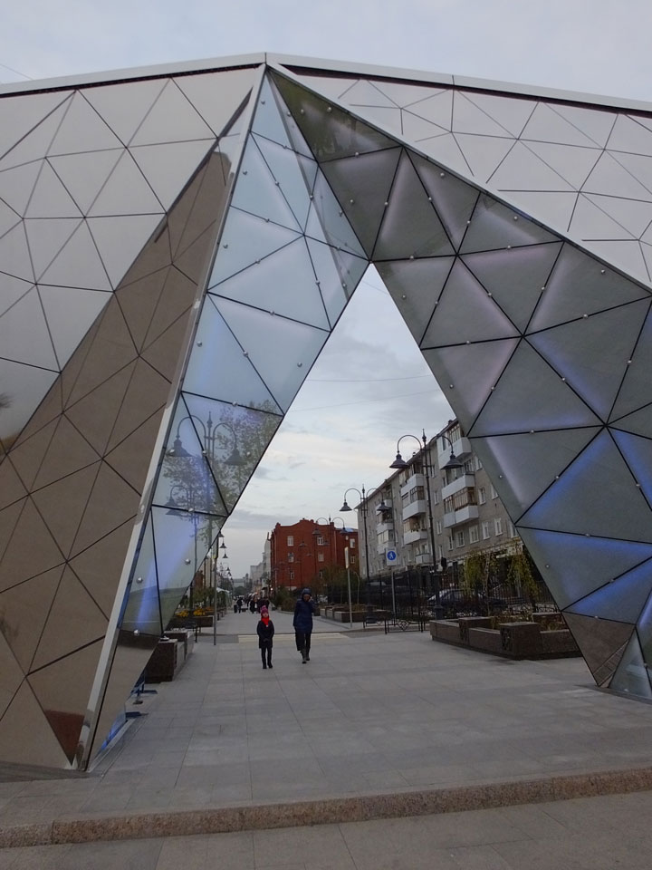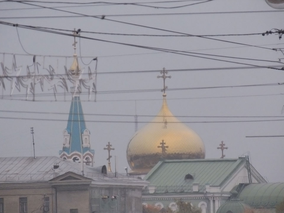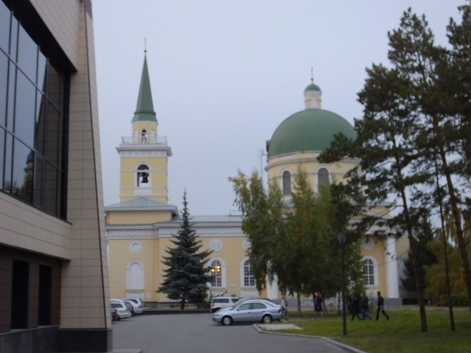 Weiter auf einer Fußgängerzone. Da ein paar Polygon-Strukturen und Museen. Ich wanderte weiter zur Shopping-Gegend über den Fluss. Da war Omsk überraschend teuer. Ein paar Leute können sich die Westklamotten eben überall leisten. Es wurde inzwischen dunkel und so fand ich auch noch eine Kirche, die ganz nett aussah. Ich habe somit in den reichlich 3 Stunden das meiste von Omsk gesehen.