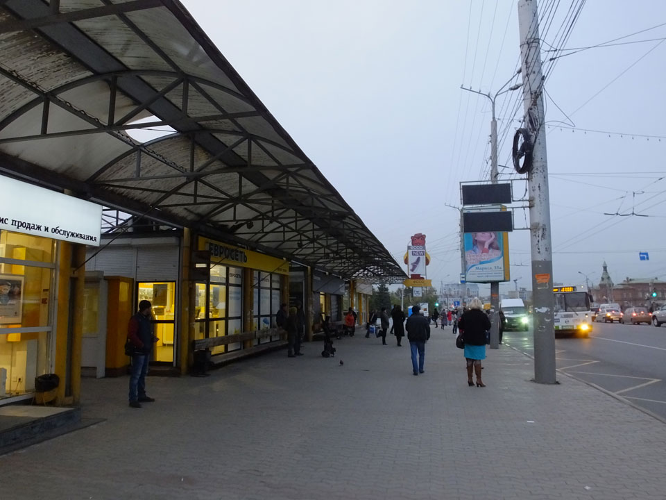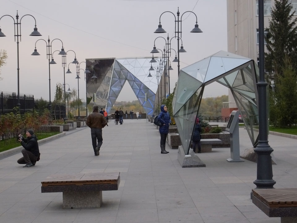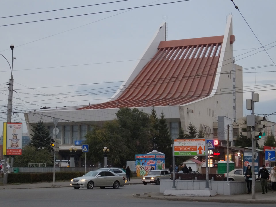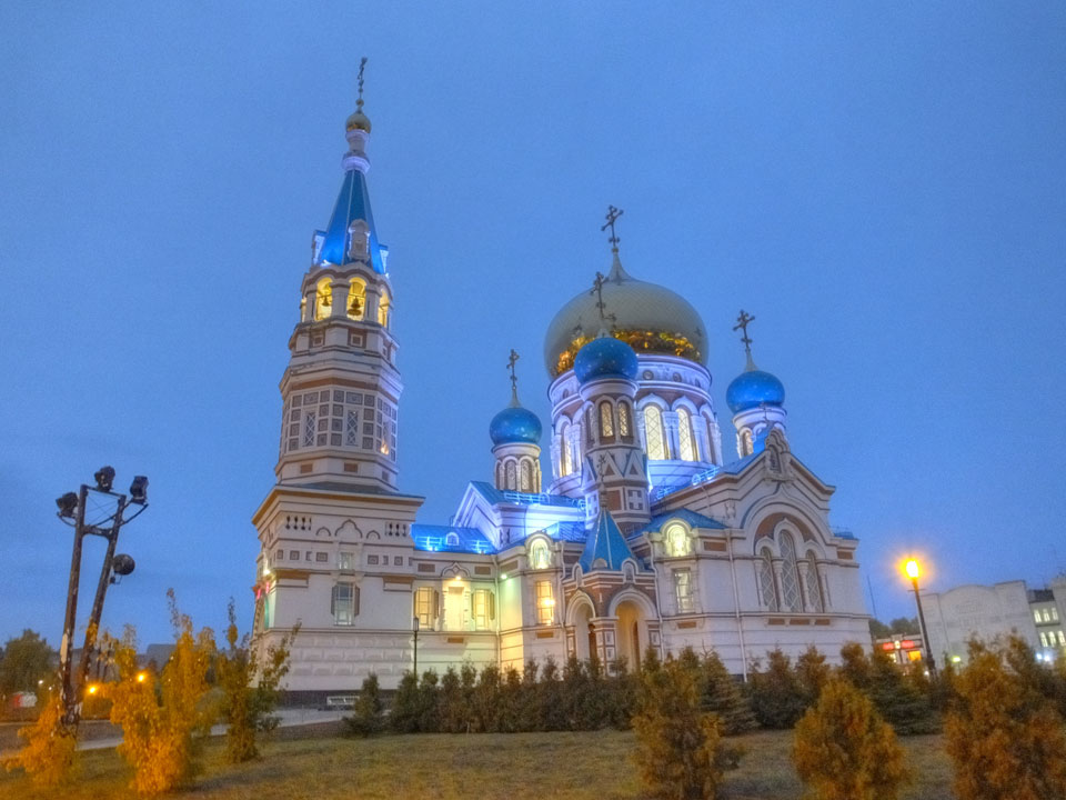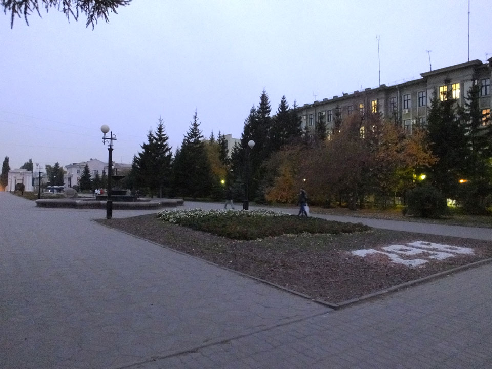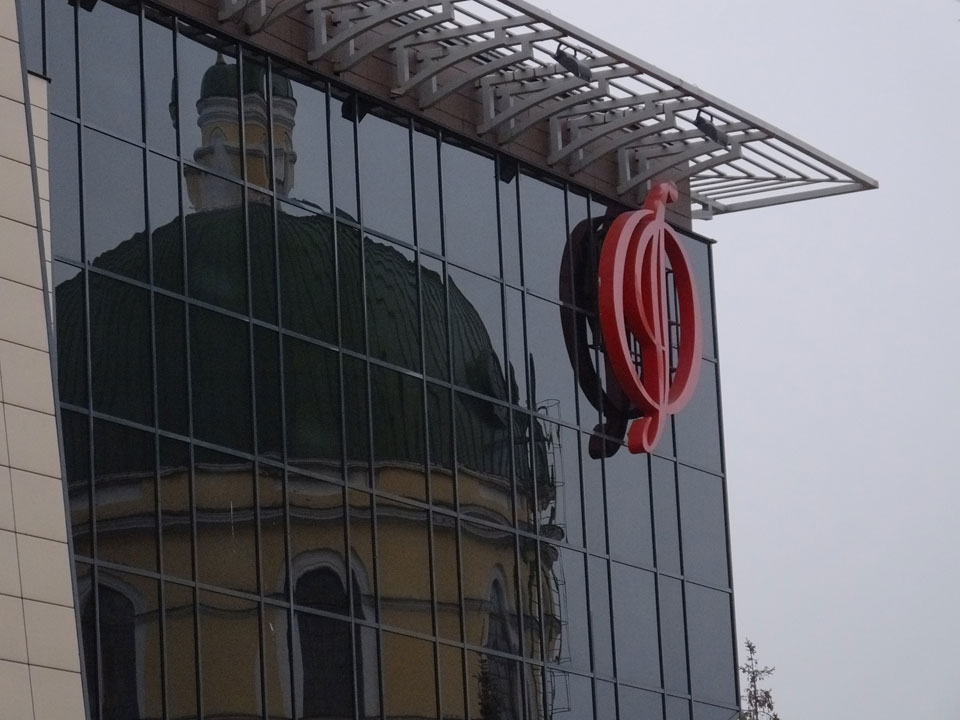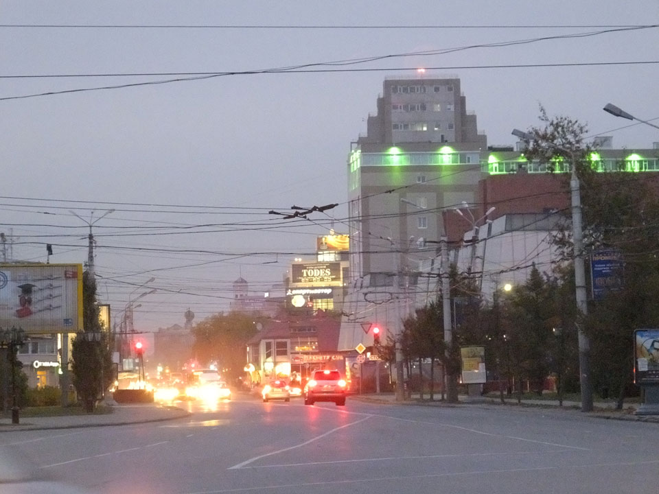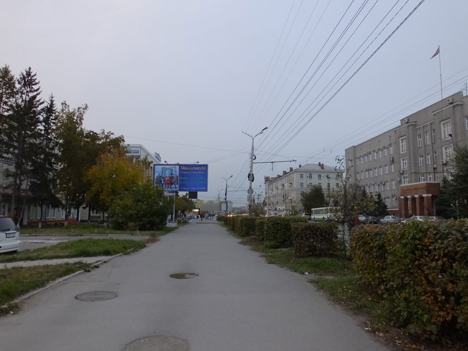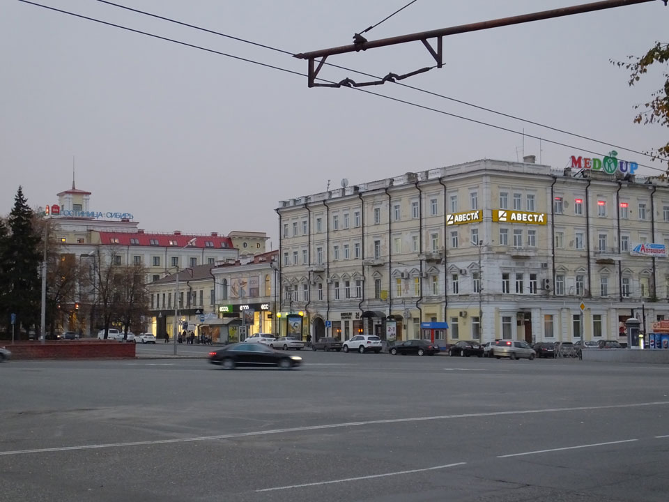 Weiter auf einer Fußgängerzone. Da ein paar Polygon-Strukturen und Museen. Ich wanderte weiter zur Shopping-Gegend über den Fluss. Da war Omsk überraschend teuer. Ein paar Leute können sich die Westklamotten eben überall leisten. Es wurde inzwischen dunkel und so fand ich auch noch eine Kirche, die ganz nett aussah. Ich habe somit in den reichlich 3 Stunden das meiste von Omsk gesehen.