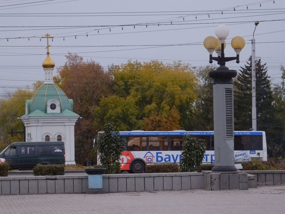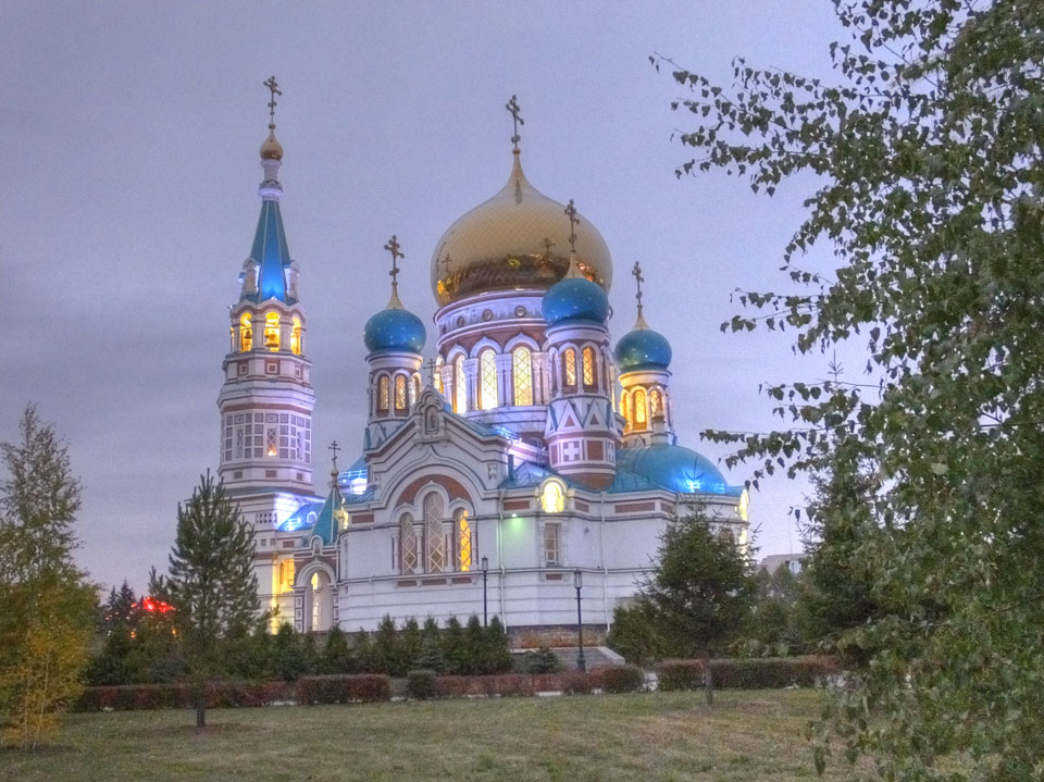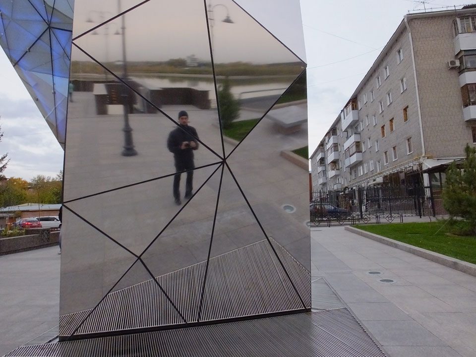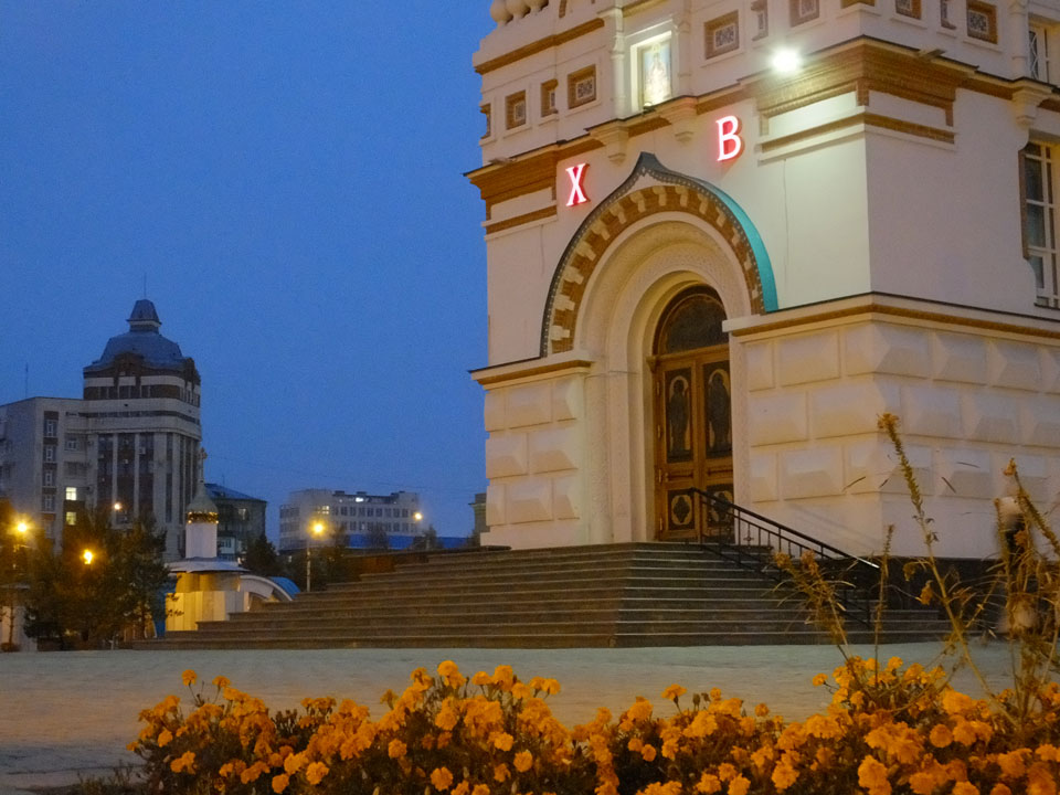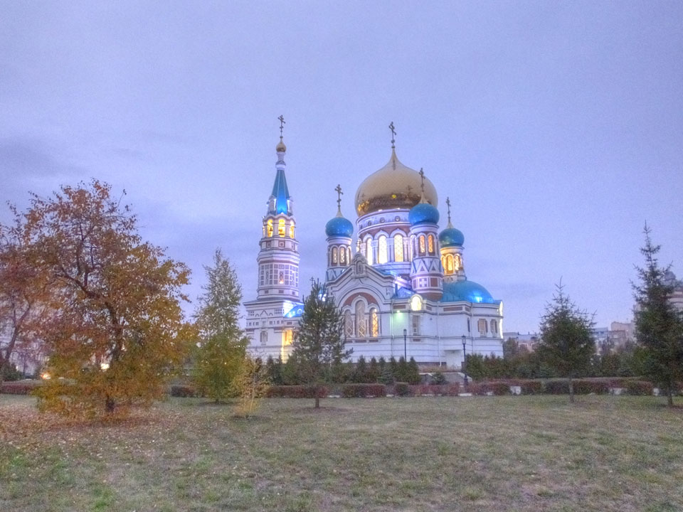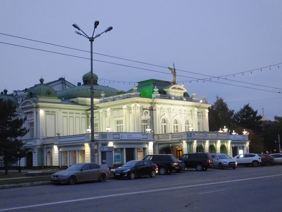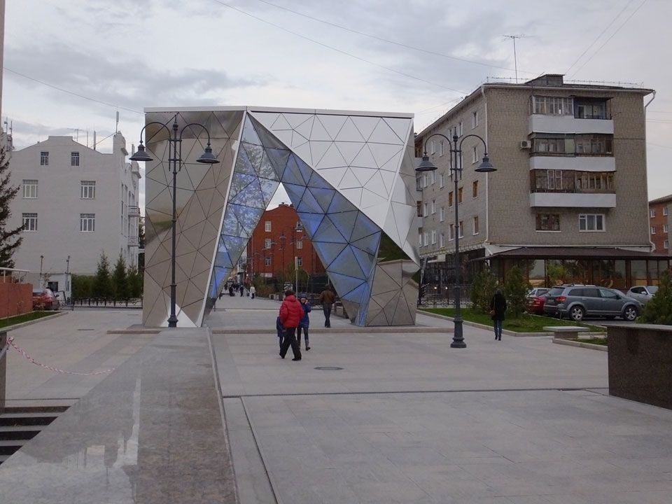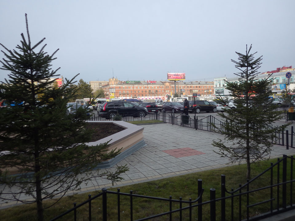 Weiter auf einer Fußgängerzone. Da ein paar Polygon-Strukturen und Museen. Ich wanderte weiter zur Shopping-Gegend über den Fluss. Da war Omsk überraschend teuer. Ein paar Leute können sich die Westklamotten eben überall leisten. Es wurde inzwischen dunkel und so fand ich auch noch eine Kirche, die ganz nett aussah. Ich habe somit in den reichlich 3 Stunden das meiste von Omsk gesehen.