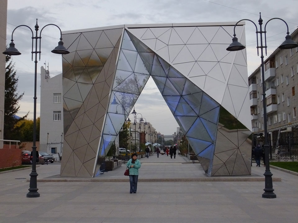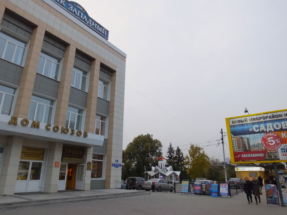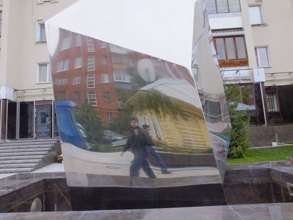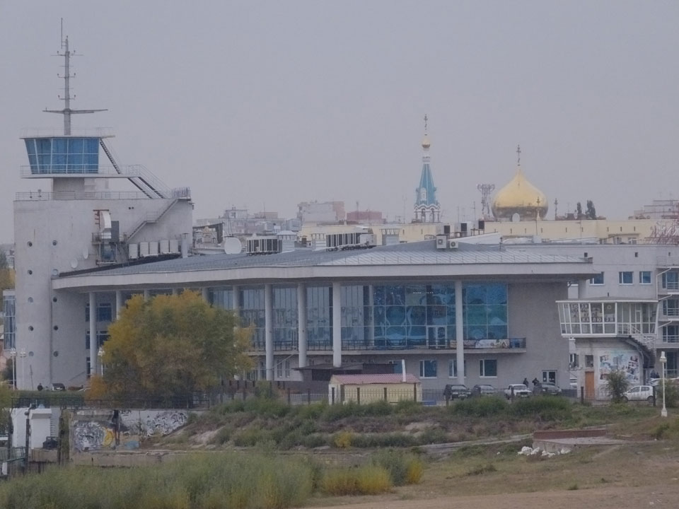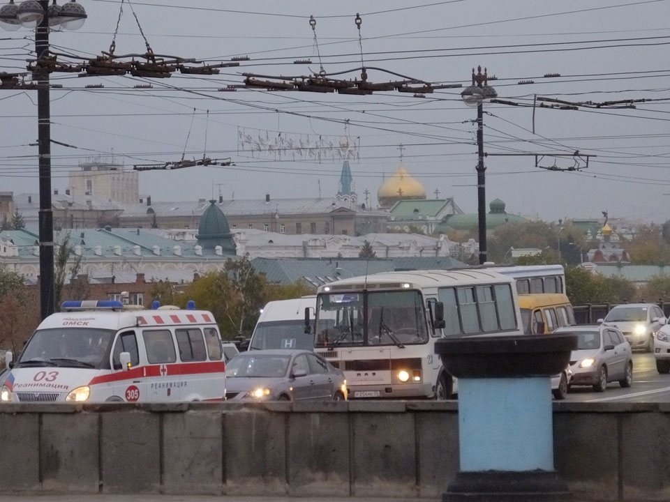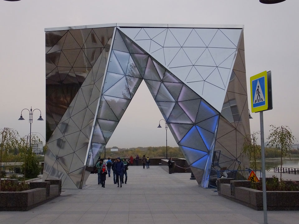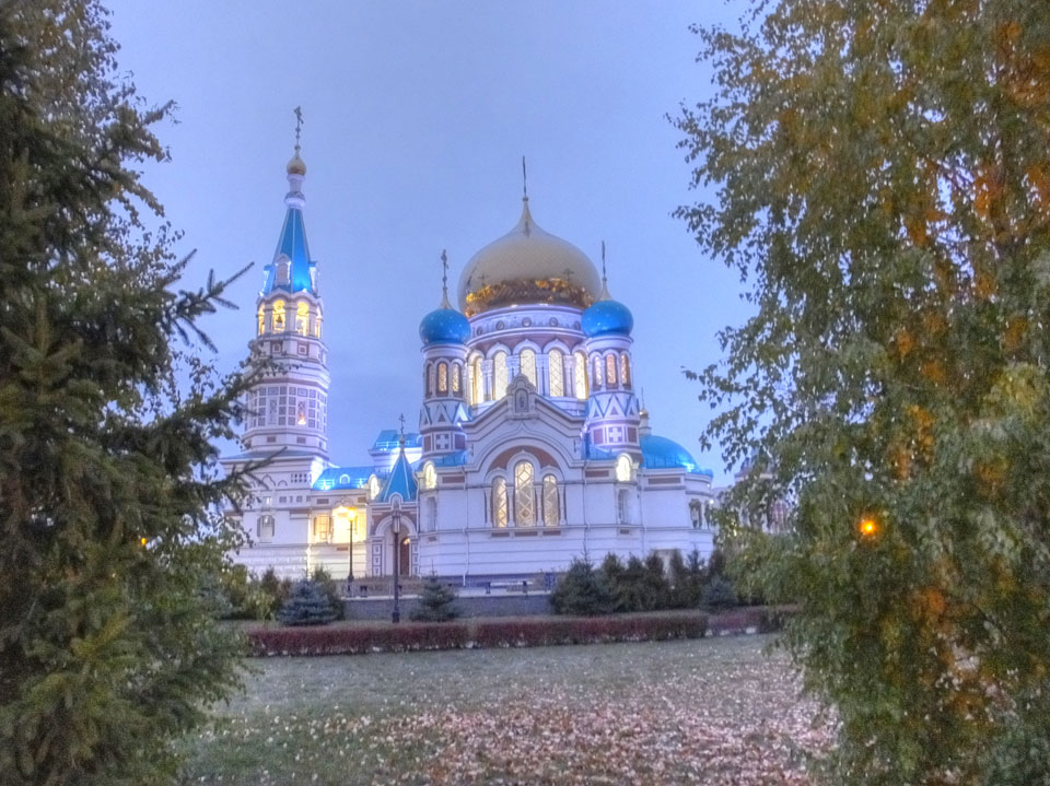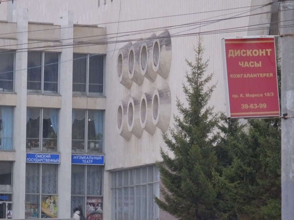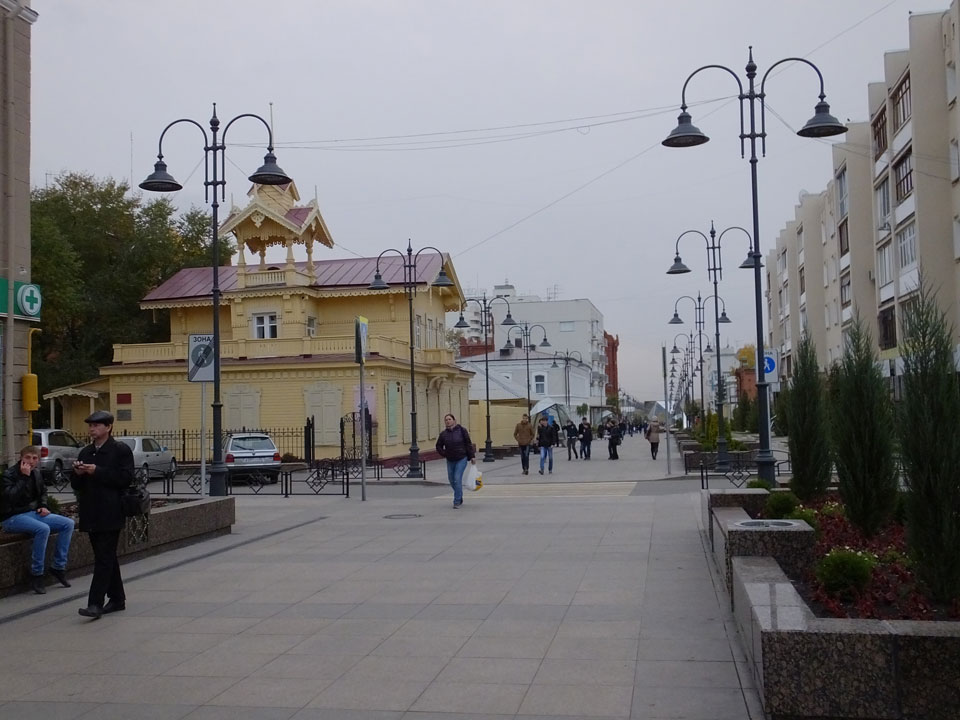 Weiter auf einer Fußgängerzone. Da ein paar Polygon-Strukturen und Museen. Ich wanderte weiter zur Shopping-Gegend über den Fluss. Da war Omsk überraschend teuer. Ein paar Leute können sich die Westklamotten eben überall leisten. Es wurde inzwischen dunkel und so fand ich auch noch eine Kirche, die ganz nett aussah. Ich habe somit in den reichlich 3 Stunden das meiste von Omsk gesehen.
