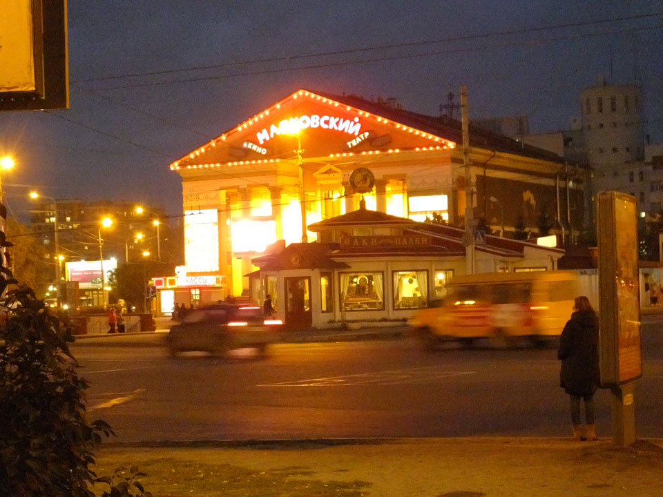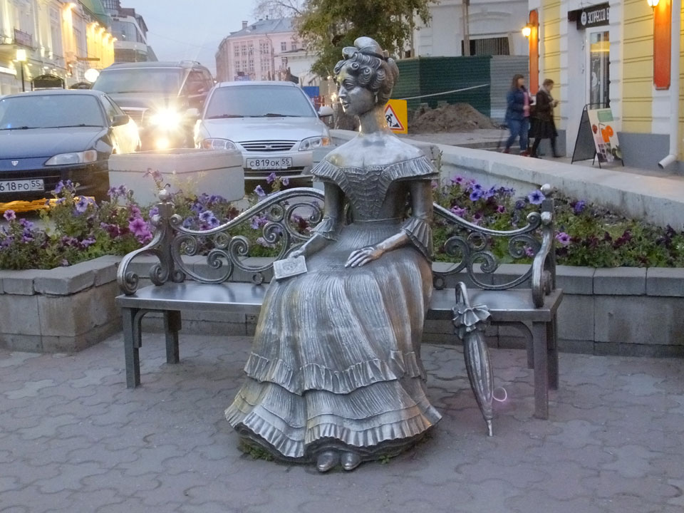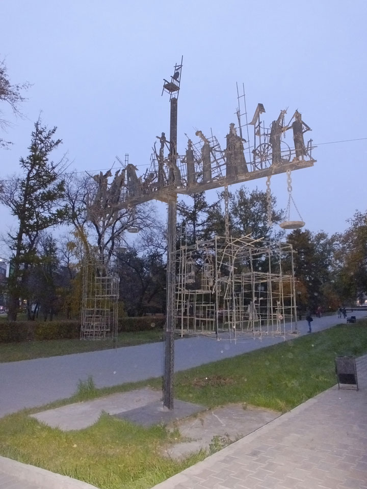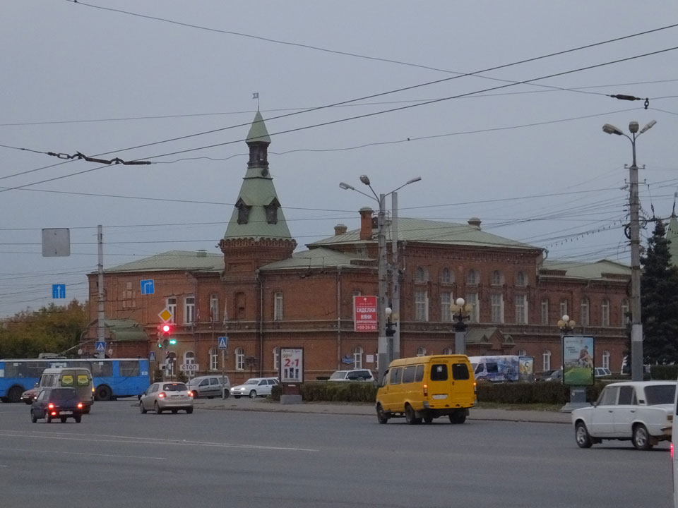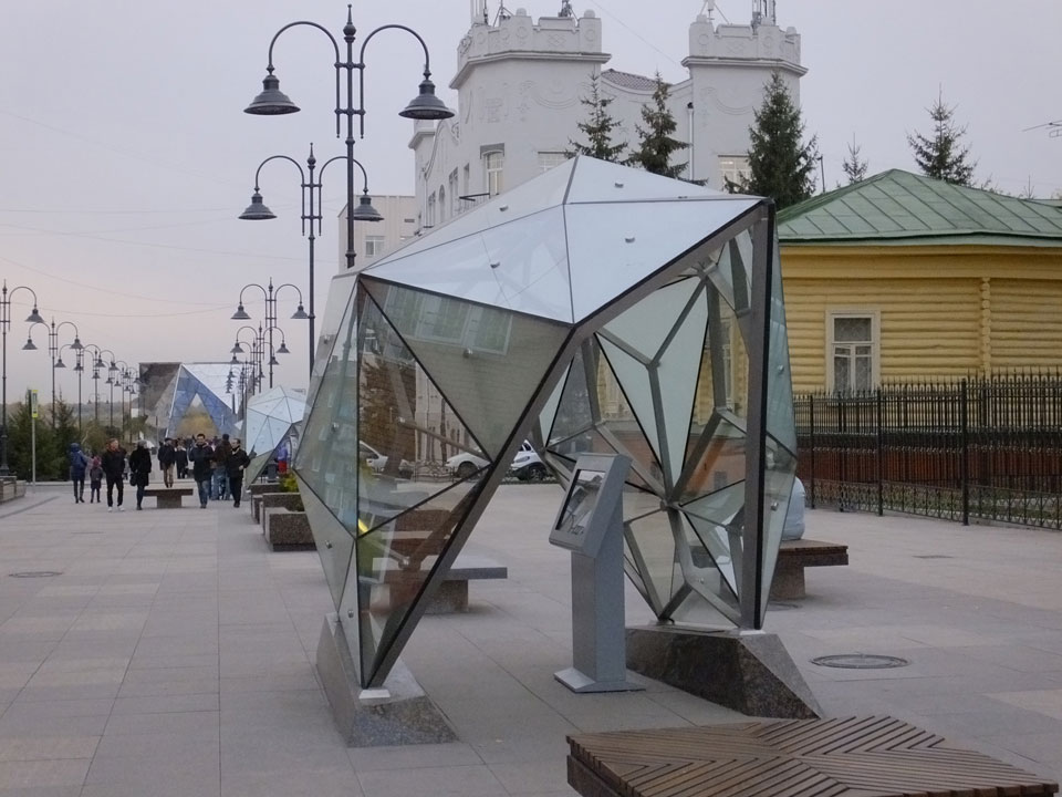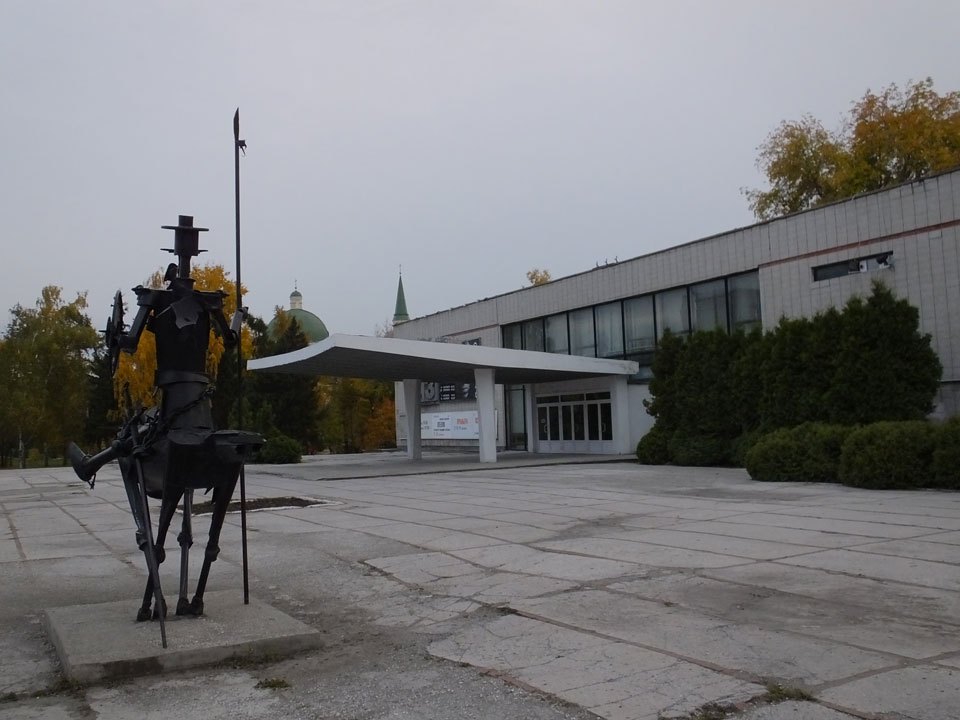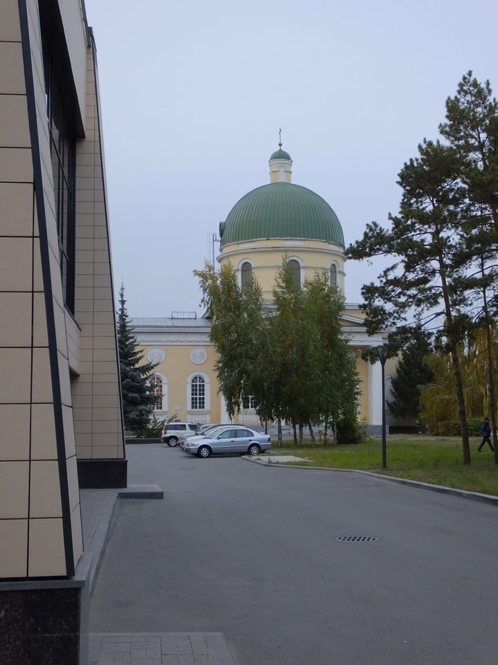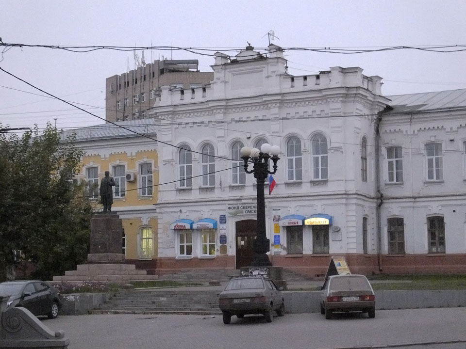 Weiter auf einer Fußgängerzone. Da ein paar Polygon-Strukturen und Museen. Ich wanderte weiter zur Shopping-Gegend über den Fluss. Da war Omsk überraschend teuer. Ein paar Leute können sich die Westklamotten eben überall leisten. Es wurde inzwischen dunkel und so fand ich auch noch eine Kirche, die ganz nett aussah. Ich habe somit in den reichlich 3 Stunden das meiste von Omsk gesehen.
