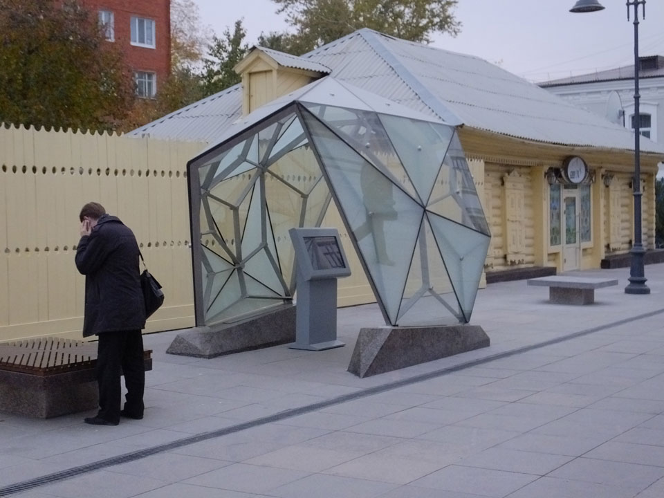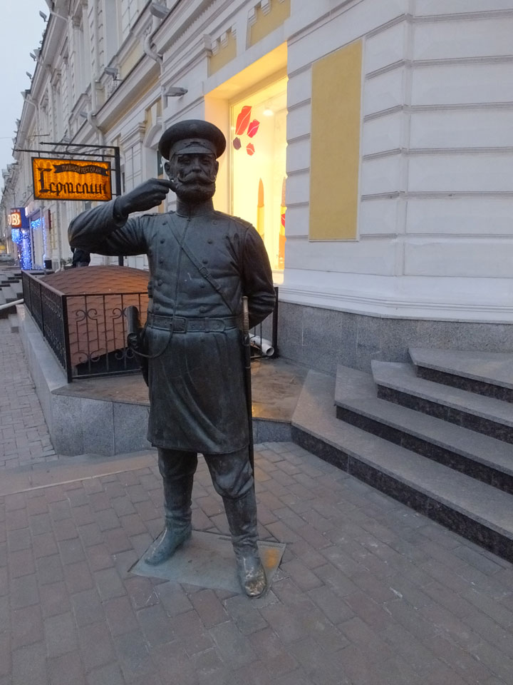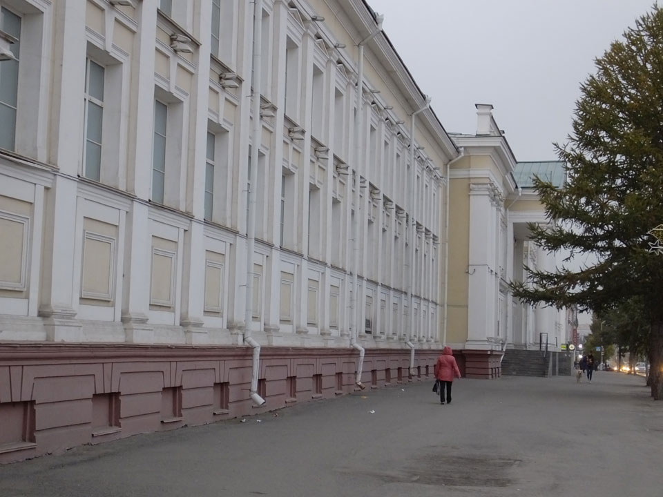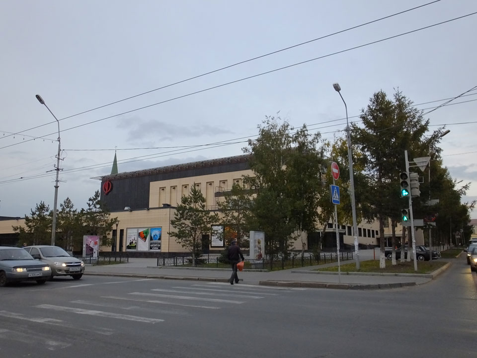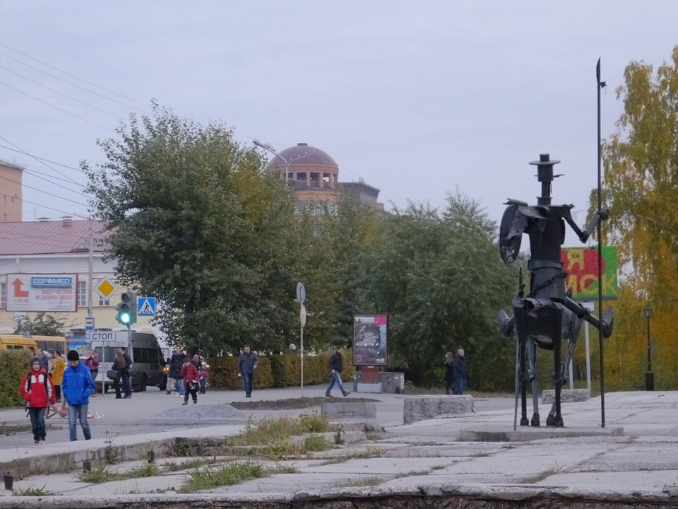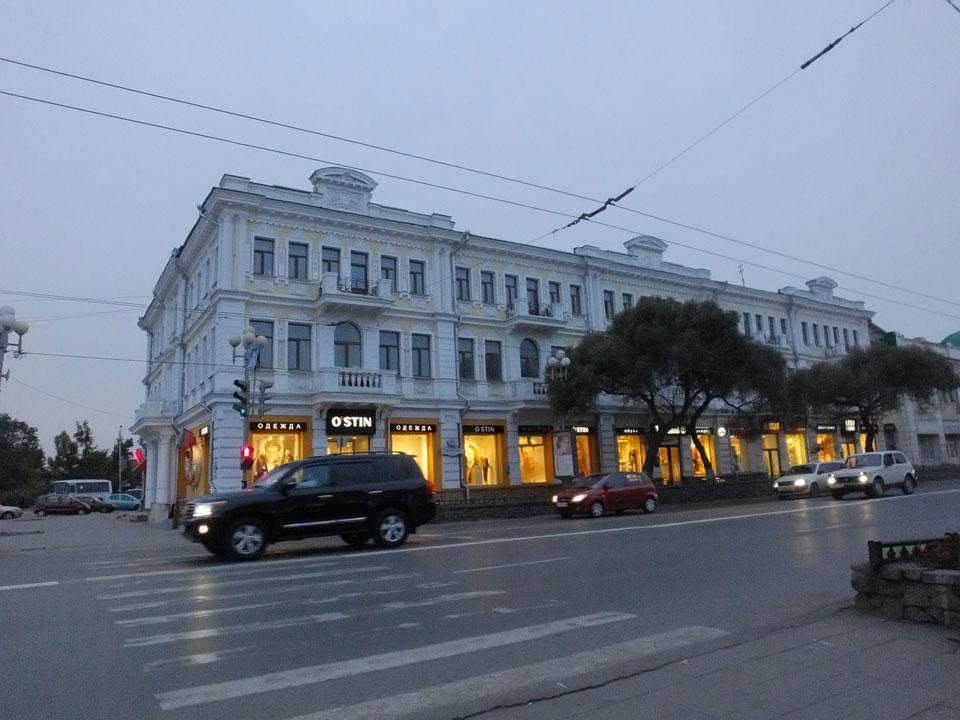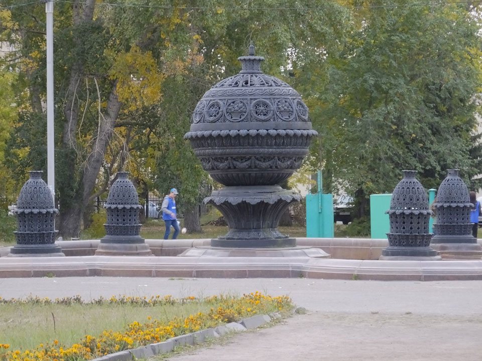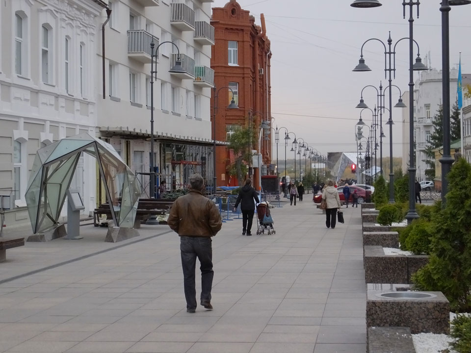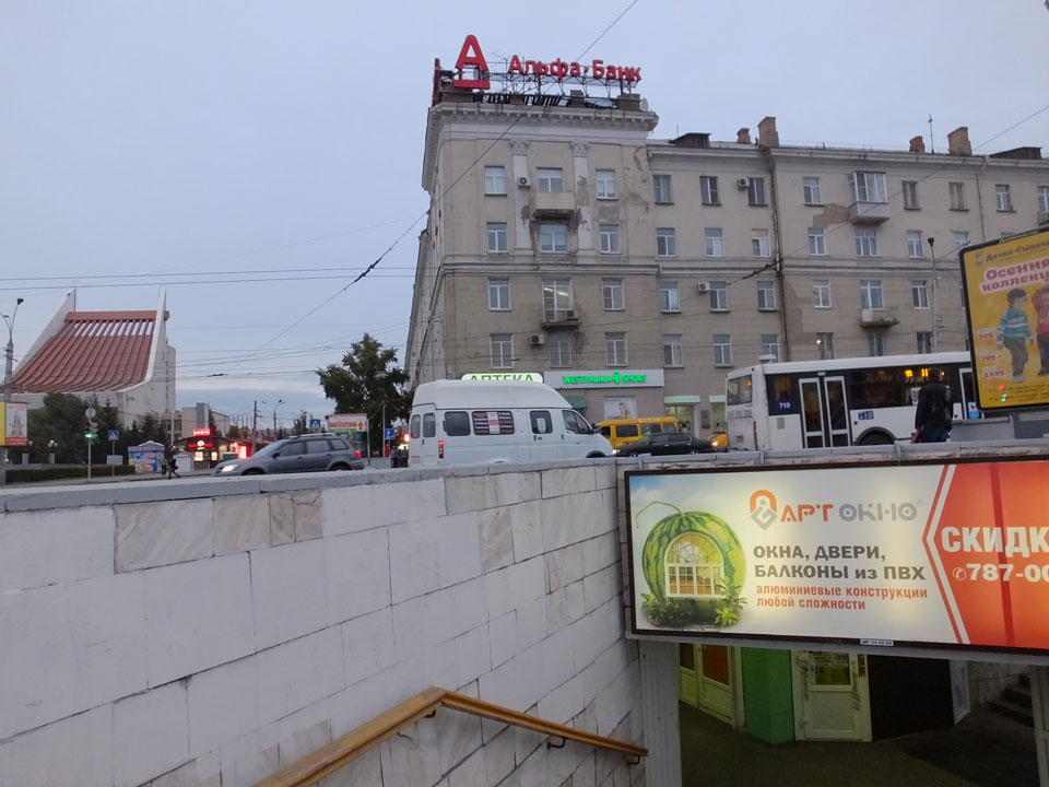 Weiter auf einer Fußgängerzone. Da ein paar Polygon-Strukturen und Museen. Ich wanderte weiter zur Shopping-Gegend über den Fluss. Da war Omsk überraschend teuer. Ein paar Leute können sich die Westklamotten eben überall leisten. Es wurde inzwischen dunkel und so fand ich auch noch eine Kirche, die ganz nett aussah. Ich habe somit in den reichlich 3 Stunden das meiste von Omsk gesehen.