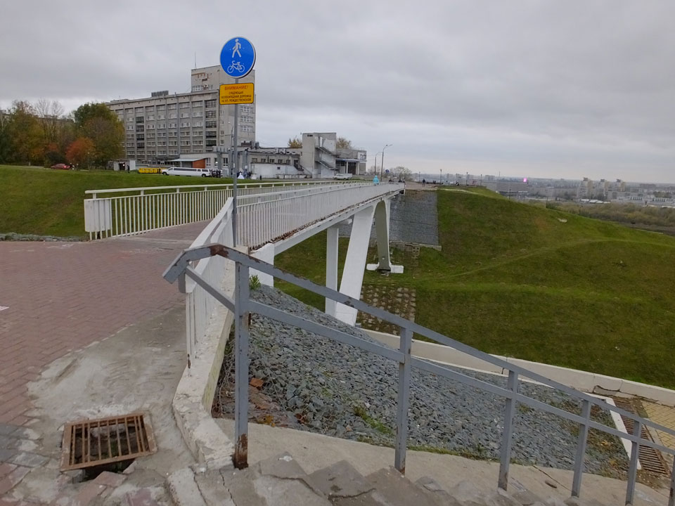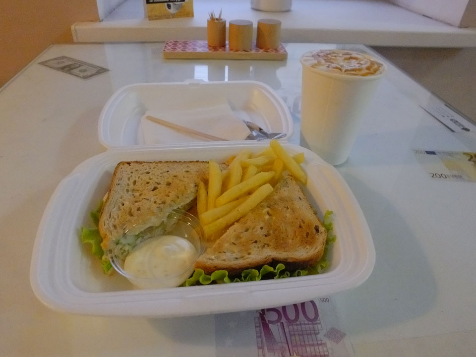 Am Wasser lang hoch über Brücken, an einem Kloster vorbei und immer weiter durch die Straßen. Nischni Novorod gefiel mir gar nicht so richtig. Viele Hügel, viele Hütten. In der Kälte und mit einkehrender Dunkelheit stärkte ich mich im Sandwich Club. Eine Tomatensuppe war auch gut.
