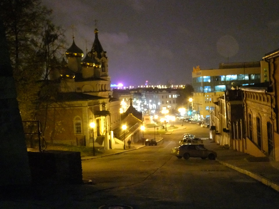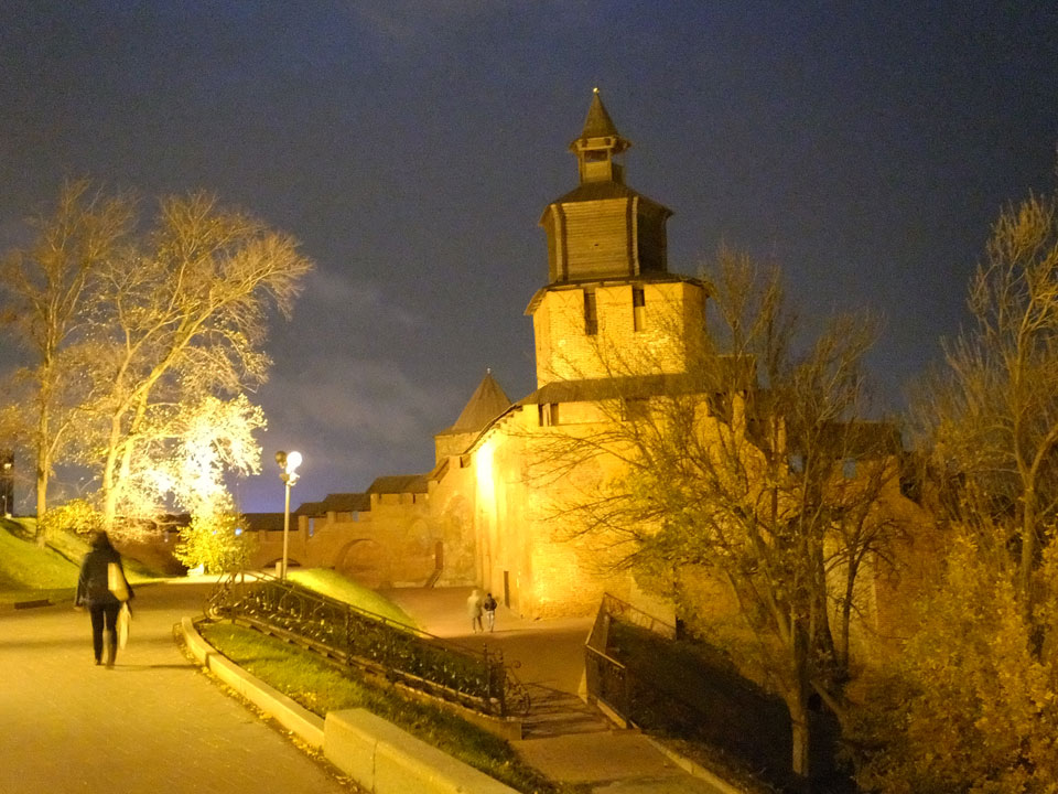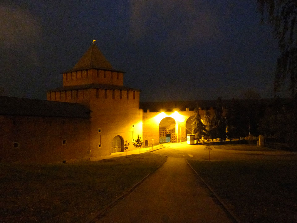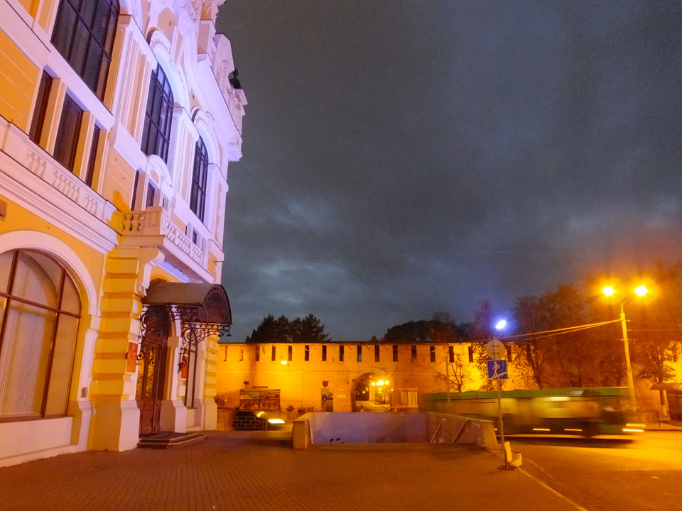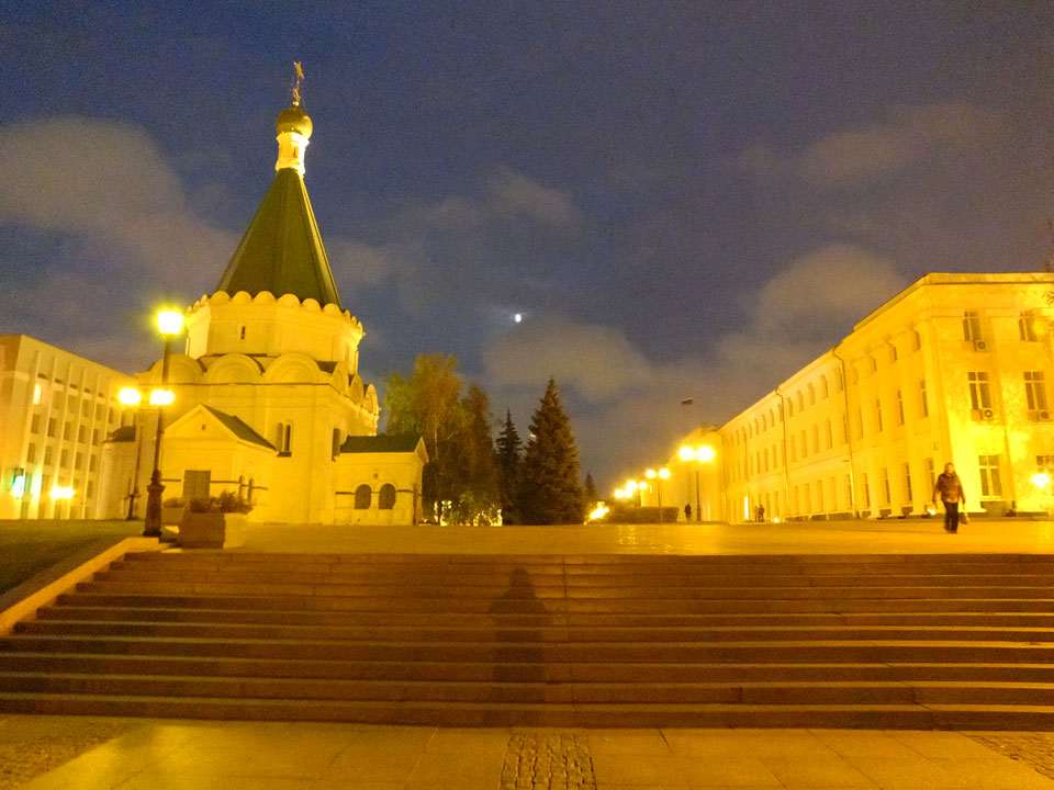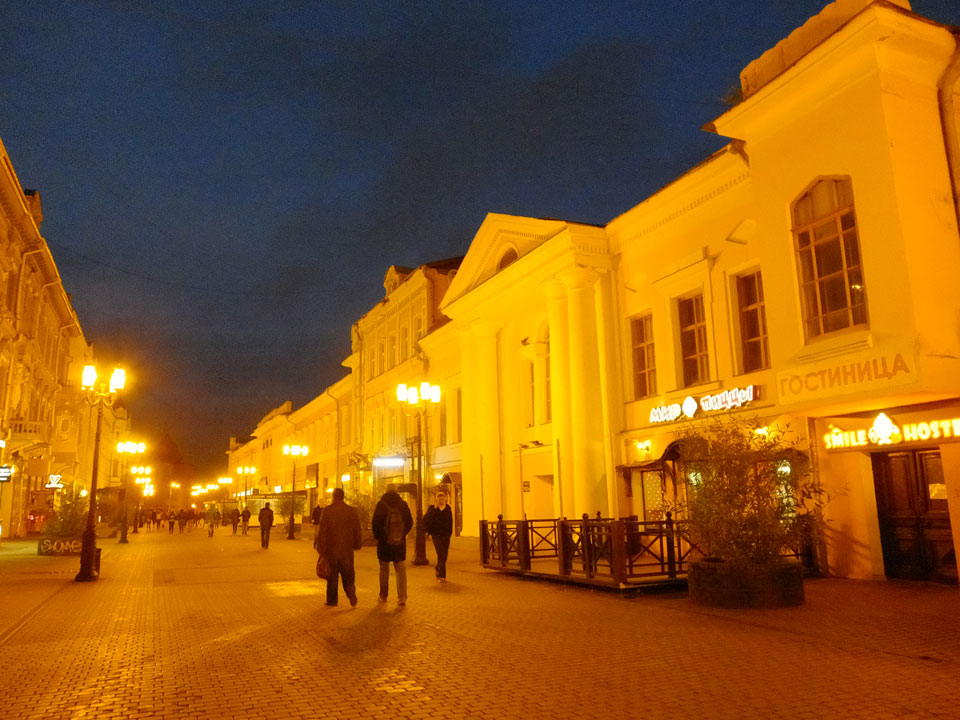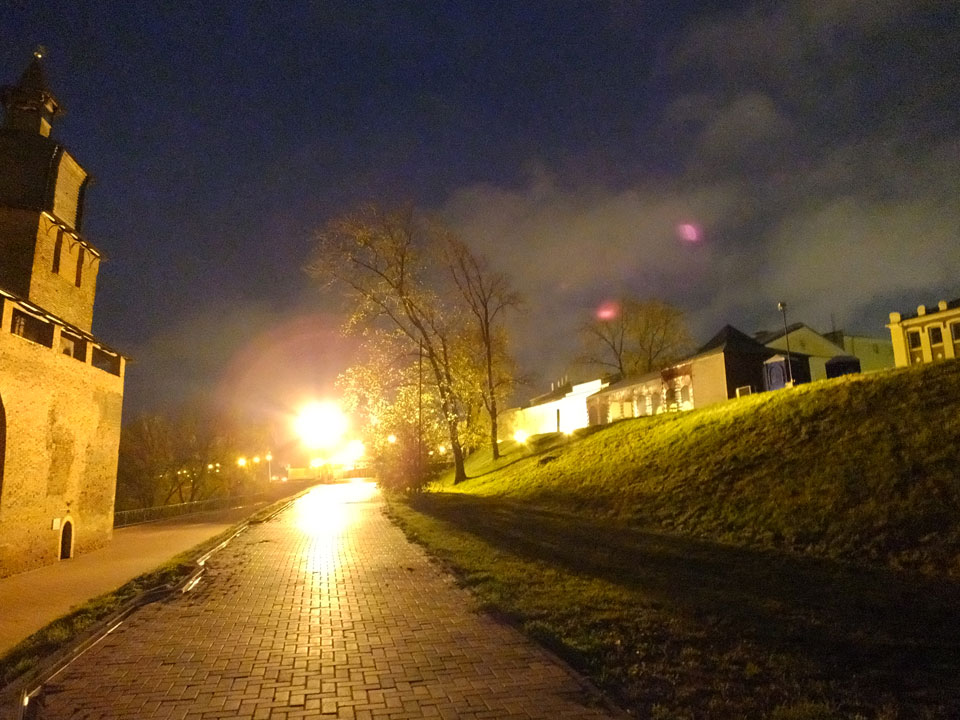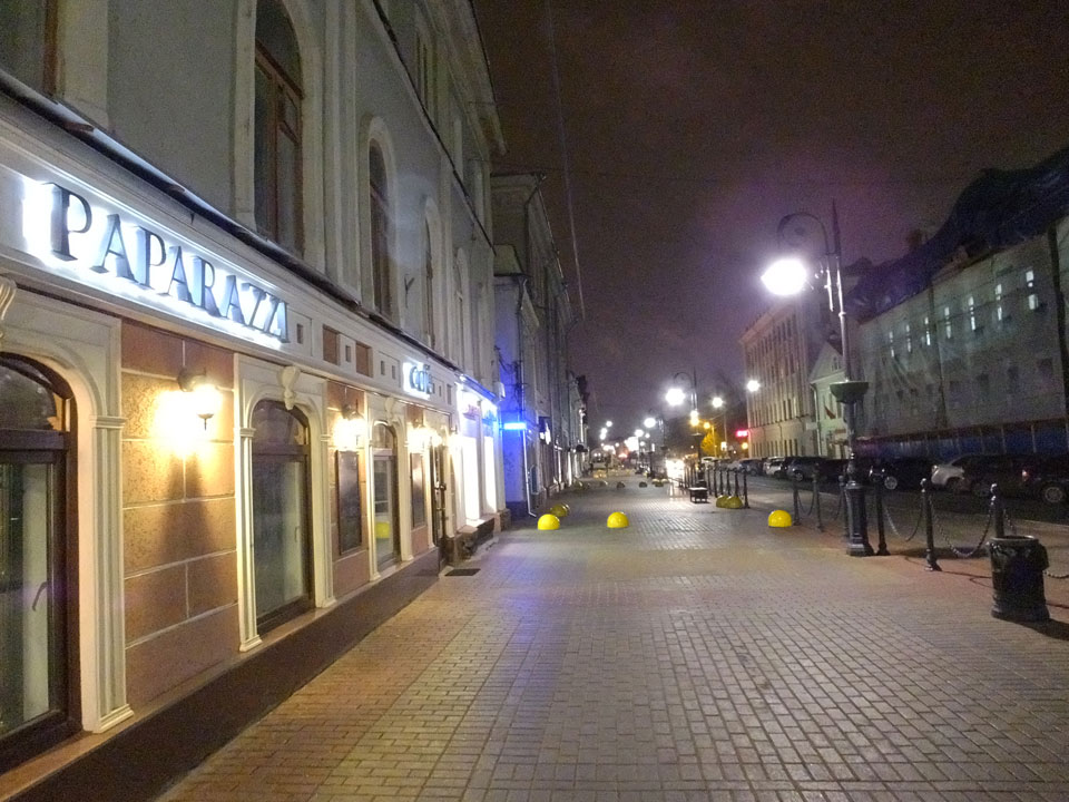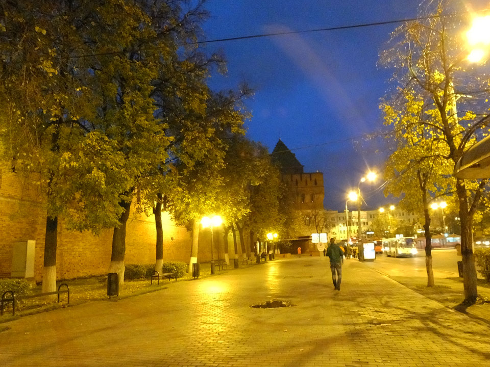 Dann fand ich eine Fußgängerzone, die bis zum Kreml führte. Leider zu dunkel für die Fuji. Zum Kreml kam ich dann auch. Die Burganlage in der Dunkelheit mit nur wenigen Leuten brachte eine eigene Stimmung. Wieder runter Richtung Hostel sah ich dann wie super meine Unterkunft eigentlich liegt.