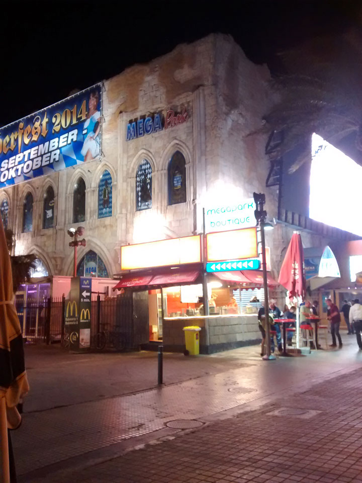 Abendessen wieder wie immer mit Gazpacho, Brot und Wurst. Nachts ging ich mal los, das Nightlife checken. Ich blieb bei der Megarena hängen. Für €10 Eintritt mit 2 Getränken. Man nahm mir aber gleich beide Gutscheine ab für den €7 Bacardie-Cola, weil eben über €6. Schöner Mist und auch ein mickriger Drink. Naja, war aus so eine dumme Disco.