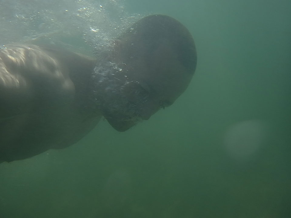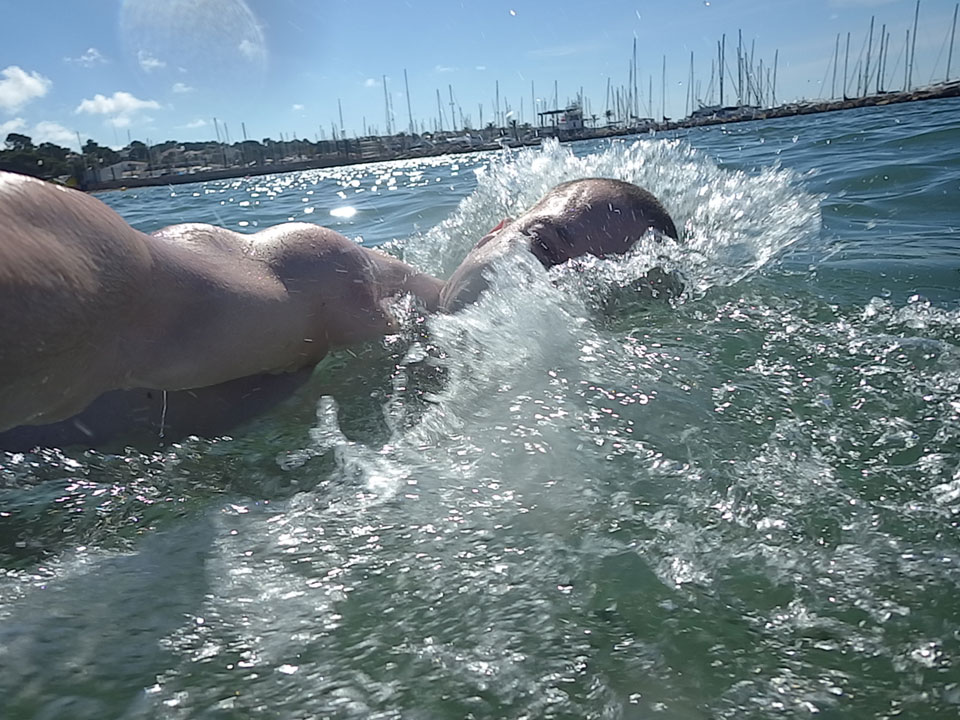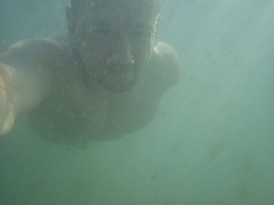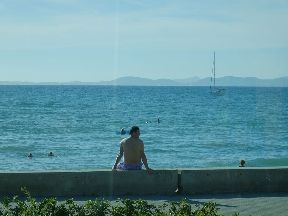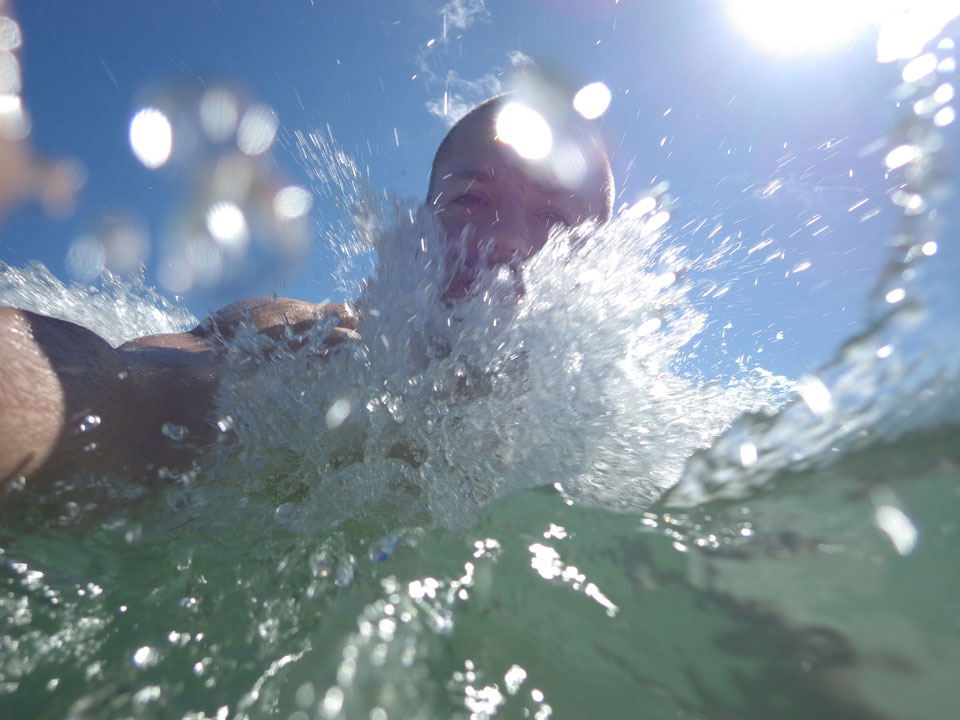 Mit Sonnenmilch und schließlich auch T-Shirt saß ich da, immer gern mit Oshos Weisheiten. Heute musste ich zuerst aufpassen, dass ich mir keinen Sonnenbrand holte. Es liefen ein paar warnend rote Rücken herum. Baden ging ich dann auch noch, echt Klasse hier.