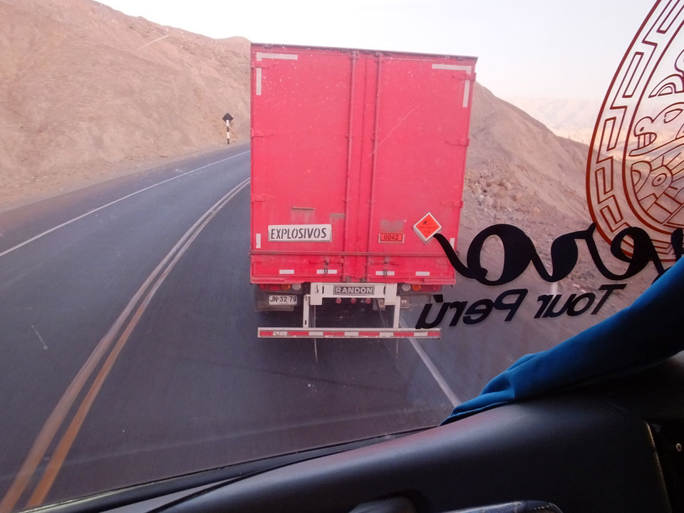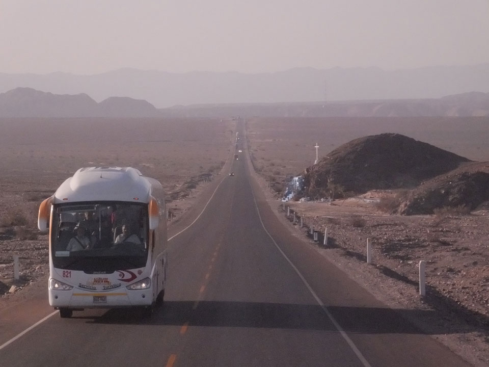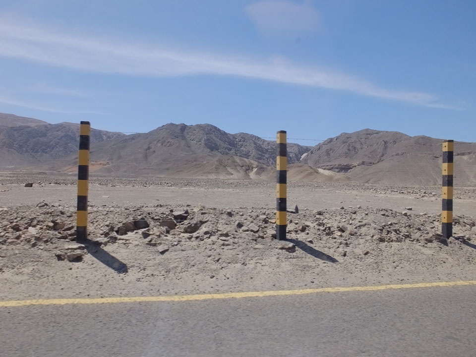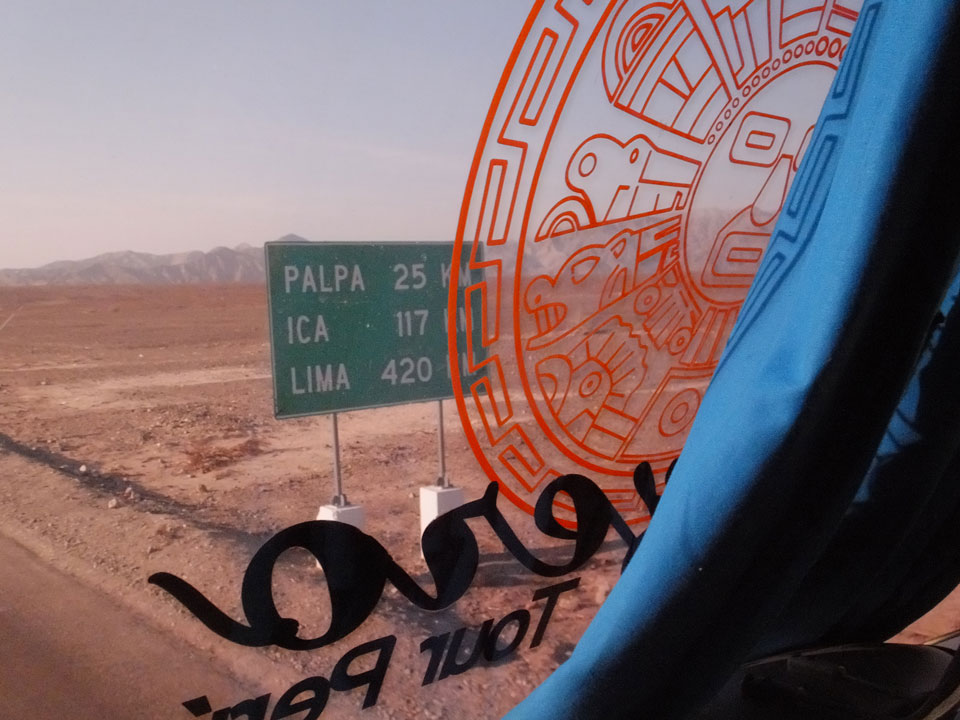 Überpünktlich wurde ich früh abgeholt und in Ica in den Peru Bus verfrachtet. Berüchtigt als Diebesmagnet sagte auch der Schaffner, dass ich meinen Rucksack umarmen sollte. Das tat ich dann auch, schlief dennoch ab und zu mal ein auf der 2 1/2 h Fahrt nach Nazca.