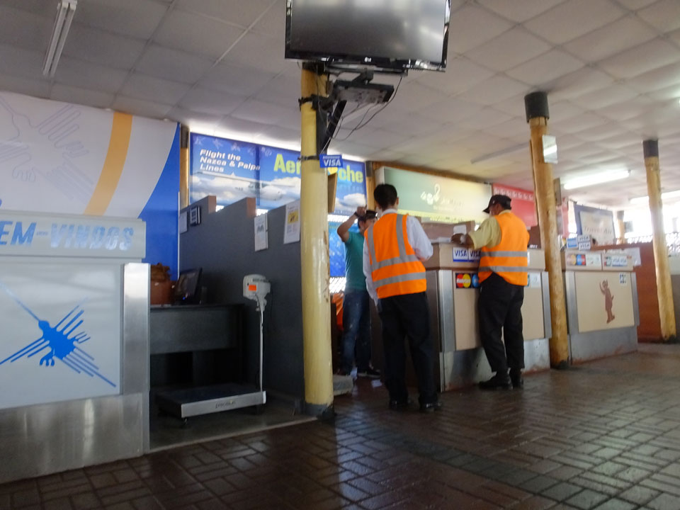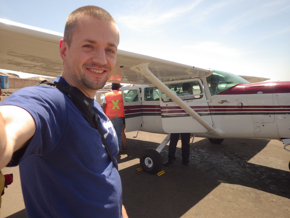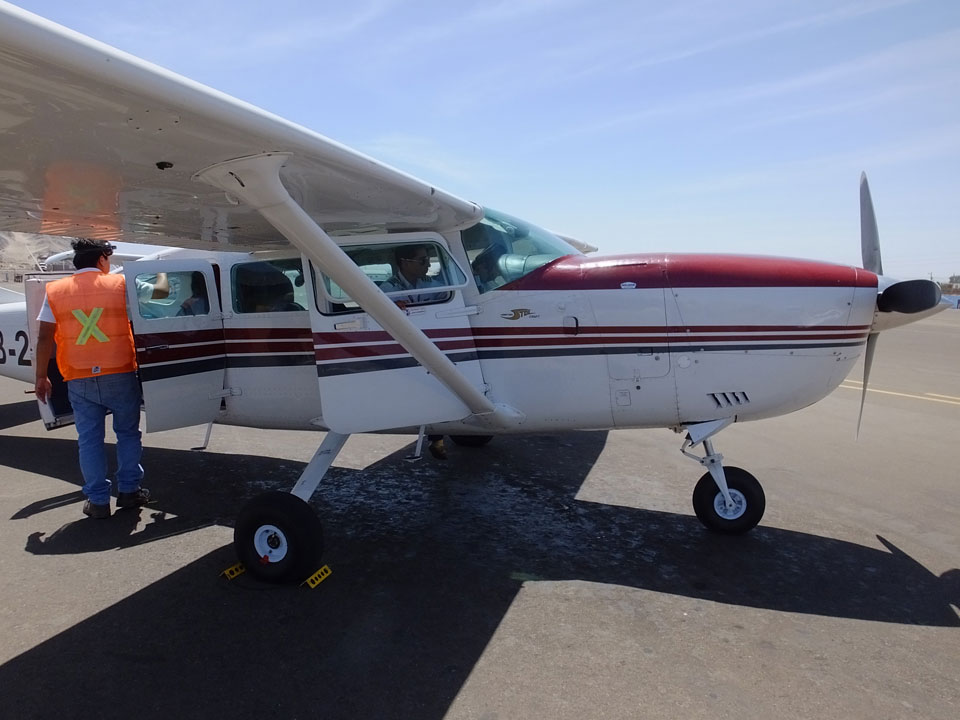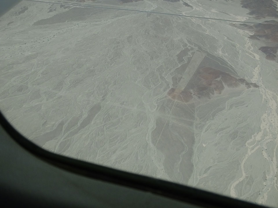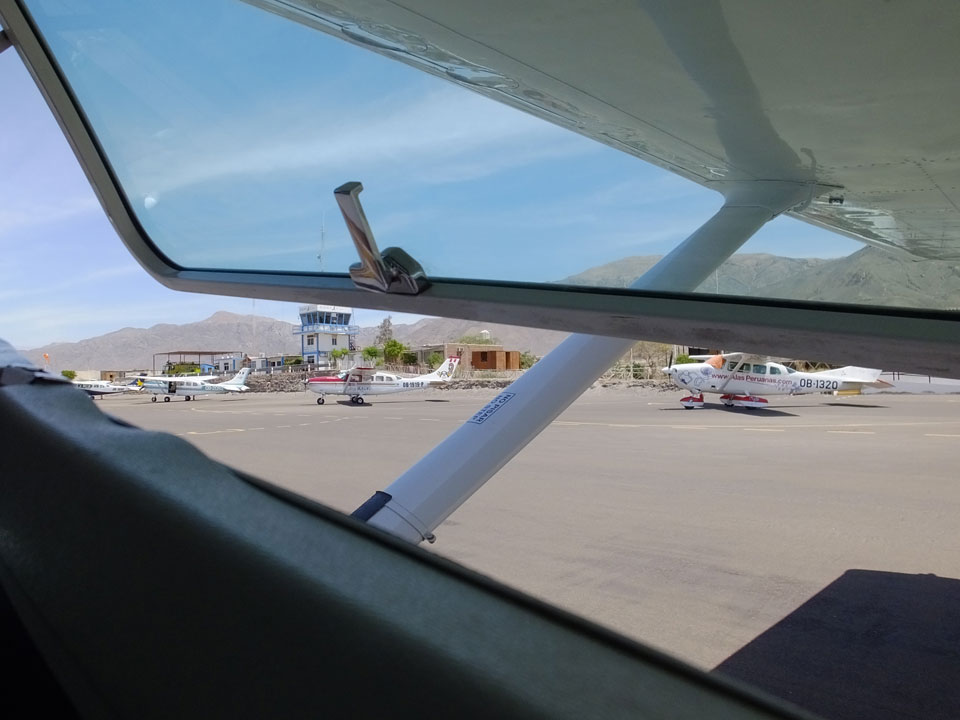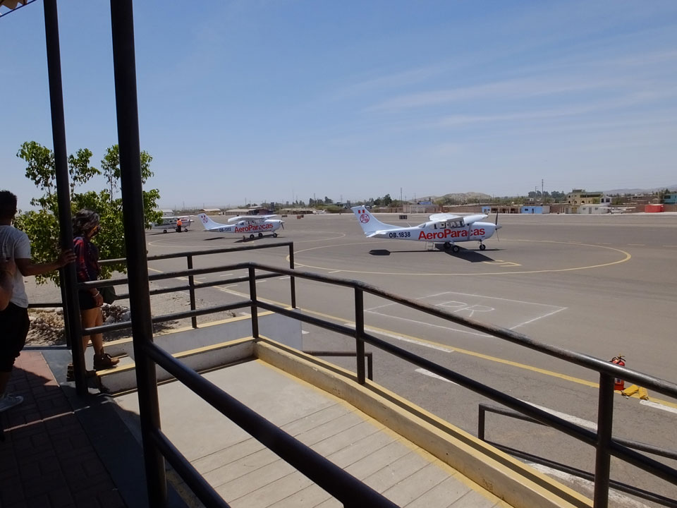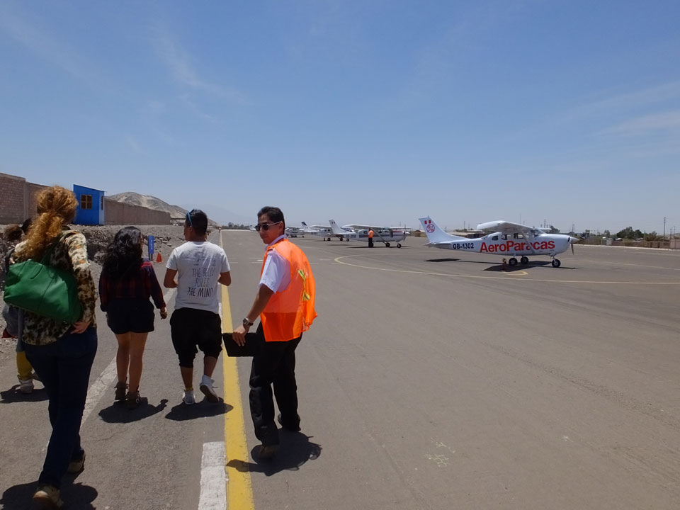 Nazca ist heiß hier in der Wüste. Ein Taxi brachte mich zum Flughafen, wo ich auch schon erwartet wurde. Wiegen und Pass und dann … warten. Ich sollte eigentlich um 11:00 fliegen aber ein paar Leute waren nicht da. Ich wartete eine Ewigkeit bis weit nach 12 bis es endlich los ging. Neben den $70 wurden noch 25 PEN Flughafengebühr fällig. Man kann die Tour sicher auch günstiger machen aber wegen $30-$40 hatte ich doch keine Lust, mich um die ganzen Transports zu kümmern. Ich denke aber, dass man auch da am Flughafen einfach einen Flieger bekommt. Unserer war dennoch komplett voll – 6 Touristen und 2 Piloten.