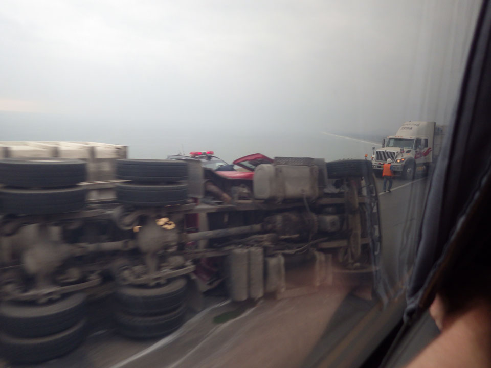 Die Fahrt war OK. Anfang eine Schrecksekunde mit einem LKW kurz vor der Scheibe. Hier an der Frontscheibe hat man die beste Sicht – auch auf das, was eher stresst.