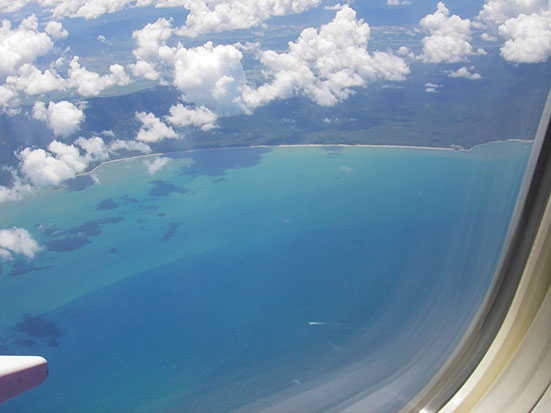 Im Flieger konnte man die wunderschöne Landschaft um Cairns nochmal von der Luft bewundern. Das Reef mit kleinen Inseln sieht fantastisch aus. Beim vielen Gucken rutschte mir ’ne Contact im Auge weg. Kein Chance, die wieder herauszufummeln. Ich kaufte ’nen Kakao und irgendwie waren die 2:50 Flug dann auch vorüber.