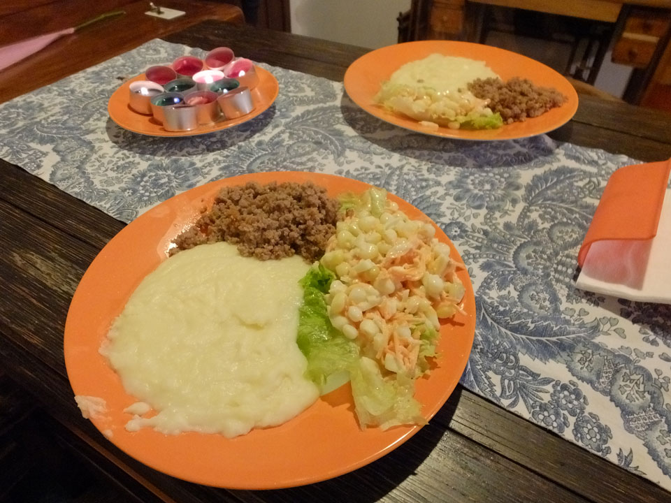 Das Abendessen war auch gut – Reste von Fleisch, Kartoffelbrei und Salat.