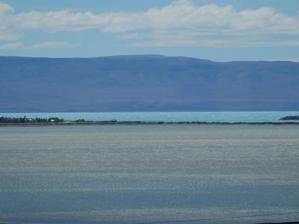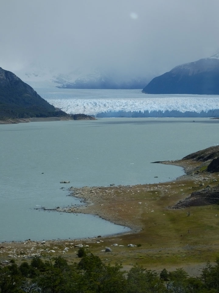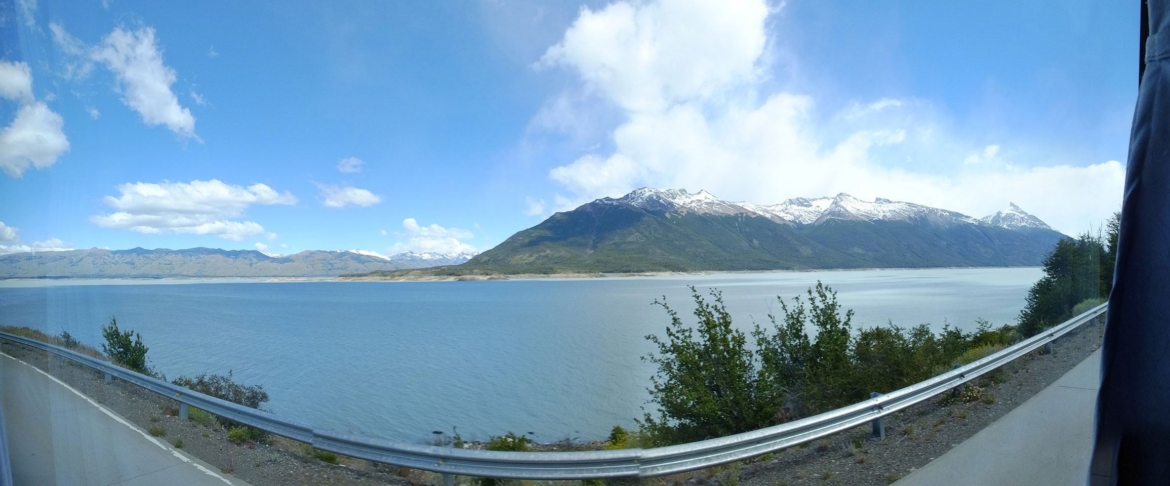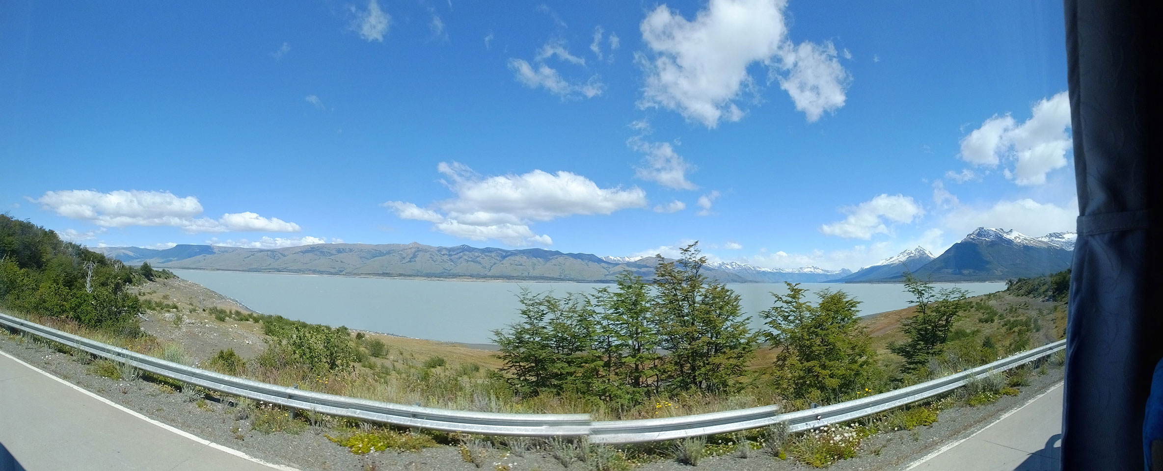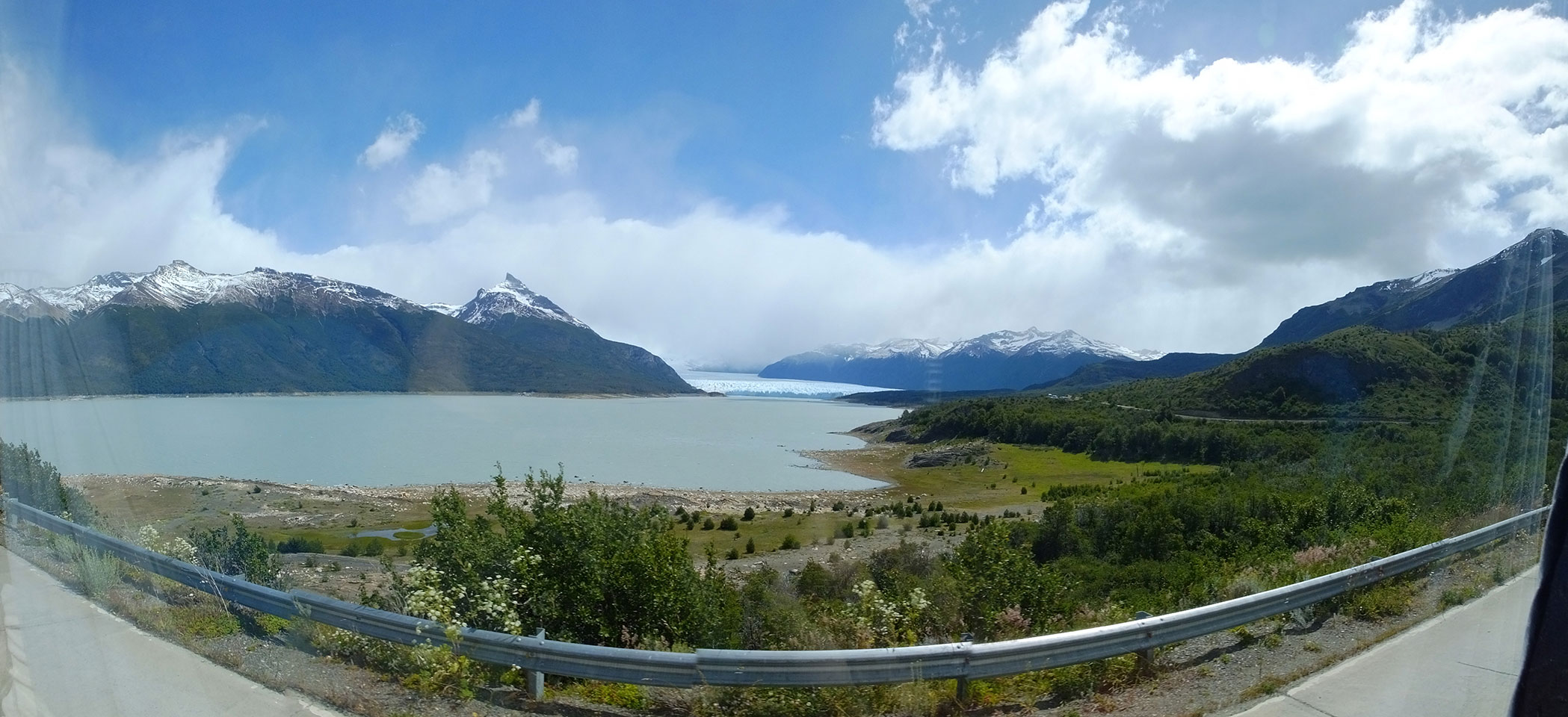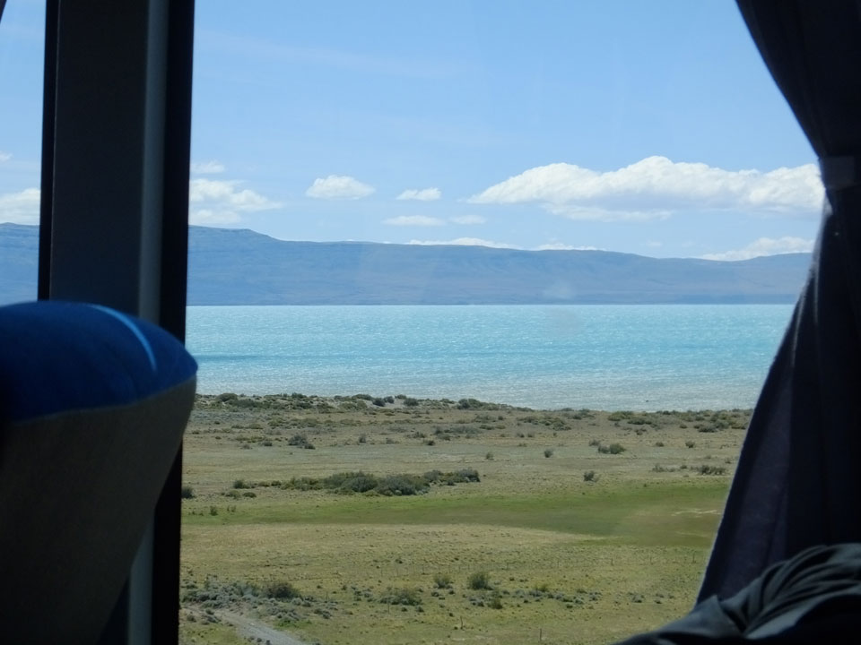 Dann 13:30 war das alles irgendwie geklärt und ich schwang mich runter zum Busbahnhof für den Start zum Perito Moreno Ausflug. Viele Israelis und Franzosen, ein Platz auf der linken Seite, wie empfohlen. Entlang am Lago Argentino ging’s zum Gletscher-Park. Da auch nochmal 215 ARS Eintritt. Wie gesagt: 1 zu 10 zum EUR nach offiziellem Kurs – ich bekomme hier nur 1 zu 11 zum Dollar aber das macht alles eben um die 30% günstiger.