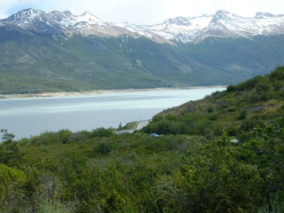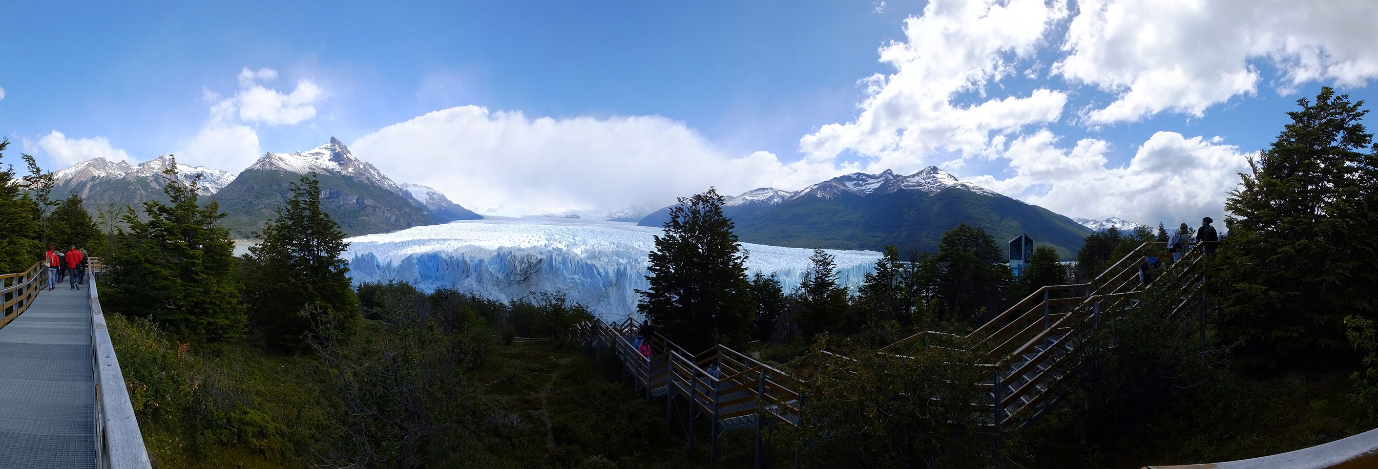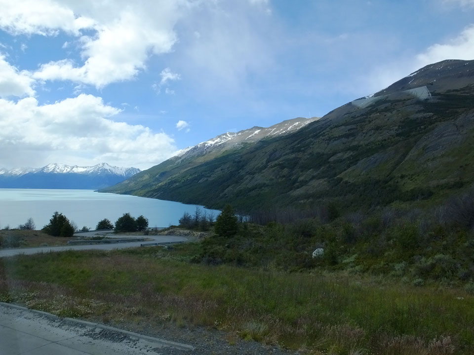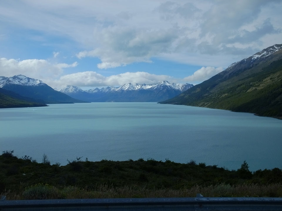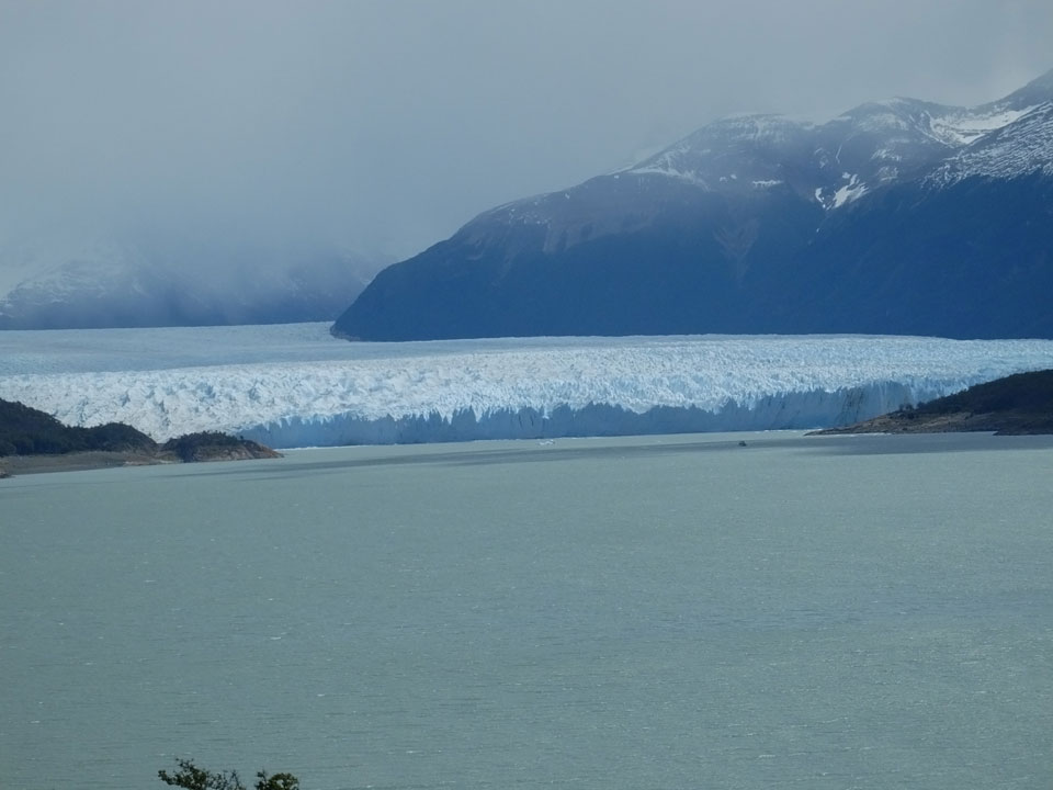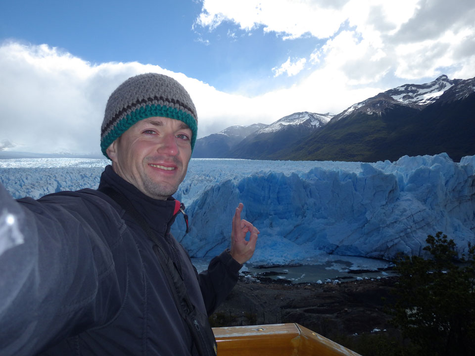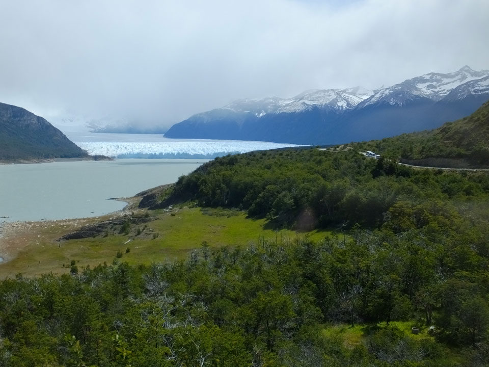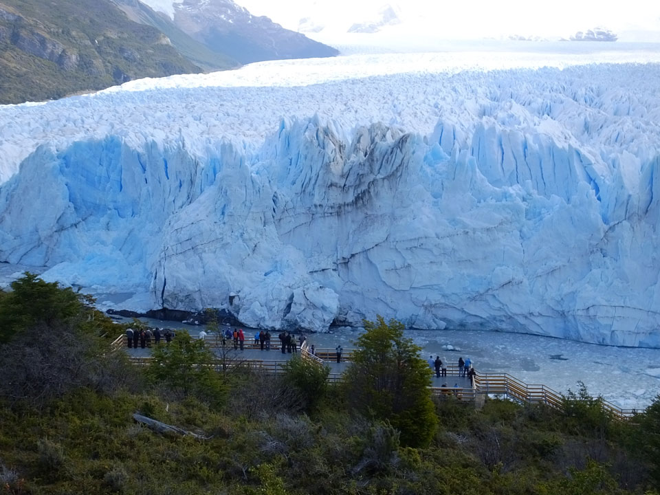 Dann 13:30 war das alles irgendwie geklärt und ich schwang mich runter zum Busbahnhof für den Start zum Perito Moreno Ausflug. Viele Israelis und Franzosen, ein Platz auf der linken Seite, wie empfohlen. Entlang am Lago Argentino ging’s zum Gletscher-Park. Da auch nochmal 215 ARS Eintritt. Wie gesagt: 1 zu 10 zum EUR nach offiziellem Kurs – ich bekomme hier nur 1 zu 11 zum Dollar aber das macht alles eben um die 30% günstiger.