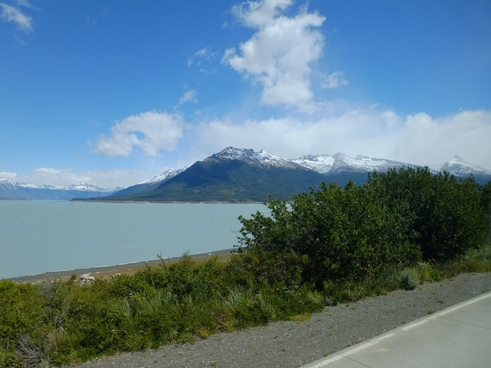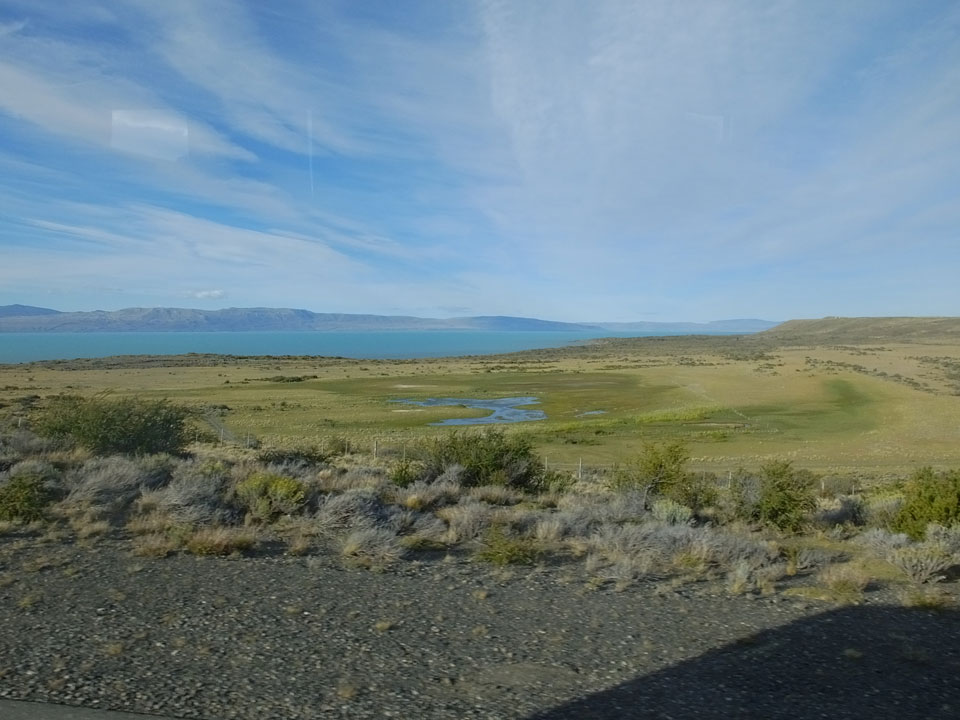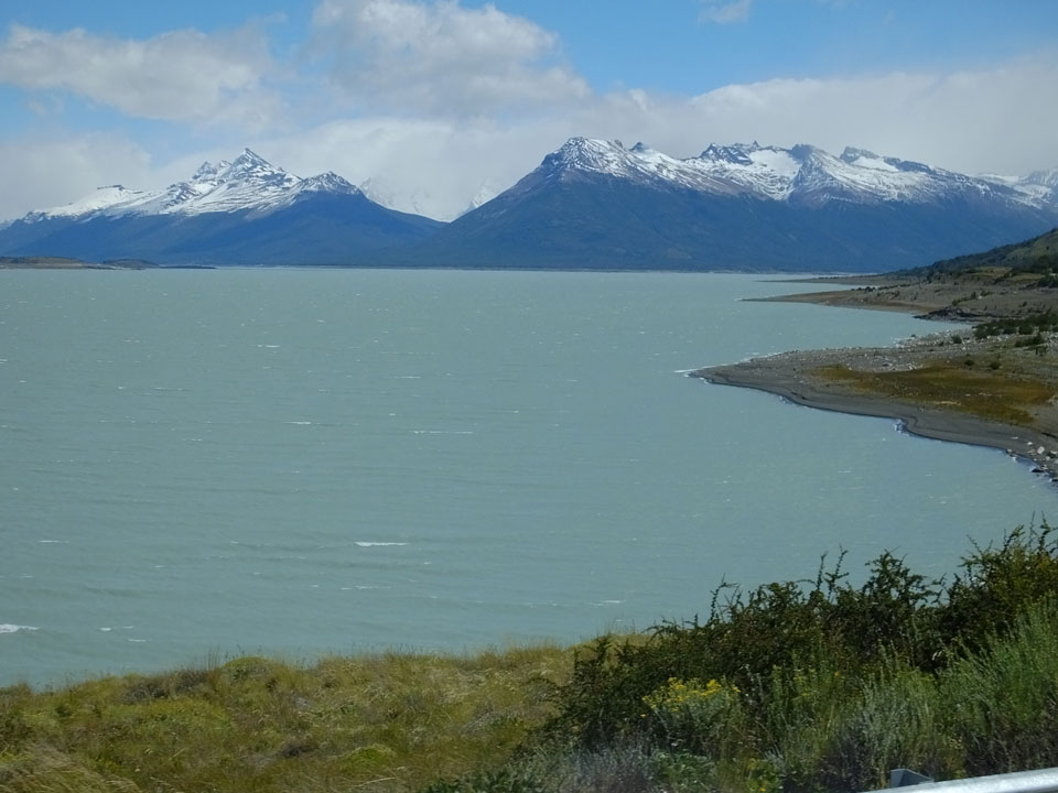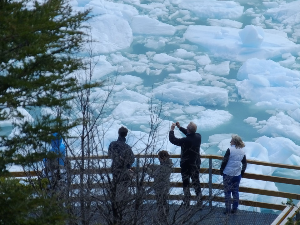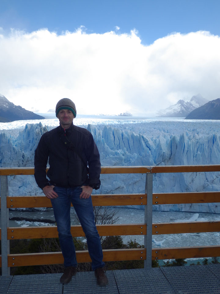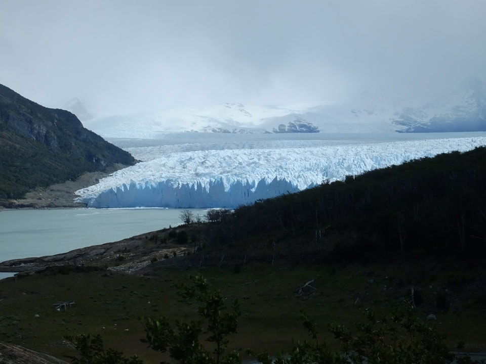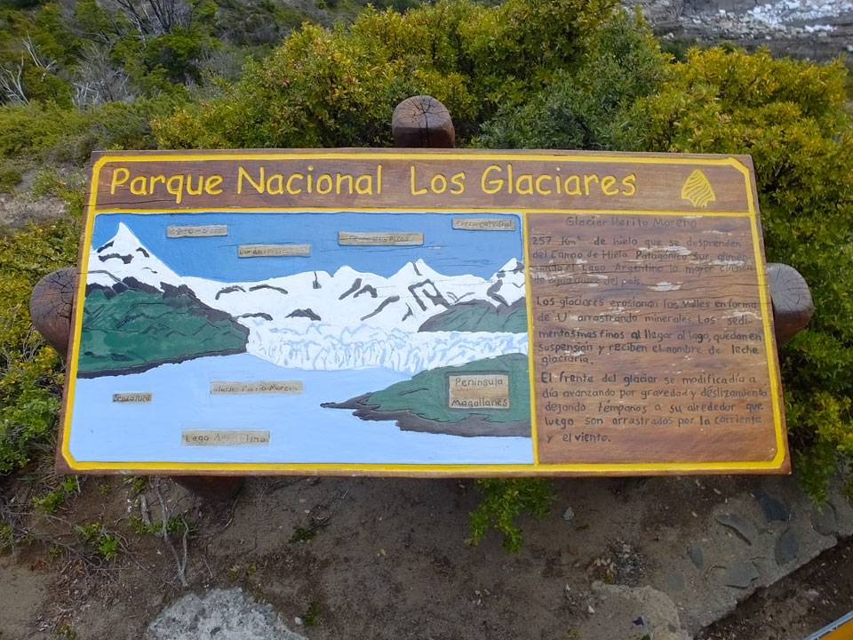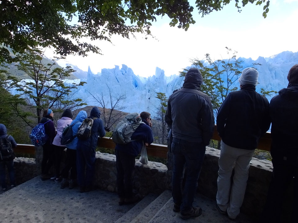 Dann 13:30 war das alles irgendwie geklärt und ich schwang mich runter zum Busbahnhof für den Start zum Perito Moreno Ausflug. Viele Israelis und Franzosen, ein Platz auf der linken Seite, wie empfohlen. Entlang am Lago Argentino ging’s zum Gletscher-Park. Da auch nochmal 215 ARS Eintritt. Wie gesagt: 1 zu 10 zum EUR nach offiziellem Kurs – ich bekomme hier nur 1 zu 11 zum Dollar aber das macht alles eben um die 30% günstiger.