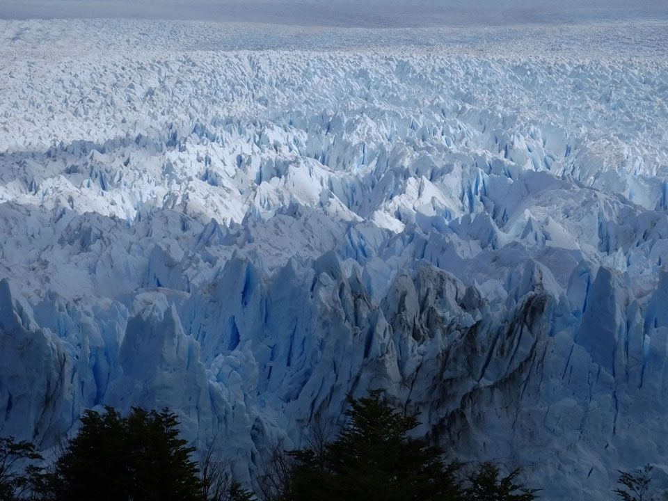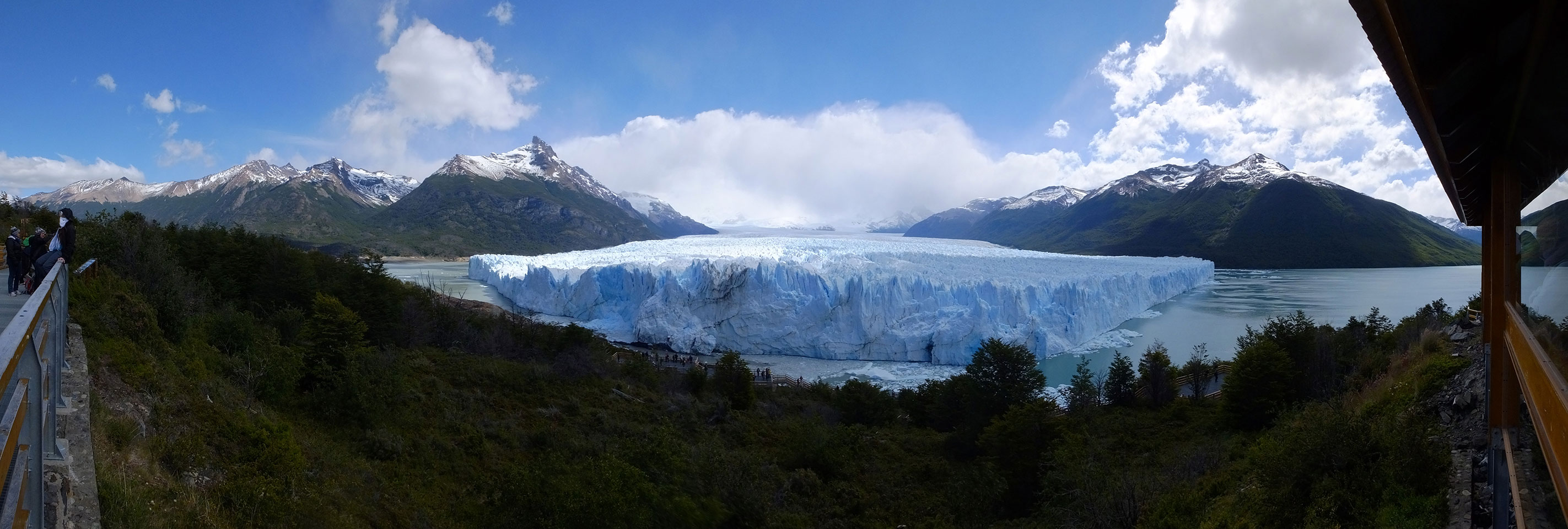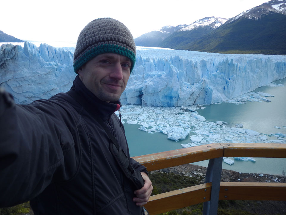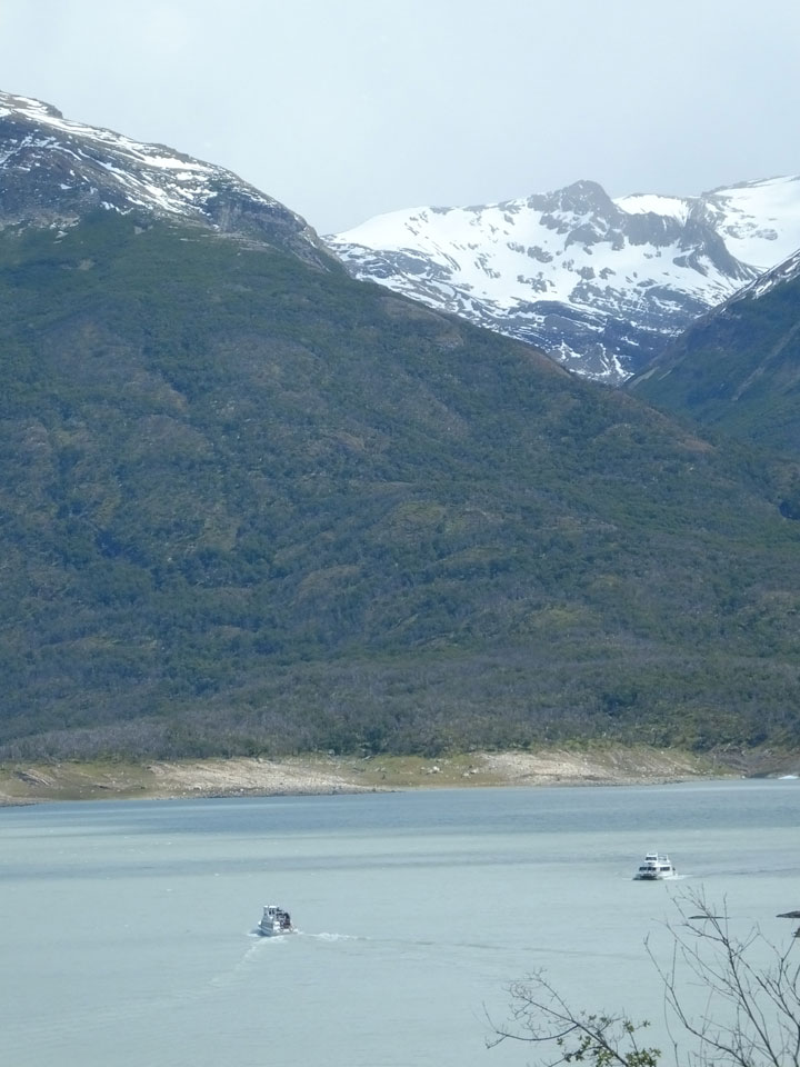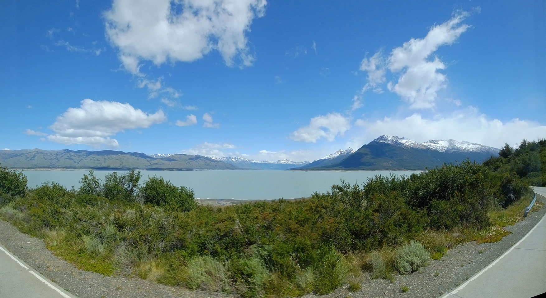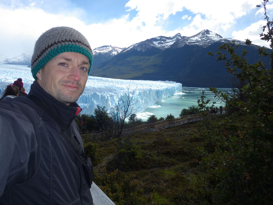 Dann 13:30 war das alles irgendwie geklärt und ich schwang mich runter zum Busbahnhof für den Start zum Perito Moreno Ausflug. Viele Israelis und Franzosen, ein Platz auf der linken Seite, wie empfohlen. Entlang am Lago Argentino ging’s zum Gletscher-Park. Da auch nochmal 215 ARS Eintritt. Wie gesagt: 1 zu 10 zum EUR nach offiziellem Kurs – ich bekomme hier nur 1 zu 11 zum Dollar aber das macht alles eben um die 30% günstiger.