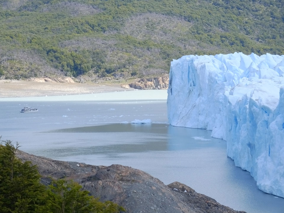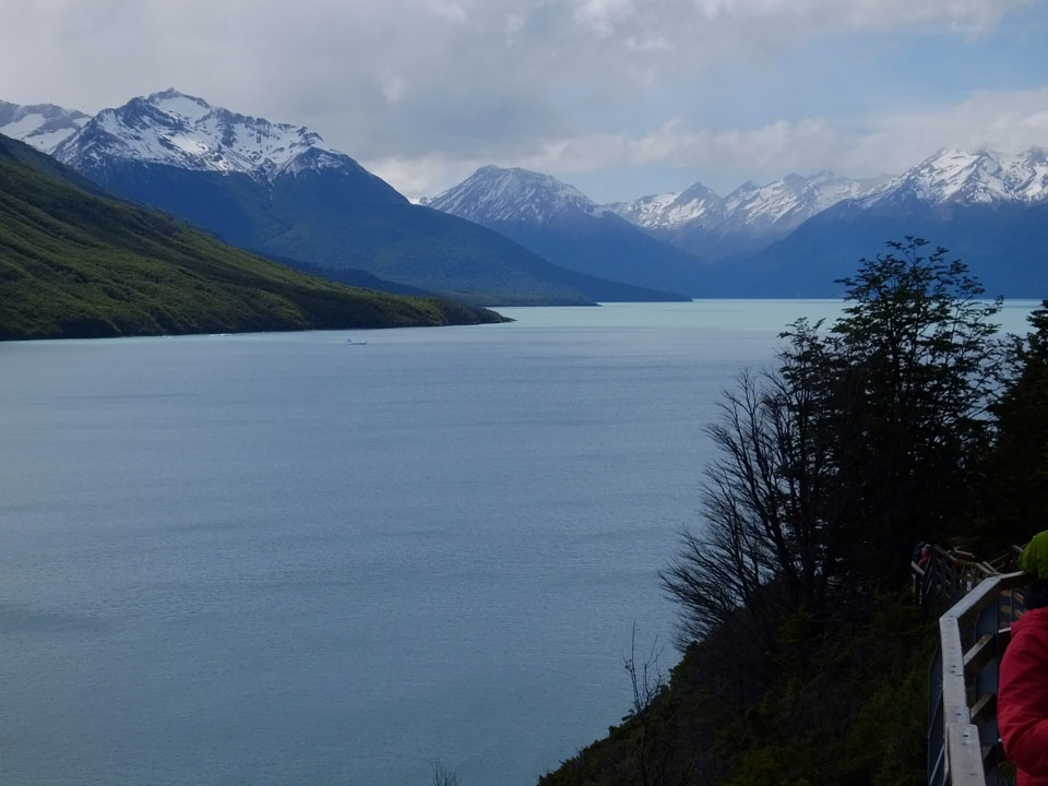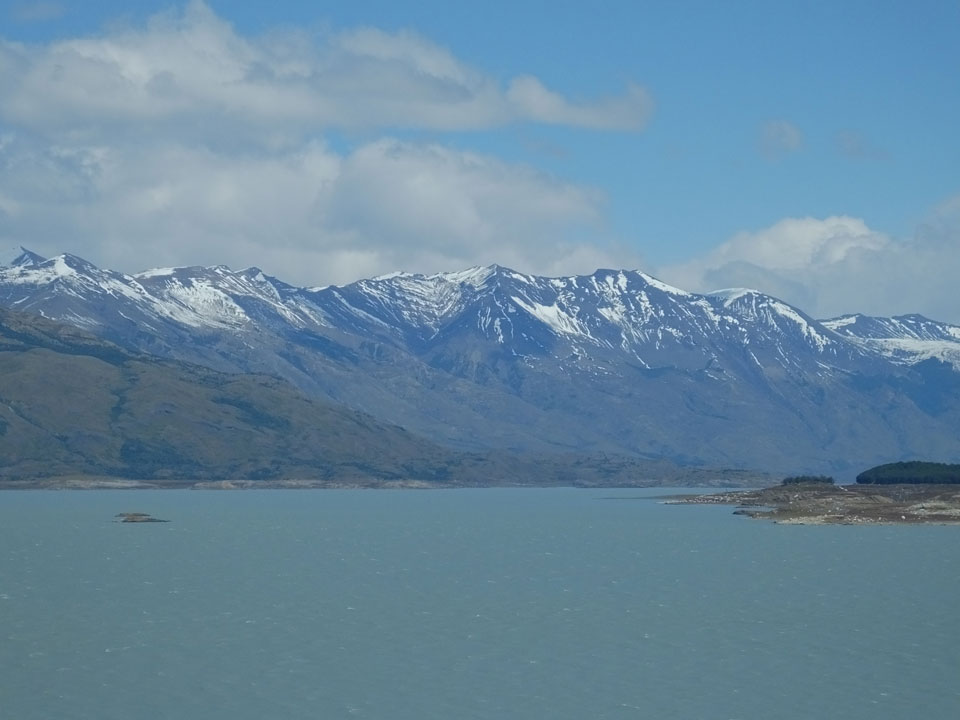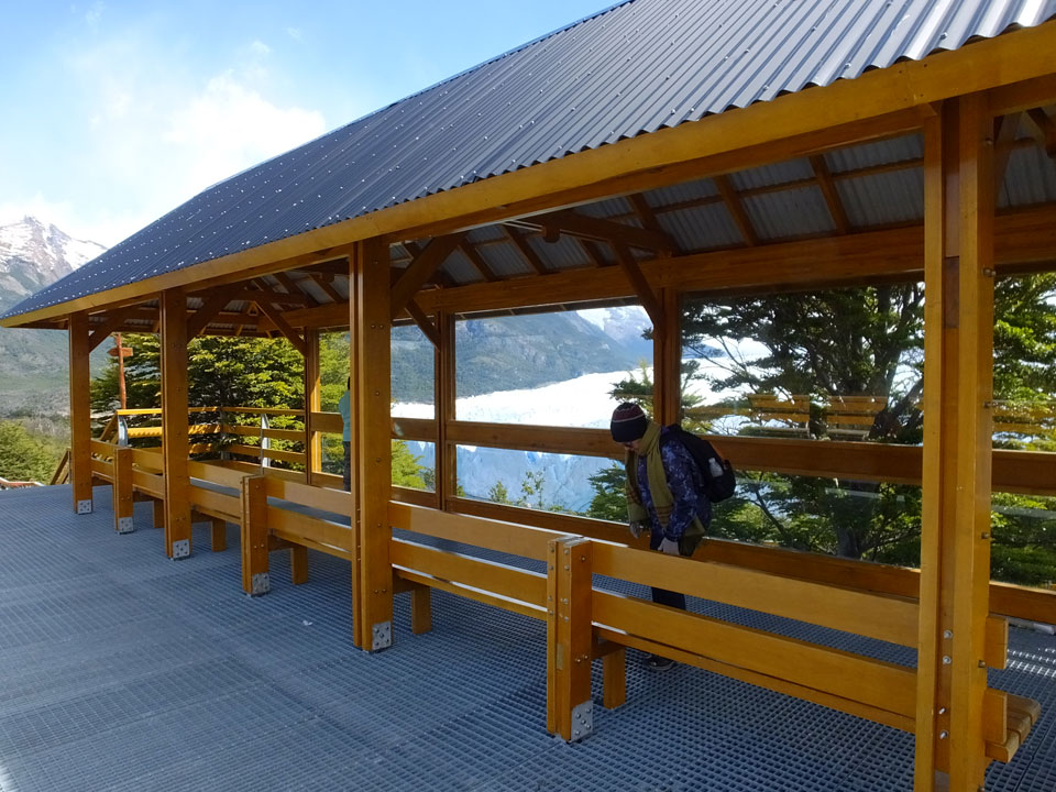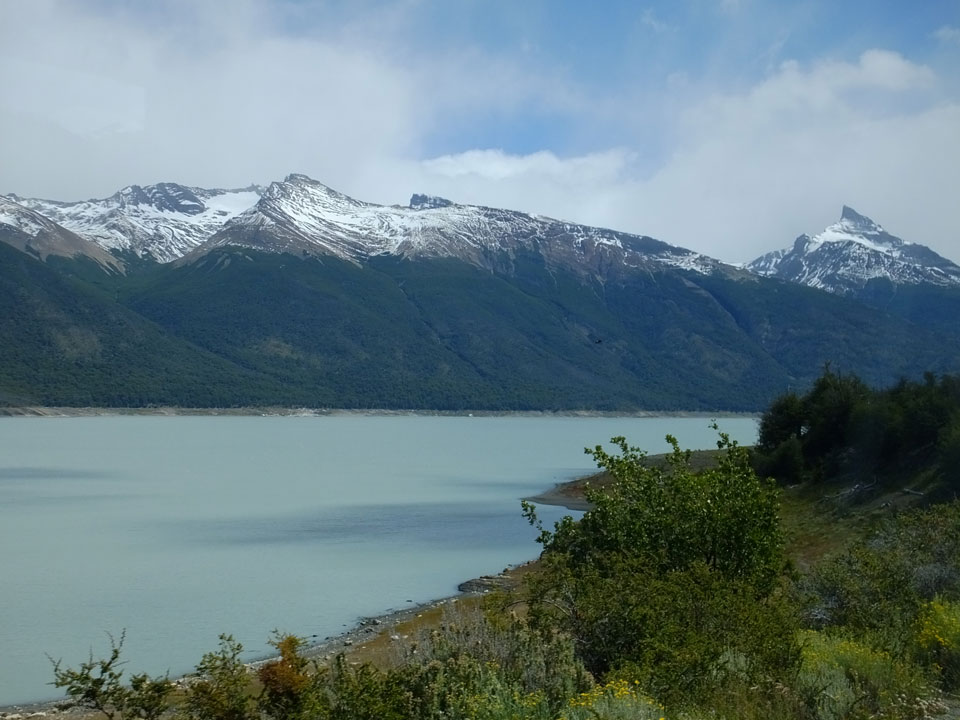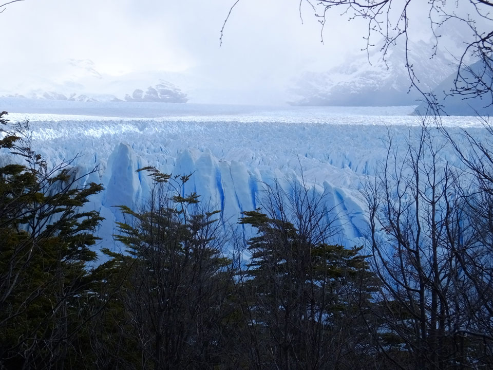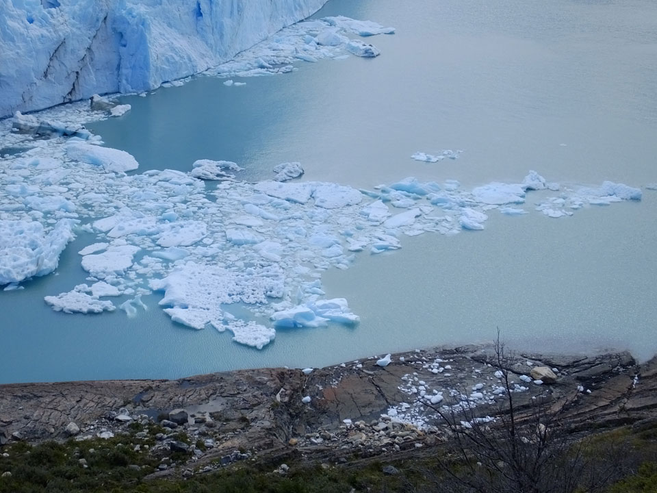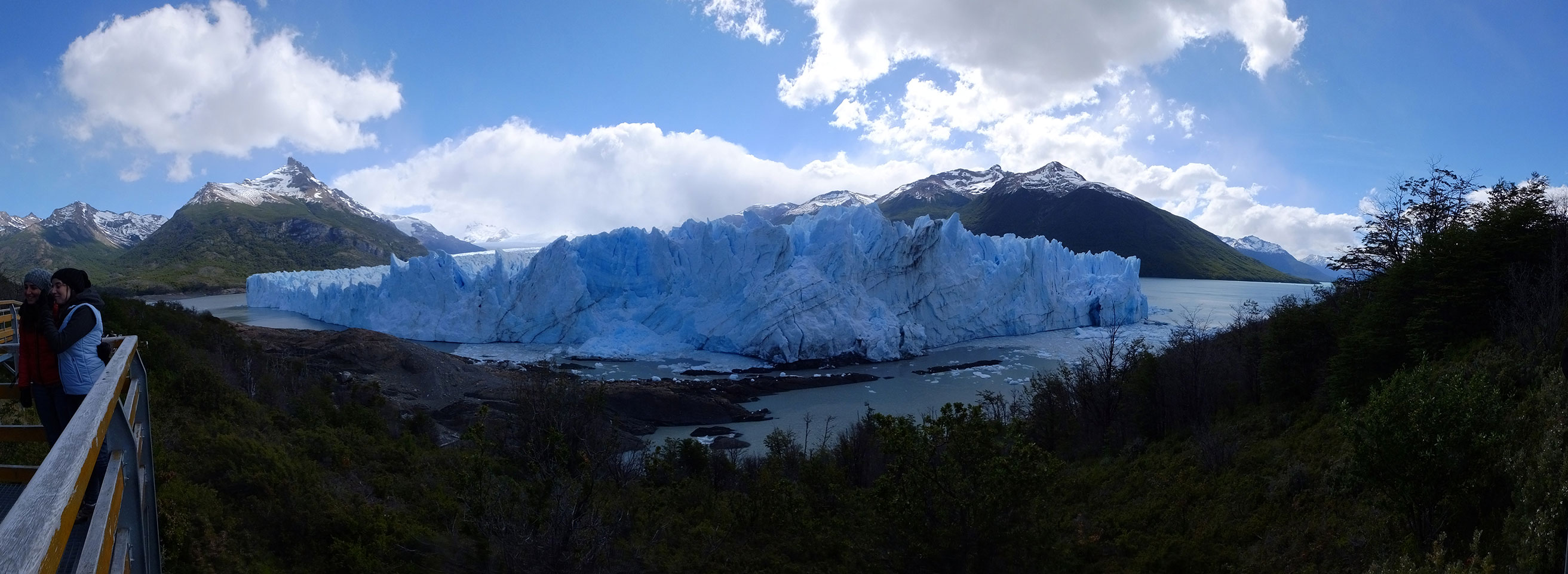 Dann 13:30 war das alles irgendwie geklärt und ich schwang mich runter zum Busbahnhof für den Start zum Perito Moreno Ausflug. Viele Israelis und Franzosen, ein Platz auf der linken Seite, wie empfohlen. Entlang am Lago Argentino ging’s zum Gletscher-Park. Da auch nochmal 215 ARS Eintritt. Wie gesagt: 1 zu 10 zum EUR nach offiziellem Kurs – ich bekomme hier nur 1 zu 11 zum Dollar aber das macht alles eben um die 30% günstiger.
