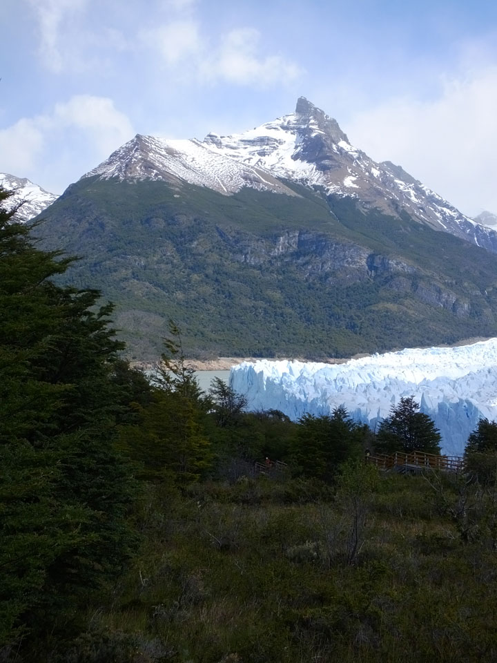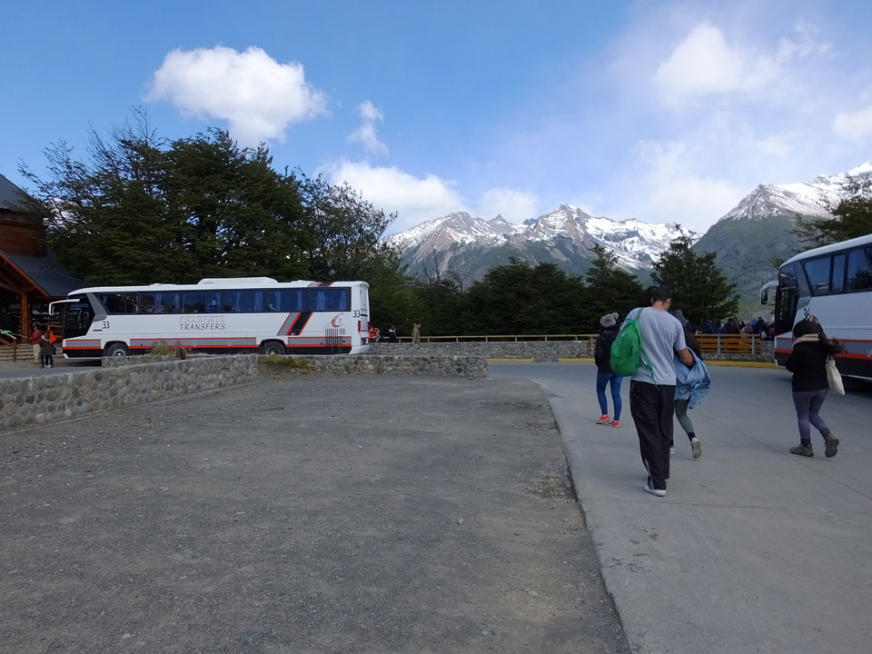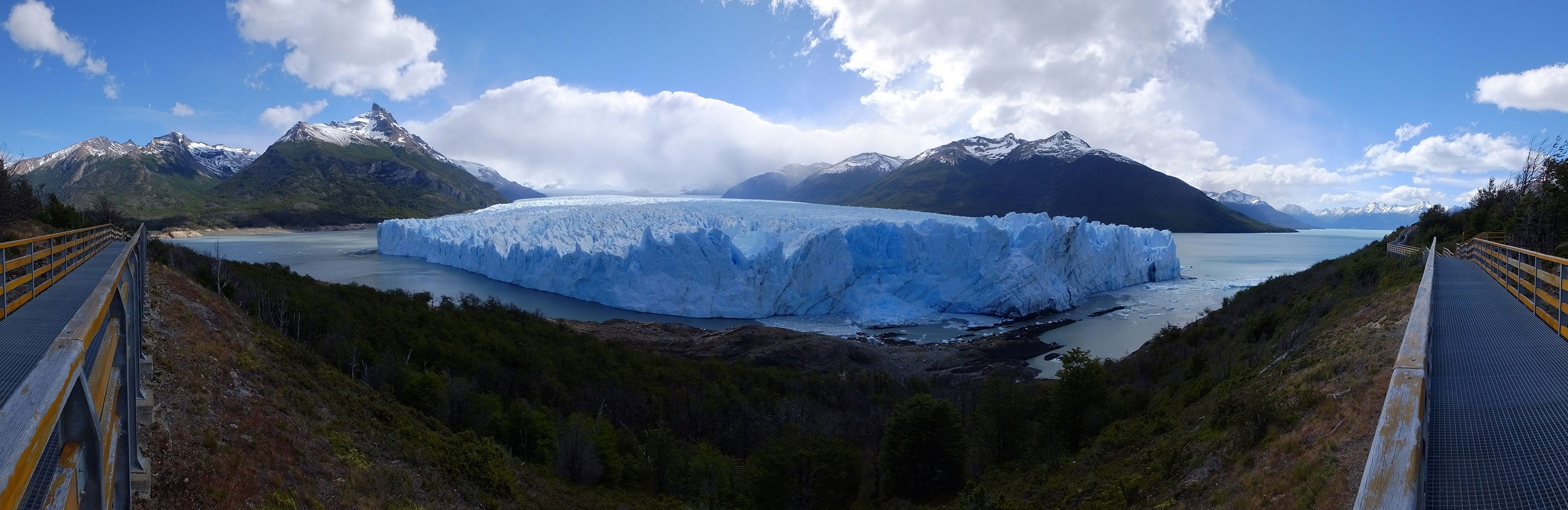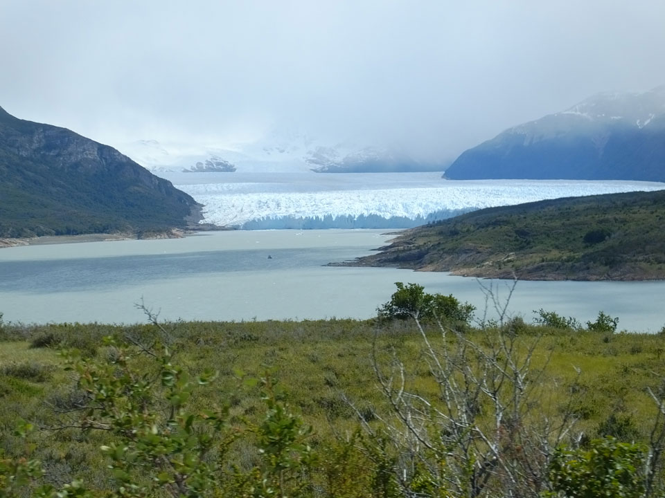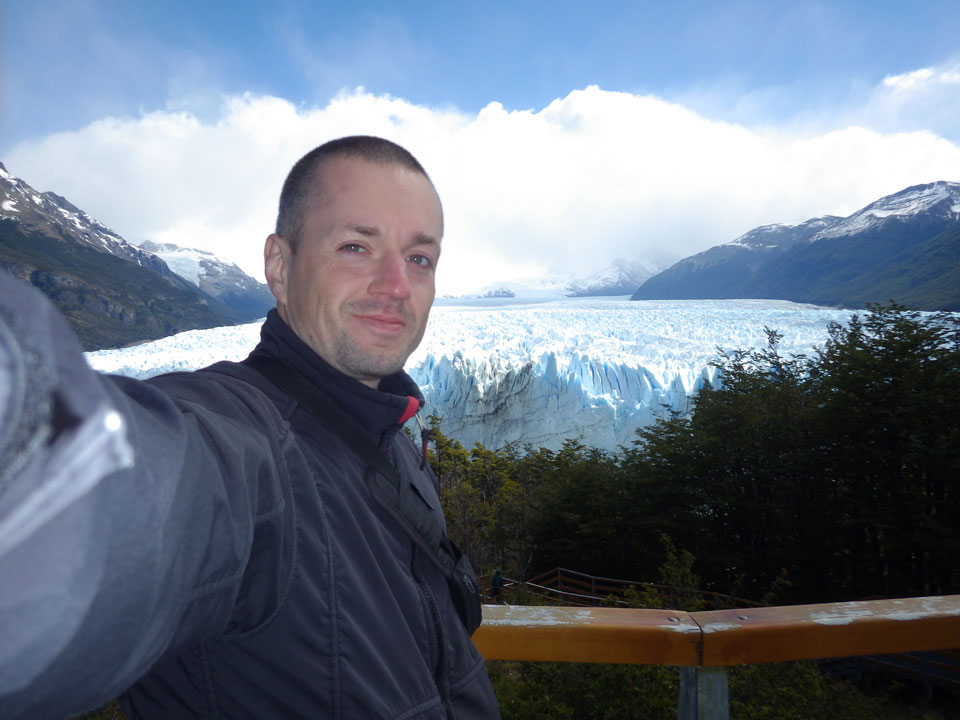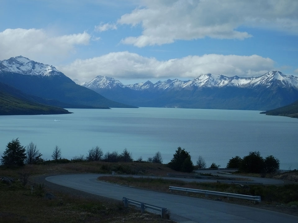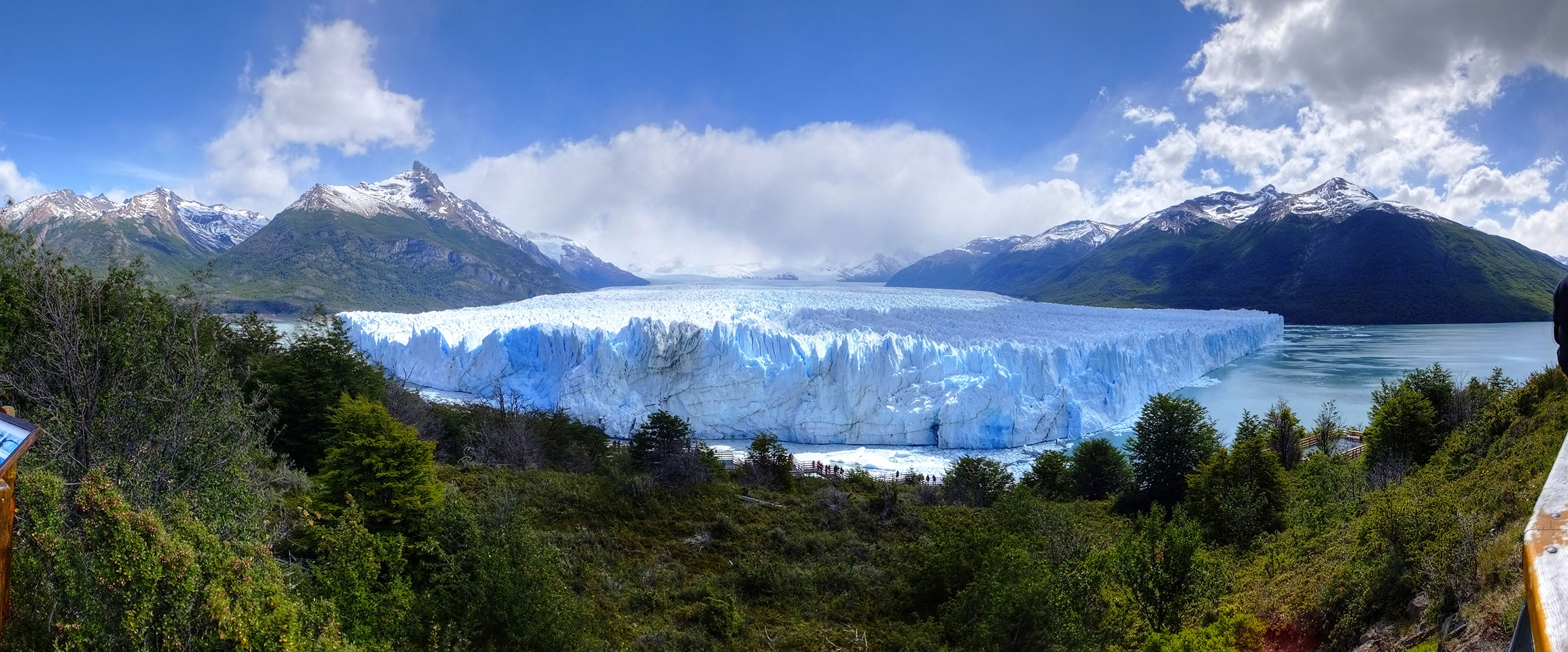 Dann 13:30 war das alles irgendwie geklärt und ich schwang mich runter zum Busbahnhof für den Start zum Perito Moreno Ausflug. Viele Israelis und Franzosen, ein Platz auf der linken Seite, wie empfohlen. Entlang am Lago Argentino ging’s zum Gletscher-Park. Da auch nochmal 215 ARS Eintritt. Wie gesagt: 1 zu 10 zum EUR nach offiziellem Kurs – ich bekomme hier nur 1 zu 11 zum Dollar aber das macht alles eben um die 30% günstiger.
