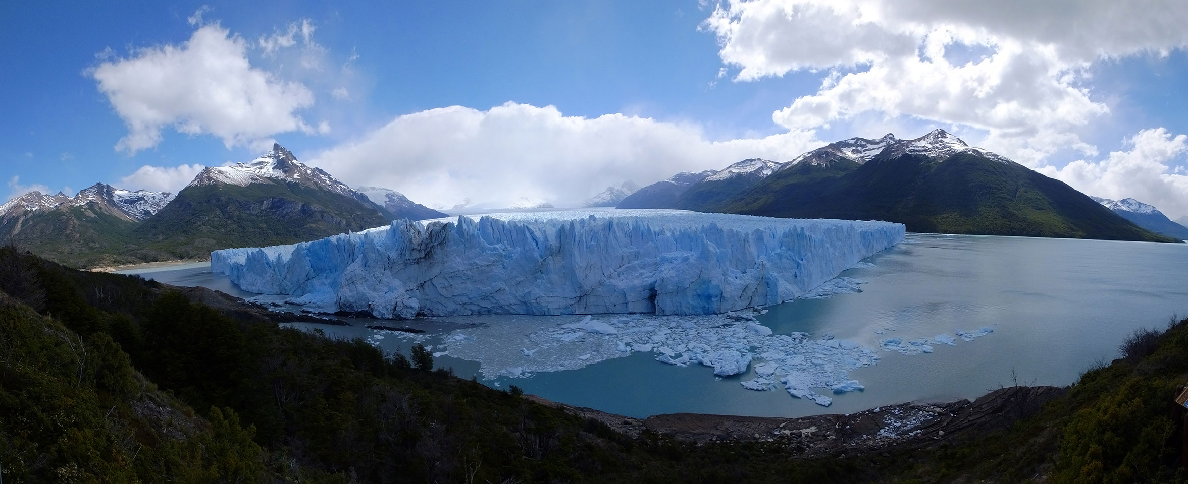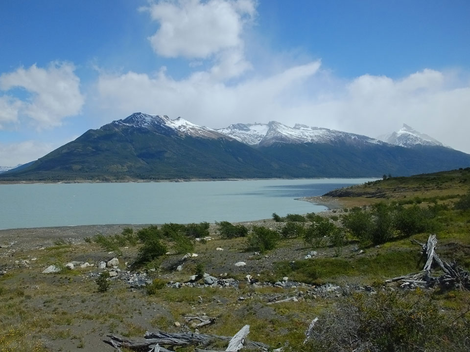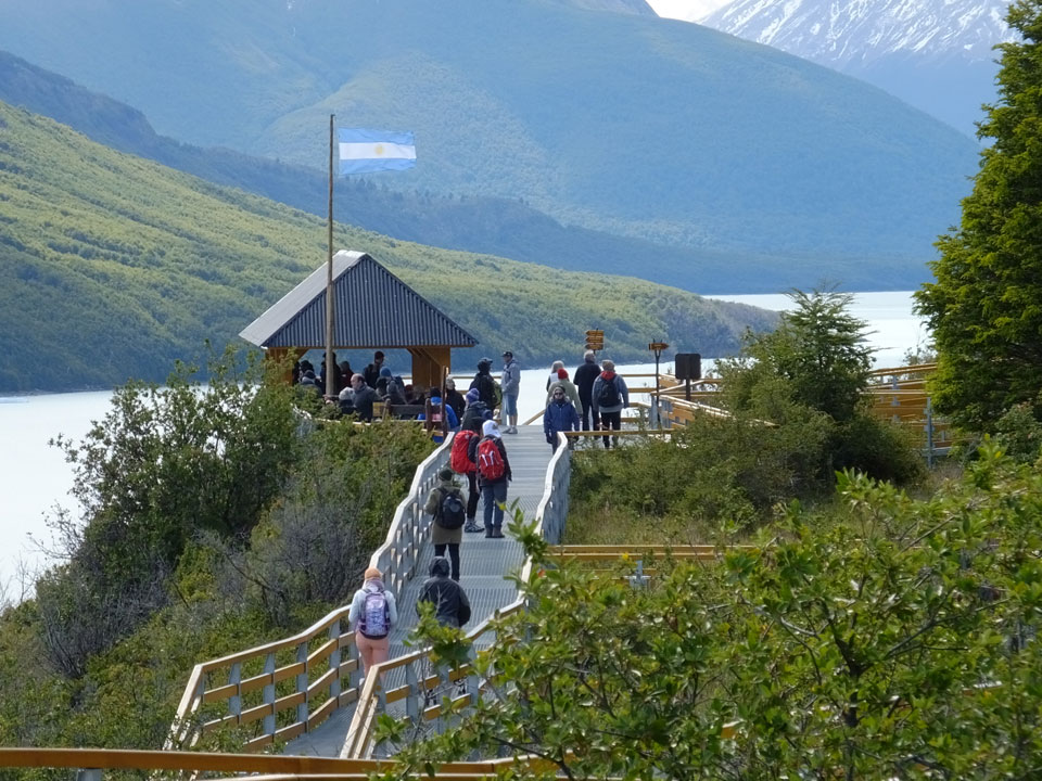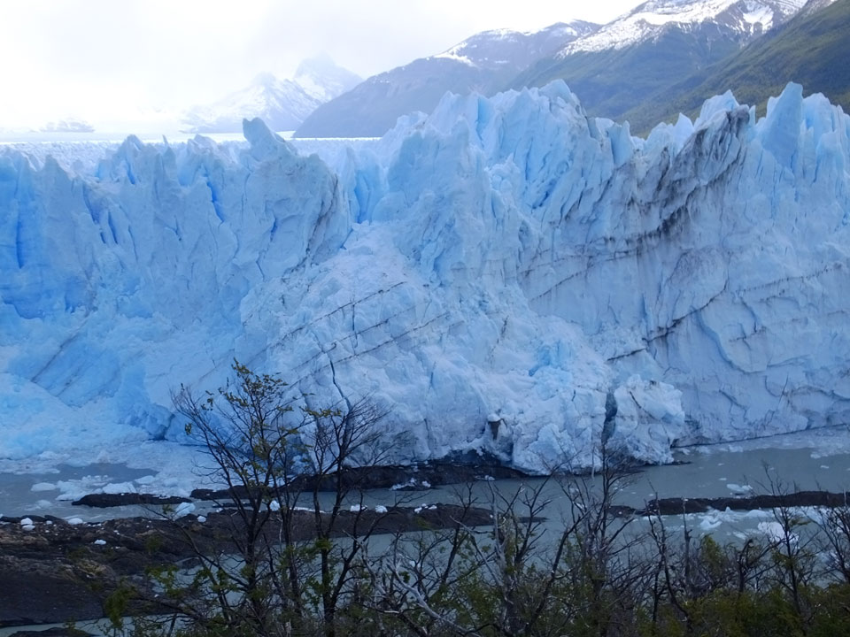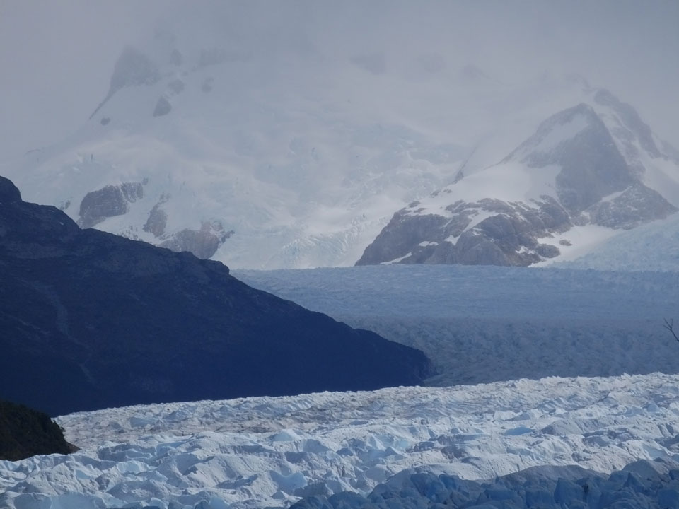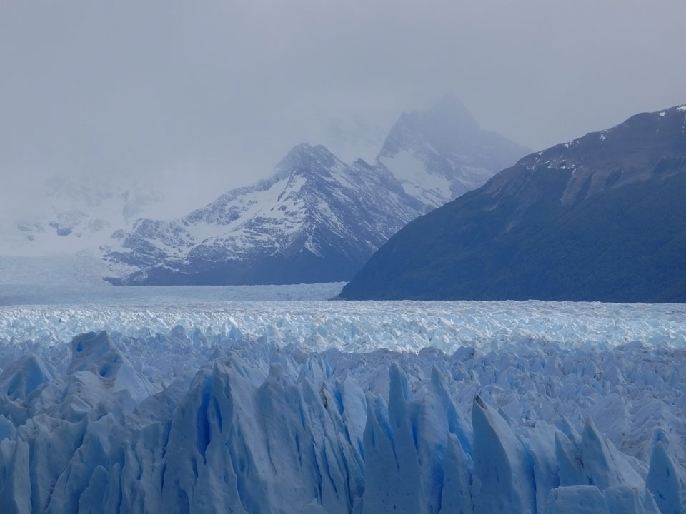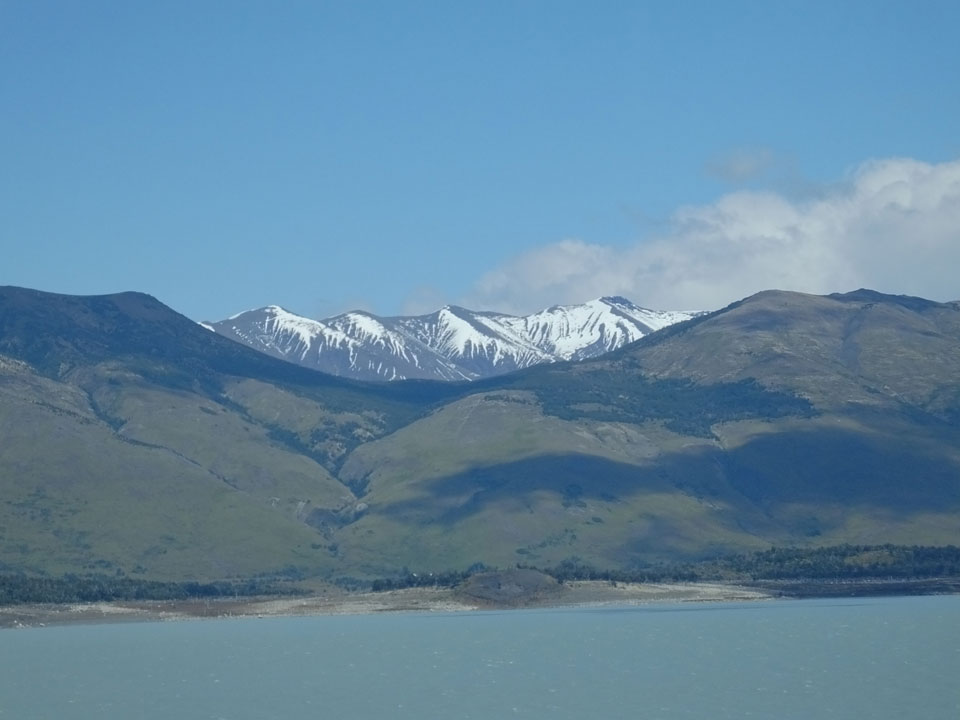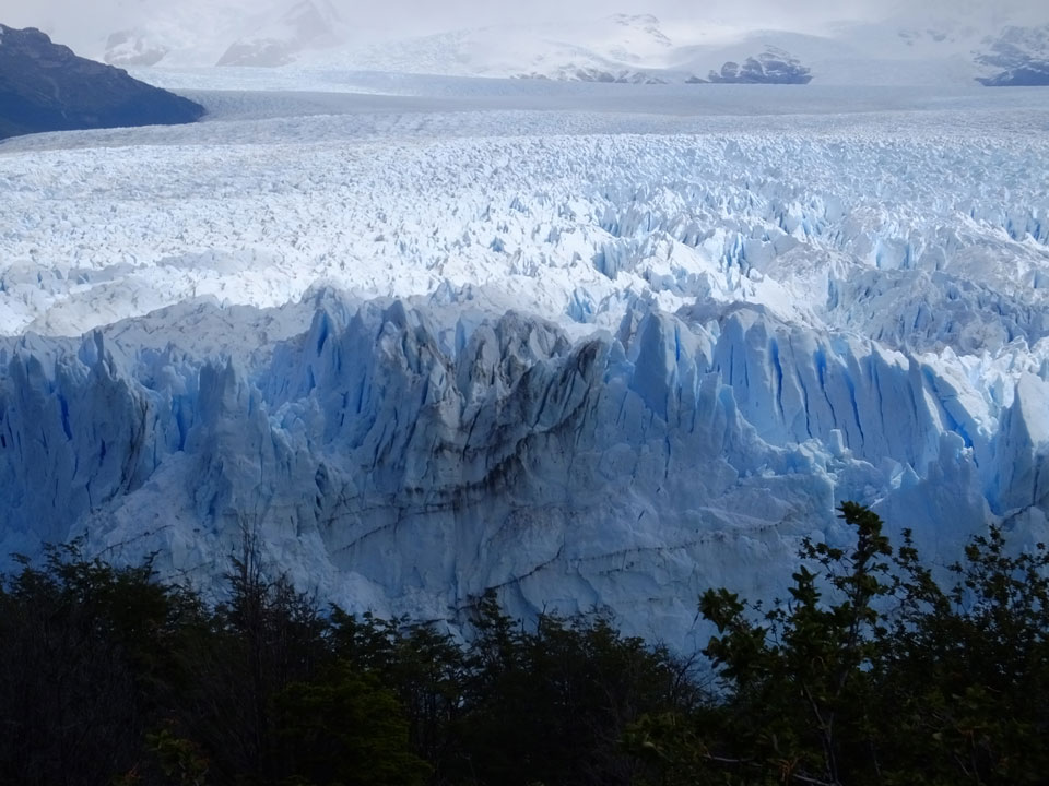 Dann 13:30 war das alles irgendwie geklärt und ich schwang mich runter zum Busbahnhof für den Start zum Perito Moreno Ausflug. Viele Israelis und Franzosen, ein Platz auf der linken Seite, wie empfohlen. Entlang am Lago Argentino ging’s zum Gletscher-Park. Da auch nochmal 215 ARS Eintritt. Wie gesagt: 1 zu 10 zum EUR nach offiziellem Kurs – ich bekomme hier nur 1 zu 11 zum Dollar aber das macht alles eben um die 30% günstiger.