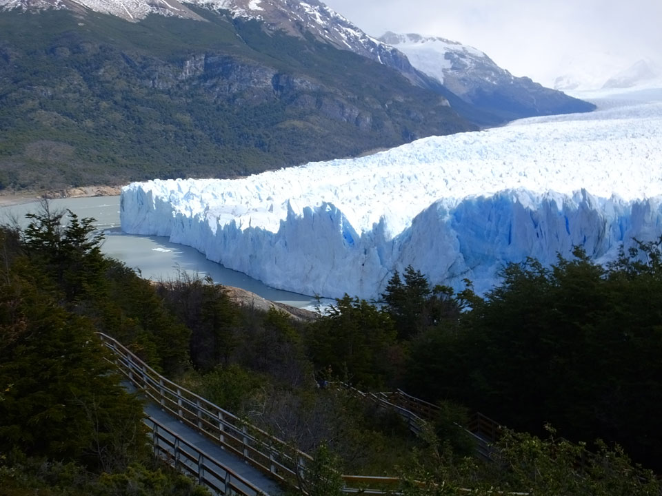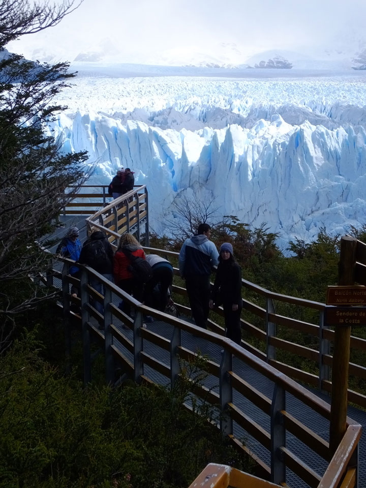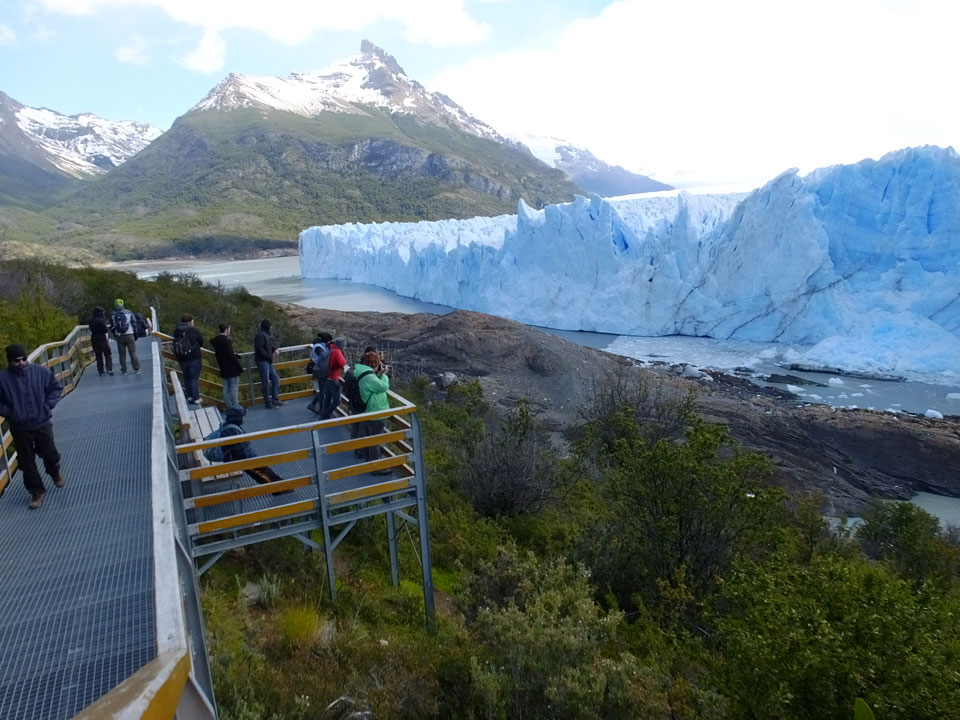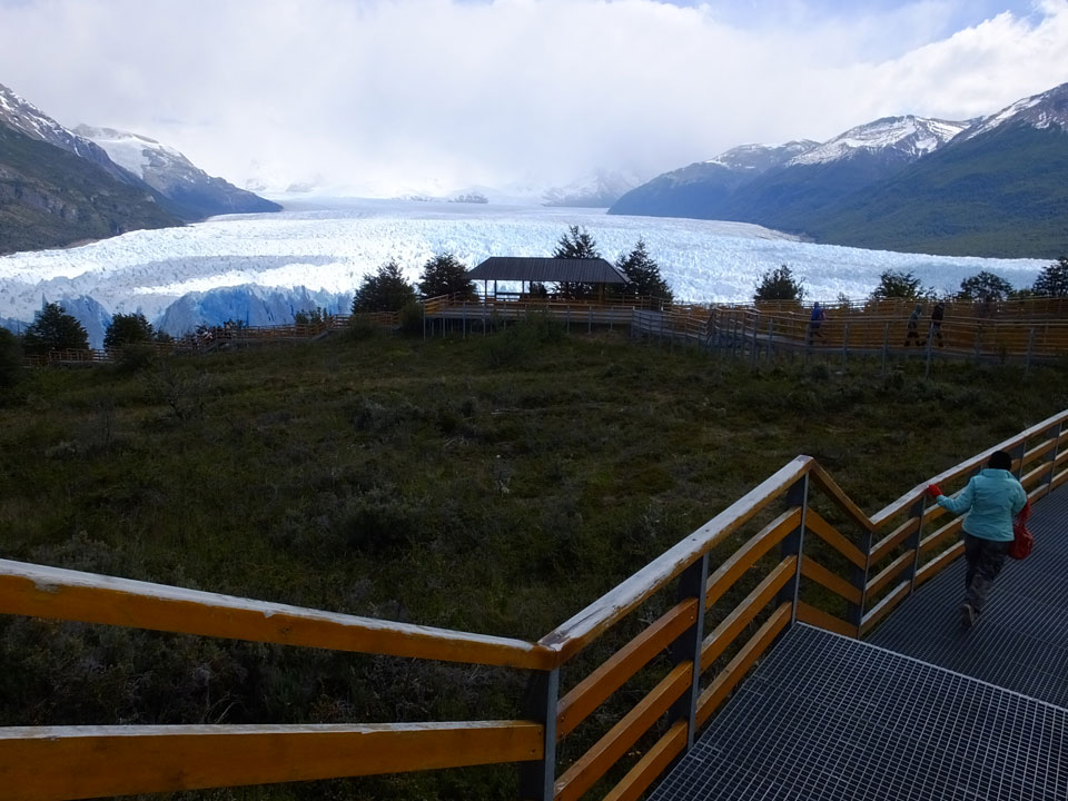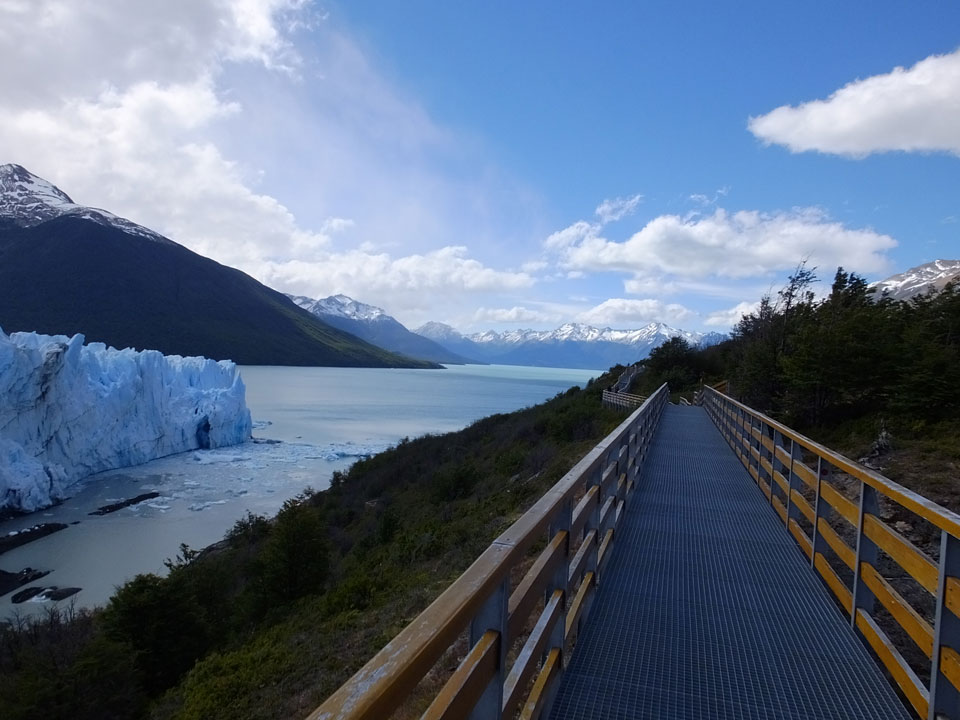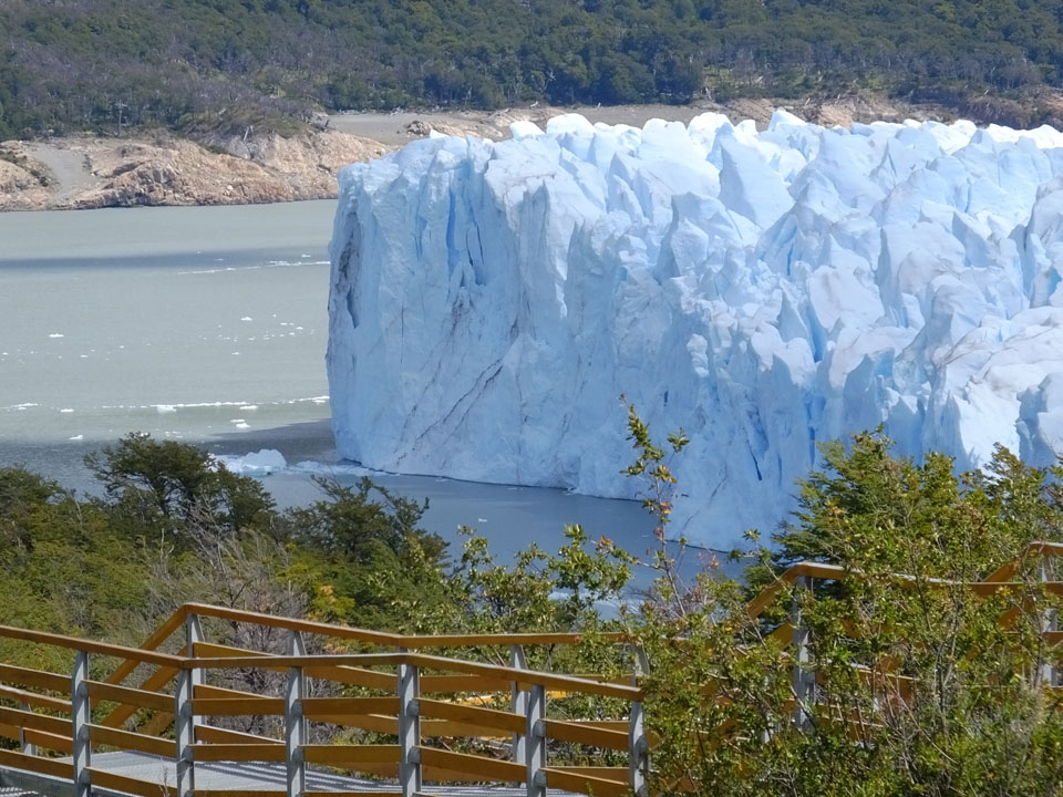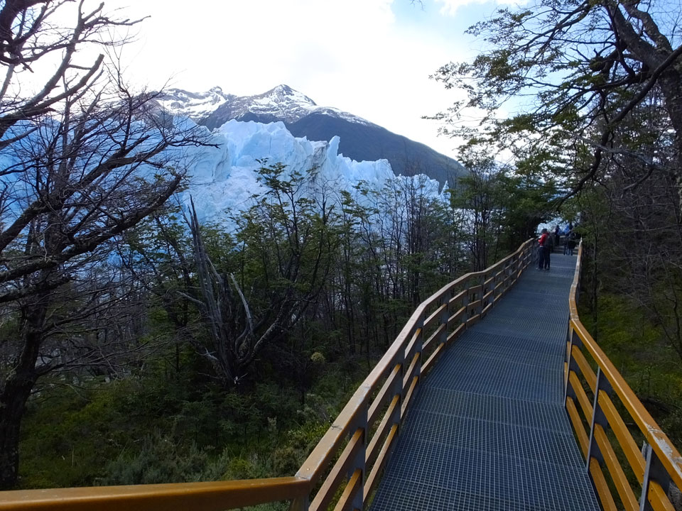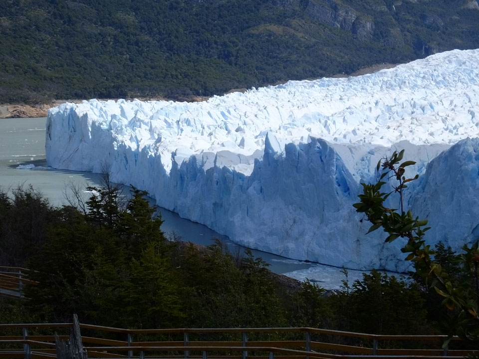 Der Weg besteht aus Gitterplatten und führt weiter runter recht nah an den Gletscher. Der Perito Moreno ist schon sehr eindrucksvoll. Das Eis ist gigantisch hoch und zieht sich in weite Ferne. Das Krachen und dumpfe Knacken den ständig in Bewegung befindlichen Gletschers zeigt die Masse und Kraft der Natur.