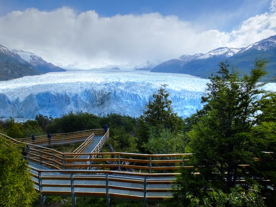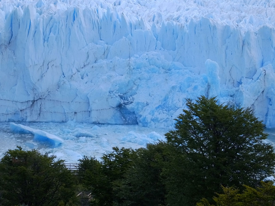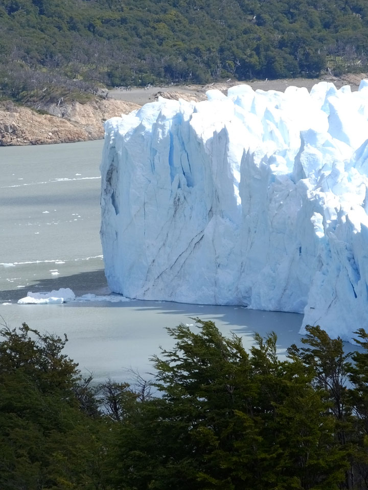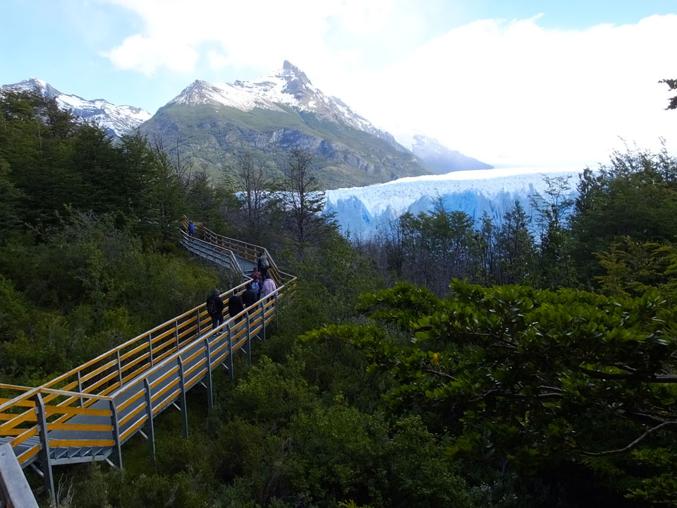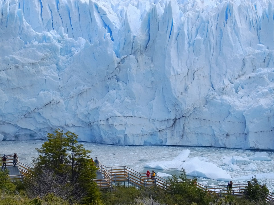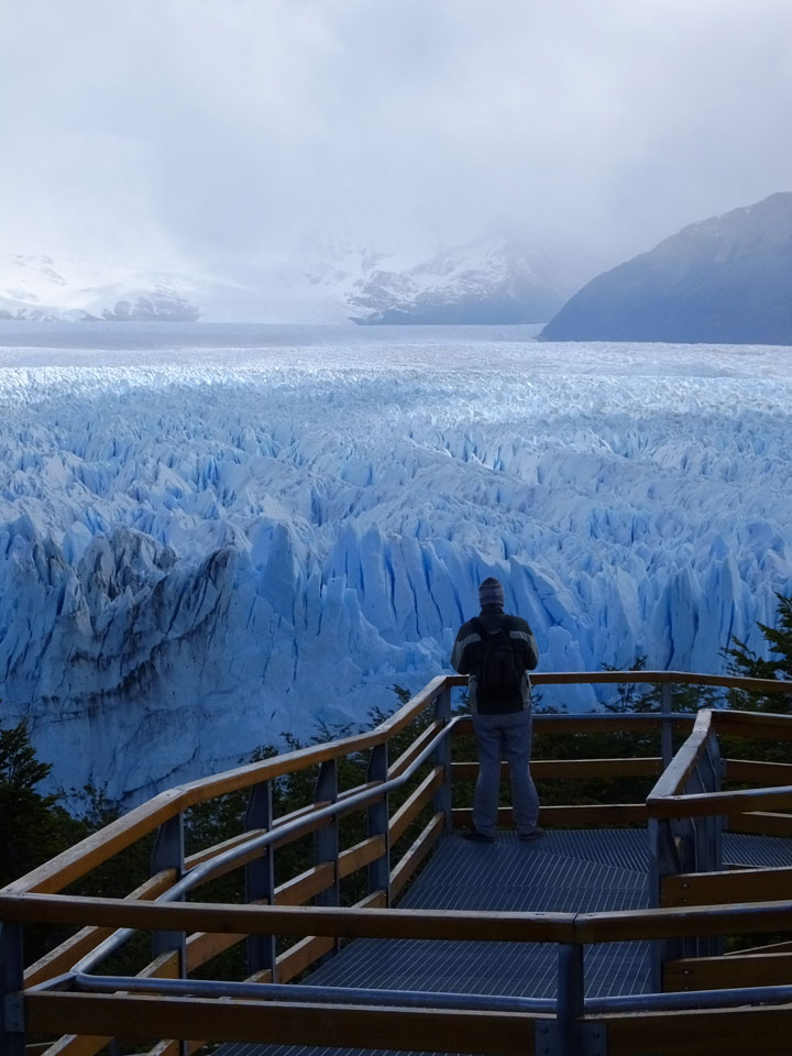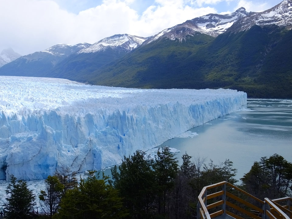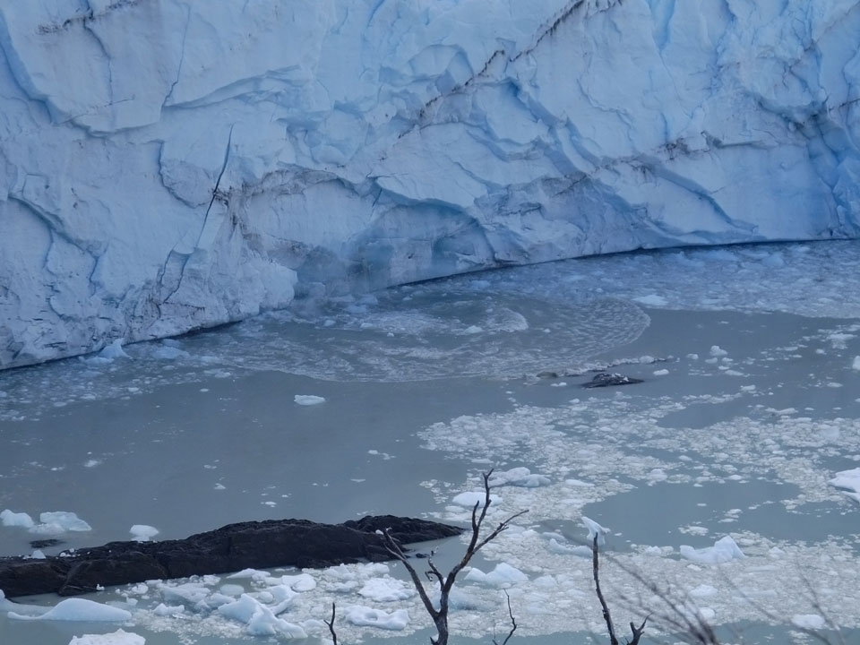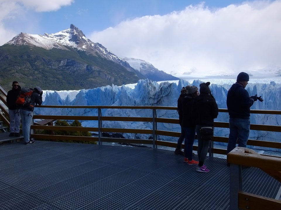 Der Weg besteht aus Gitterplatten und führt weiter runter recht nah an den Gletscher. Der Perito Moreno ist schon sehr eindrucksvoll. Das Eis ist gigantisch hoch und zieht sich in weite Ferne. Das Krachen und dumpfe Knacken den ständig in Bewegung befindlichen Gletschers zeigt die Masse und Kraft der Natur.