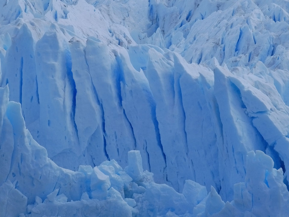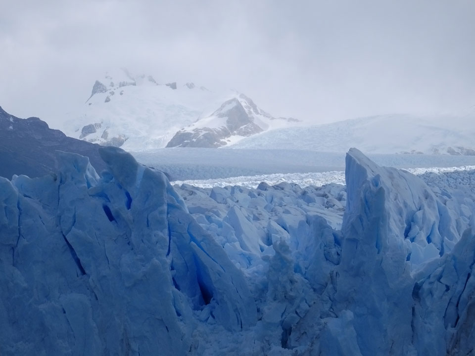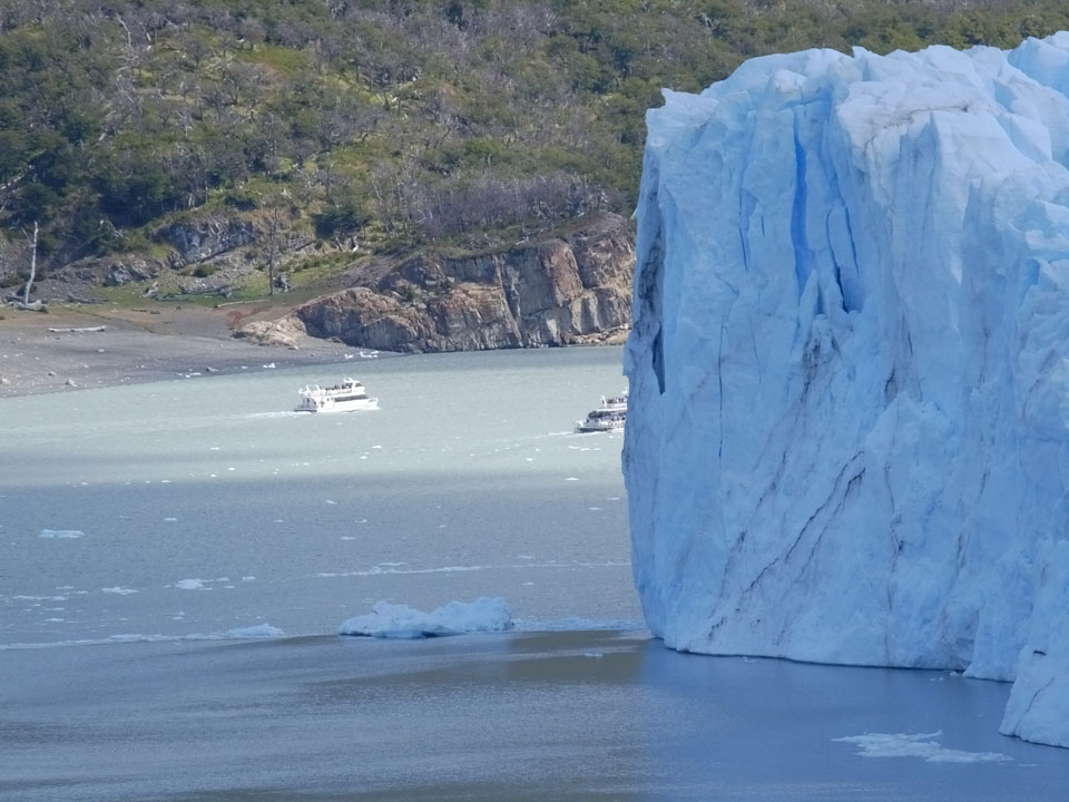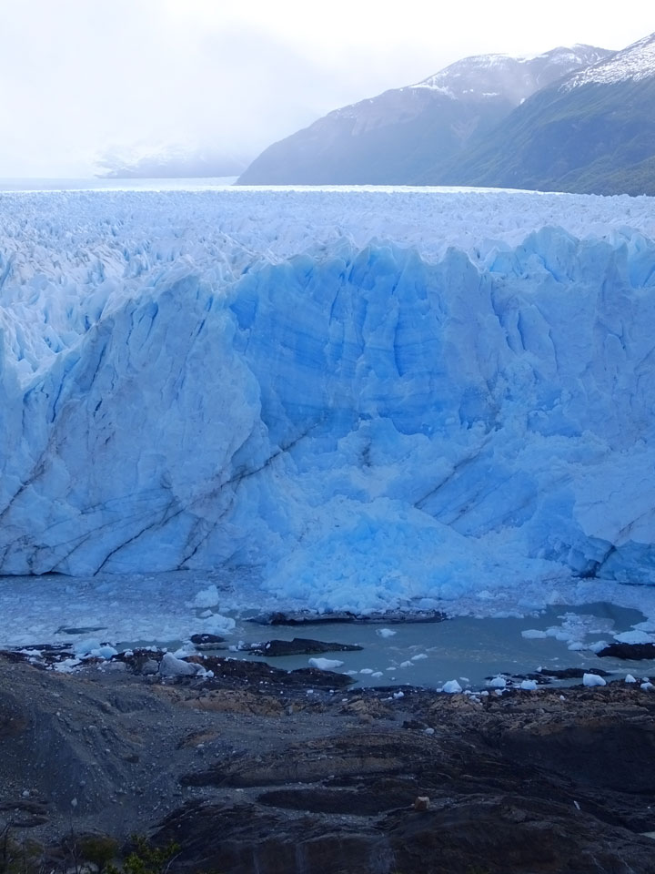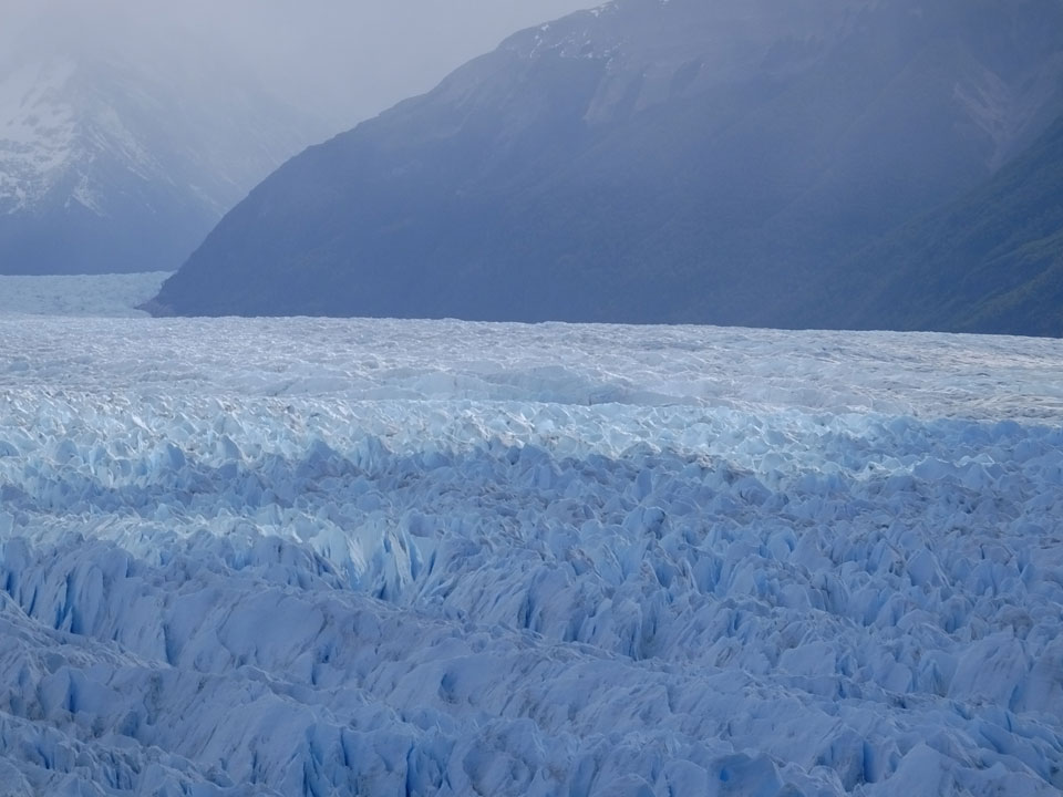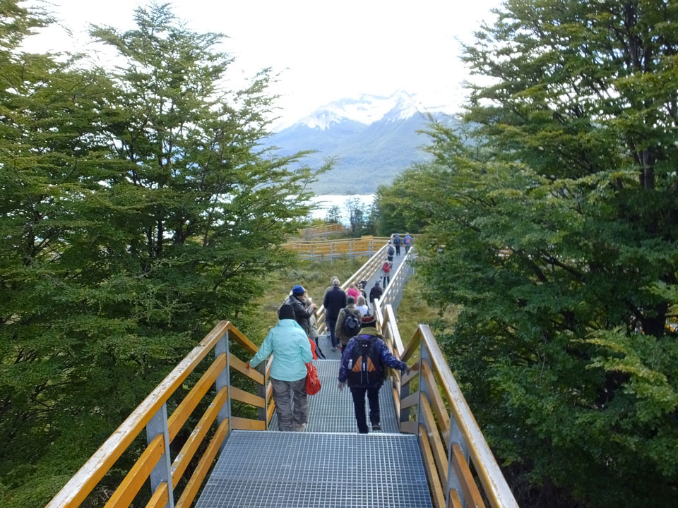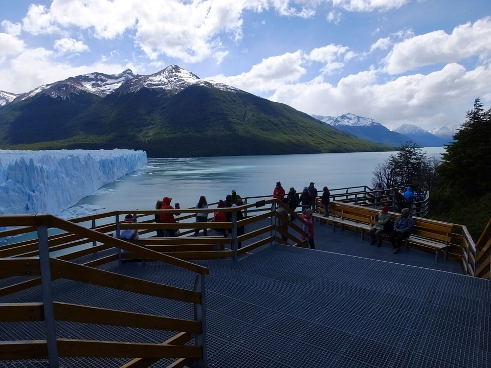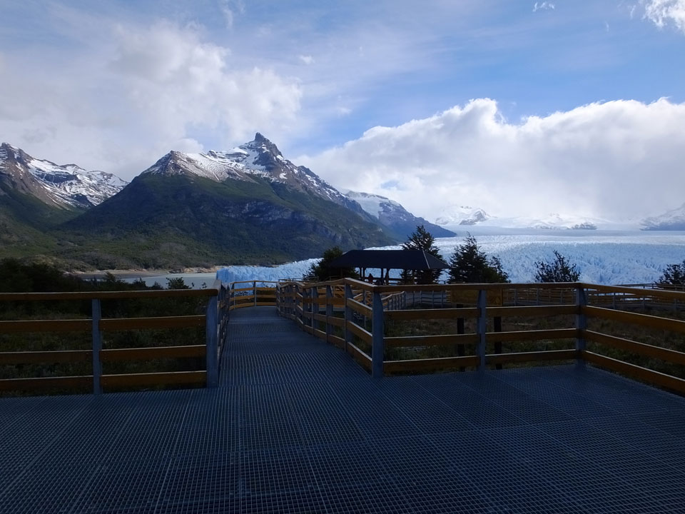 Der Weg besteht aus Gitterplatten und führt weiter runter recht nah an den Gletscher. Der Perito Moreno ist schon sehr eindrucksvoll. Das Eis ist gigantisch hoch und zieht sich in weite Ferne. Das Krachen und dumpfe Knacken den ständig in Bewegung befindlichen Gletschers zeigt die Masse und Kraft der Natur.