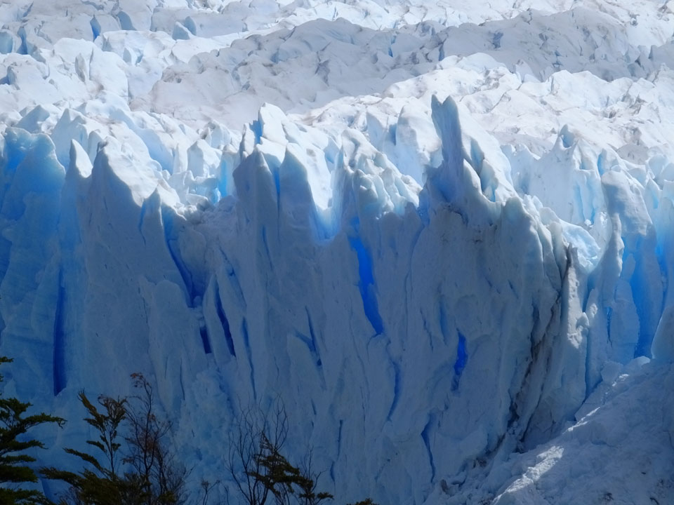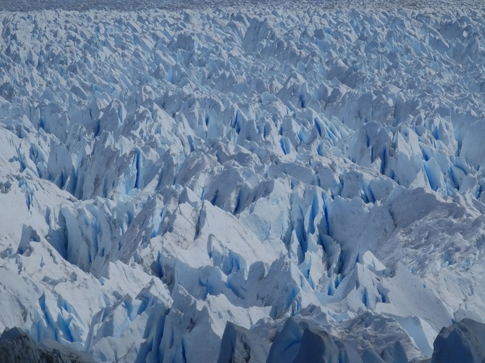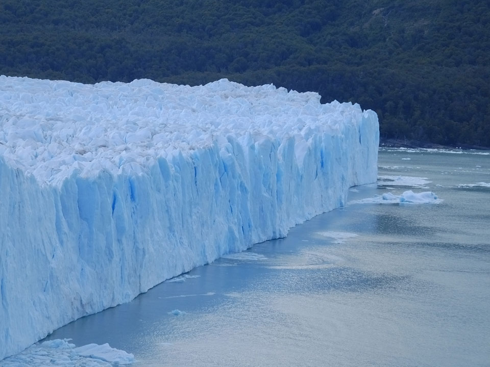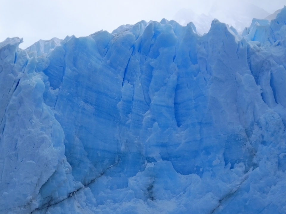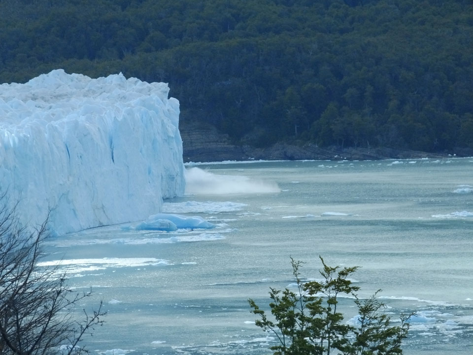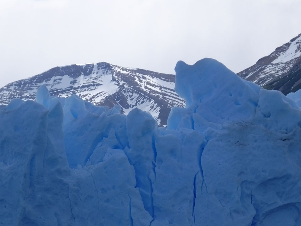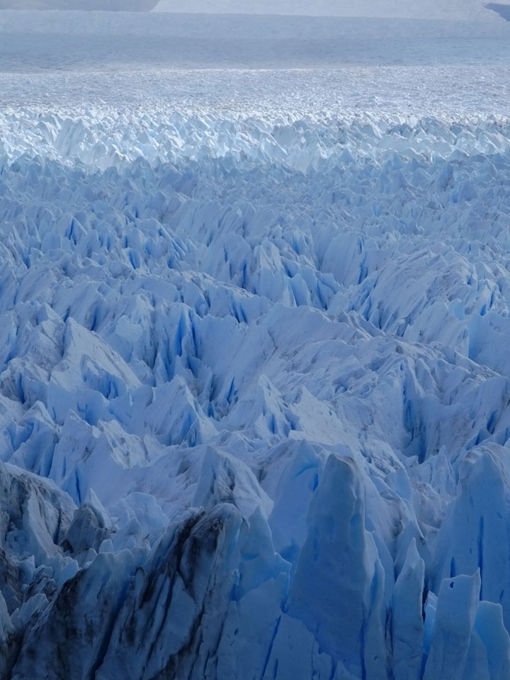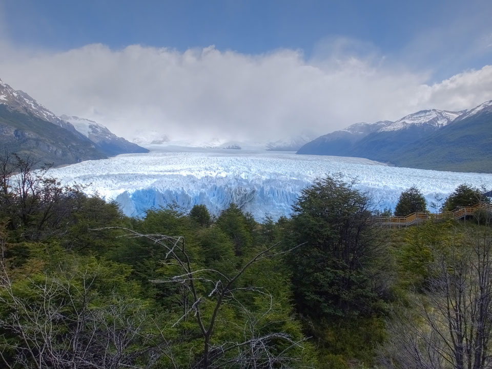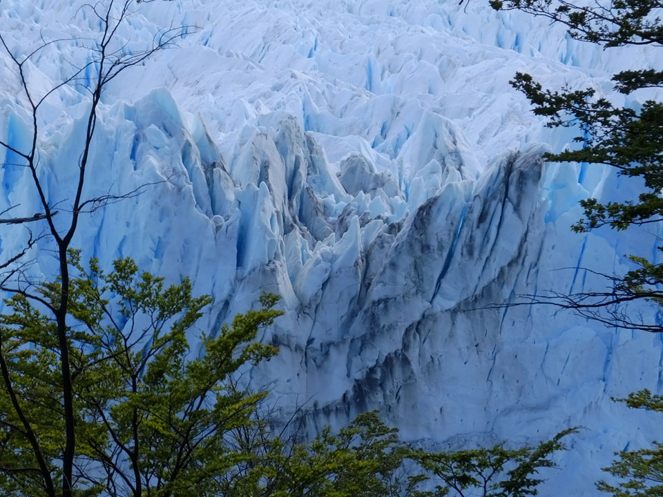 Der Weg besteht aus Gitterplatten und führt weiter runter recht nah an den Gletscher. Der Perito Moreno ist schon sehr eindrucksvoll. Das Eis ist gigantisch hoch und zieht sich in weite Ferne. Das Krachen und dumpfe Knacken den ständig in Bewegung befindlichen Gletschers zeigt die Masse und Kraft der Natur.