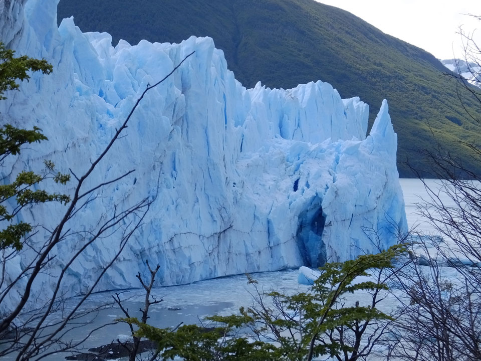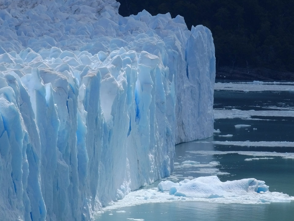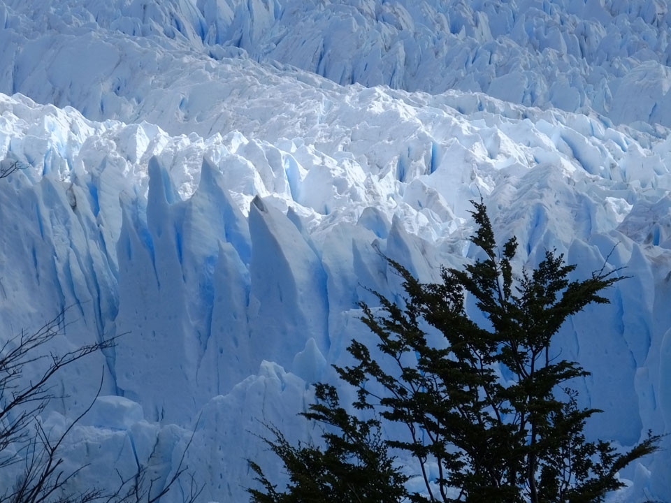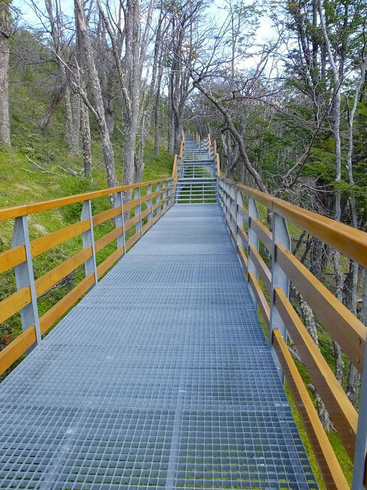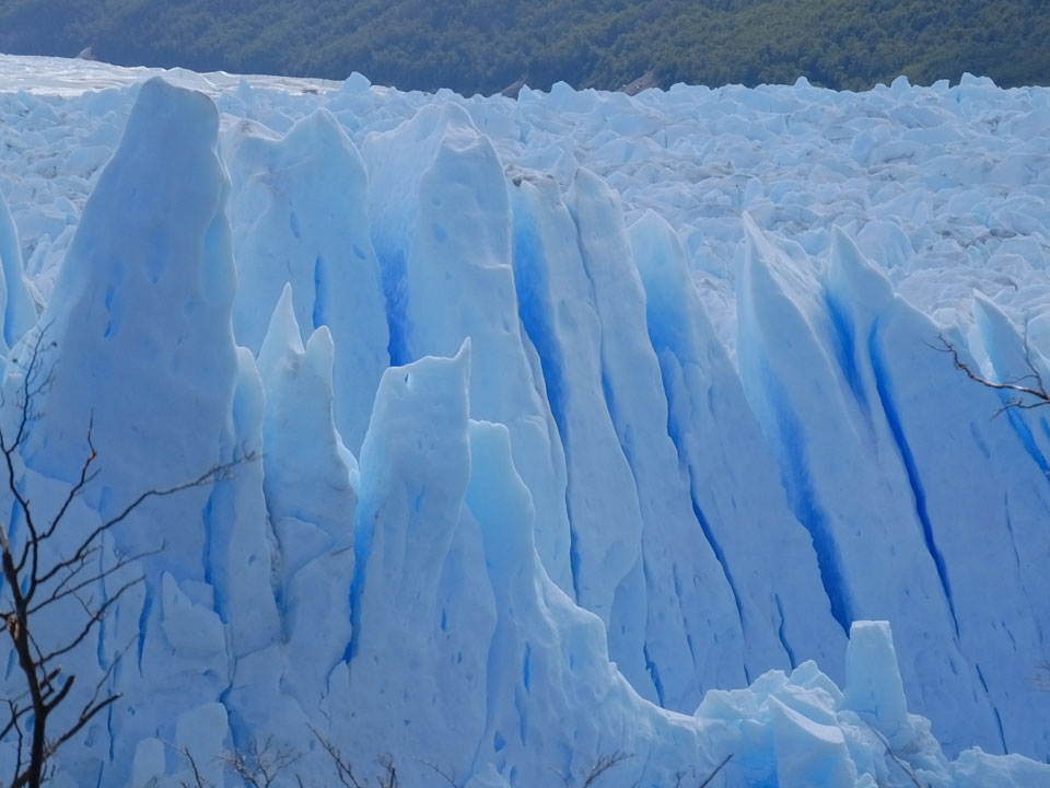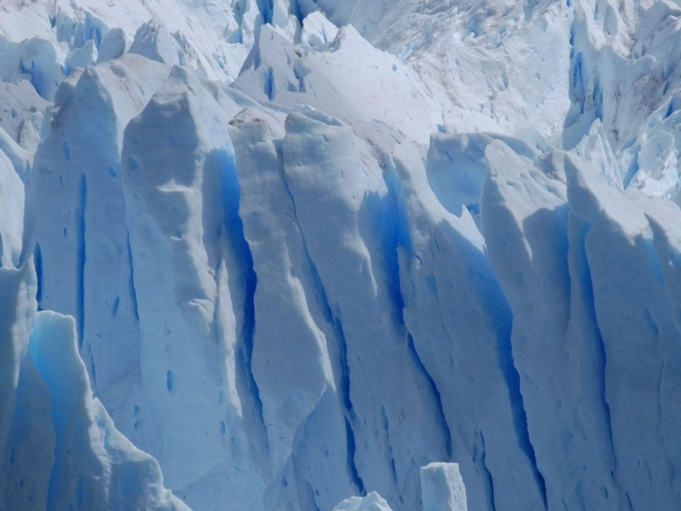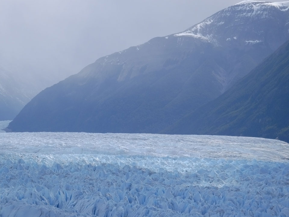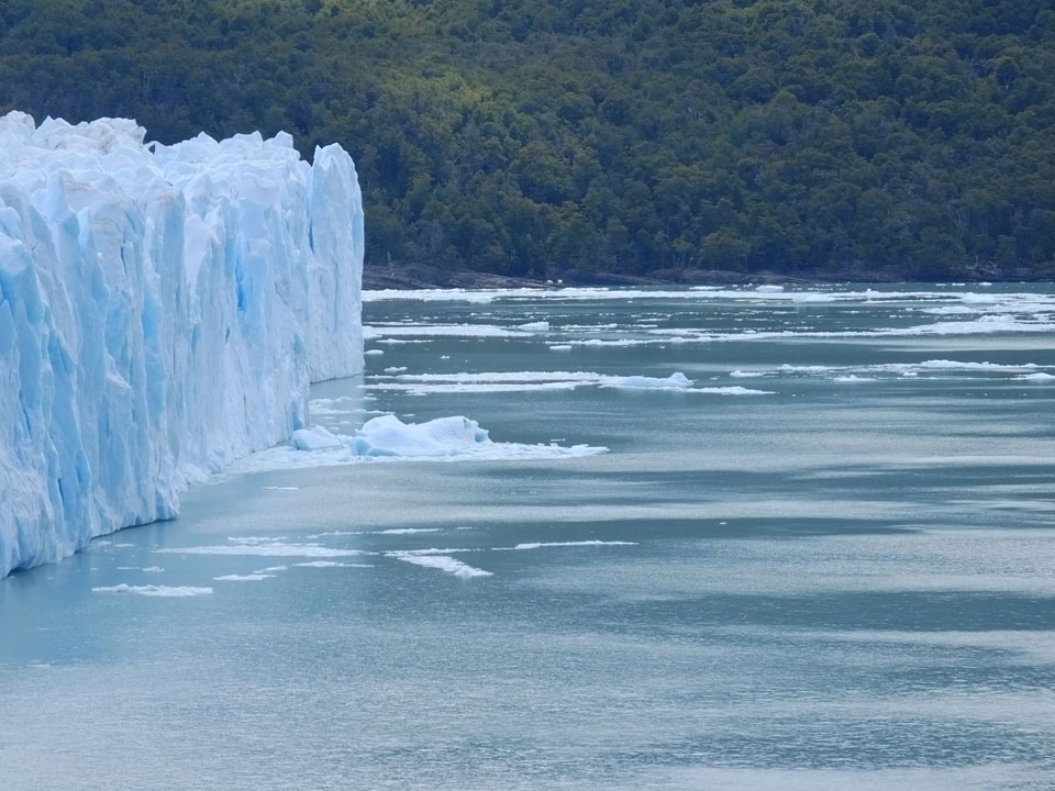 Der Weg besteht aus Gitterplatten und führt weiter runter recht nah an den Gletscher. Der Perito Moreno ist schon sehr eindrucksvoll. Das Eis ist gigantisch hoch und zieht sich in weite Ferne. Das Krachen und dumpfe Knacken den ständig in Bewegung befindlichen Gletschers zeigt die Masse und Kraft der Natur.