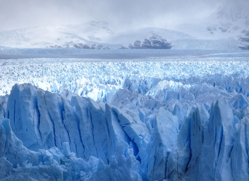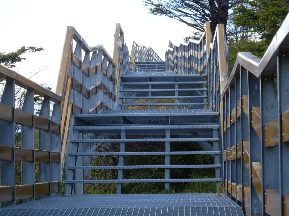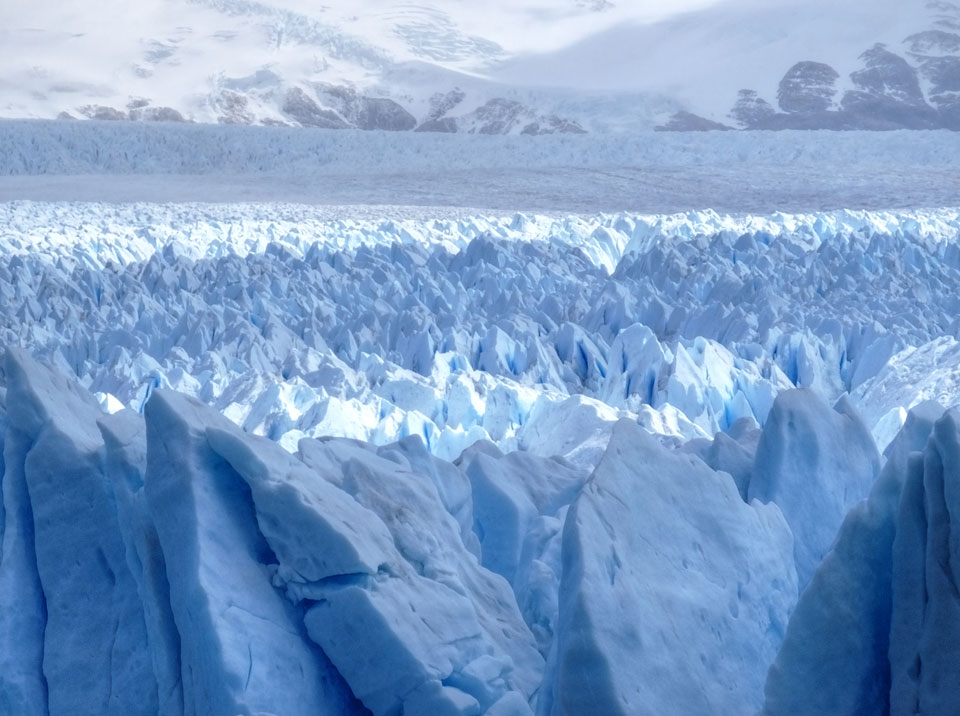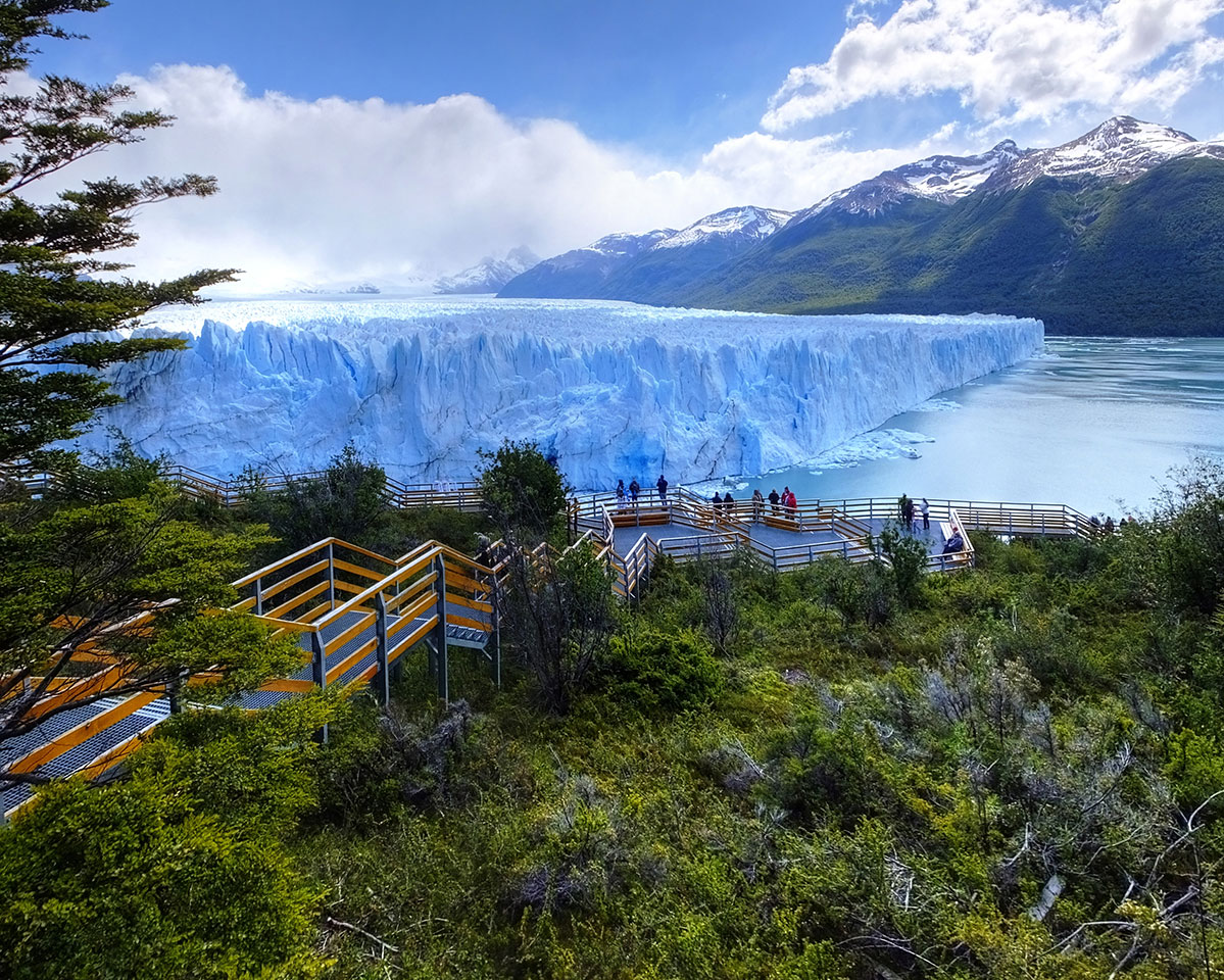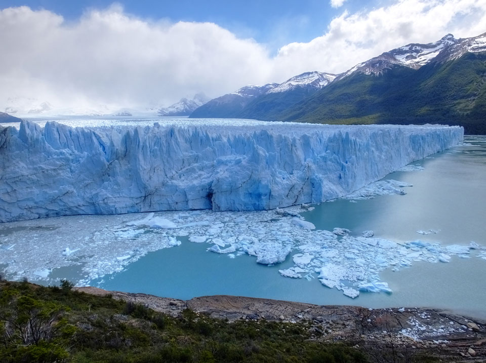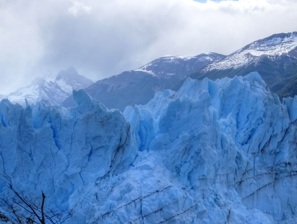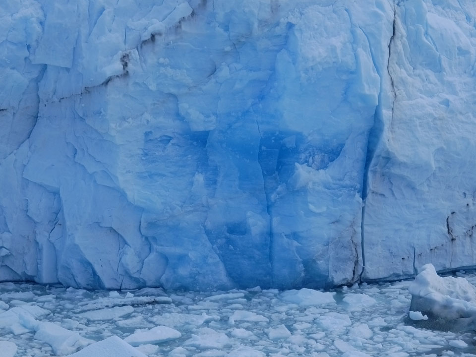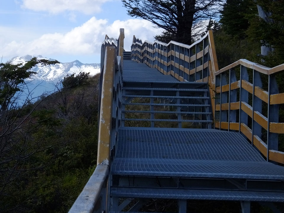 Der Weg besteht aus Gitterplatten und führt weiter runter recht nah an den Gletscher. Der Perito Moreno ist schon sehr eindrucksvoll. Das Eis ist gigantisch hoch und zieht sich in weite Ferne. Das Krachen und dumpfe Knacken den ständig in Bewegung befindlichen Gletschers zeigt die Masse und Kraft der Natur.