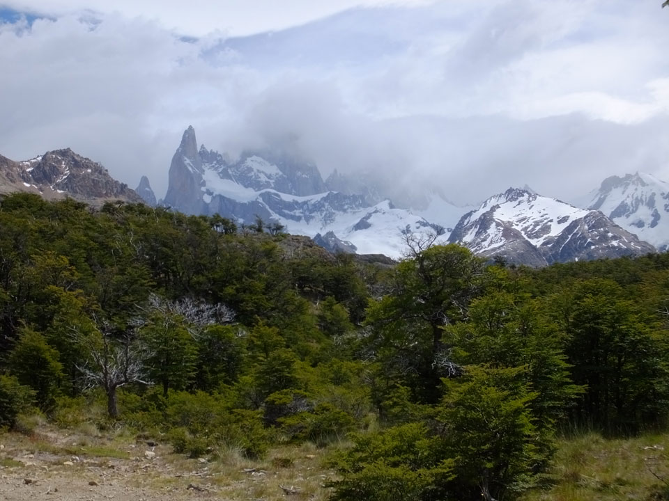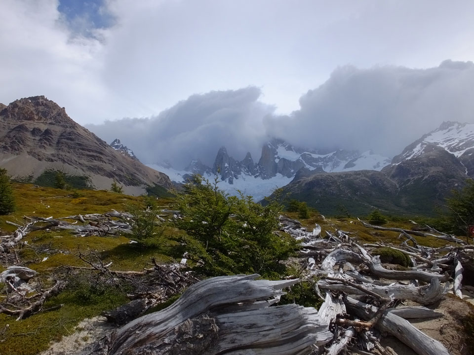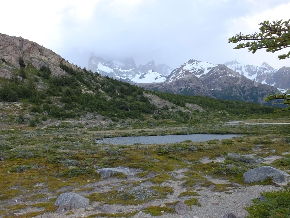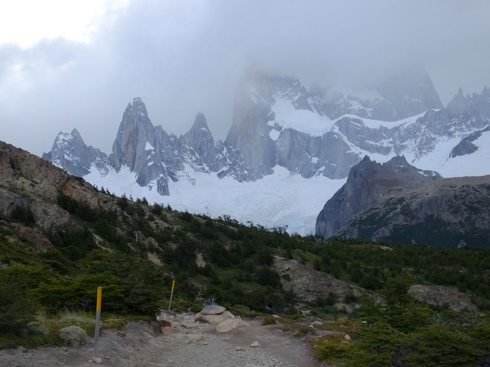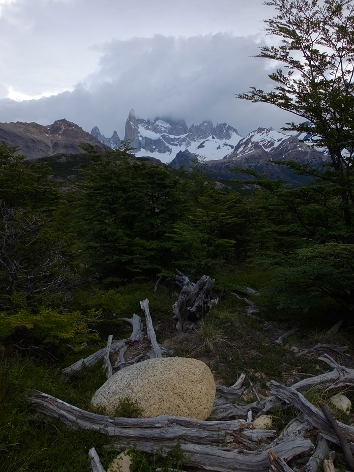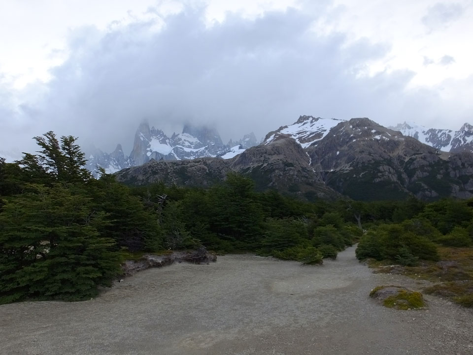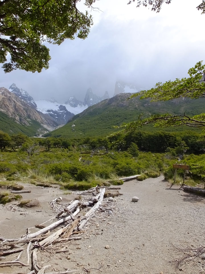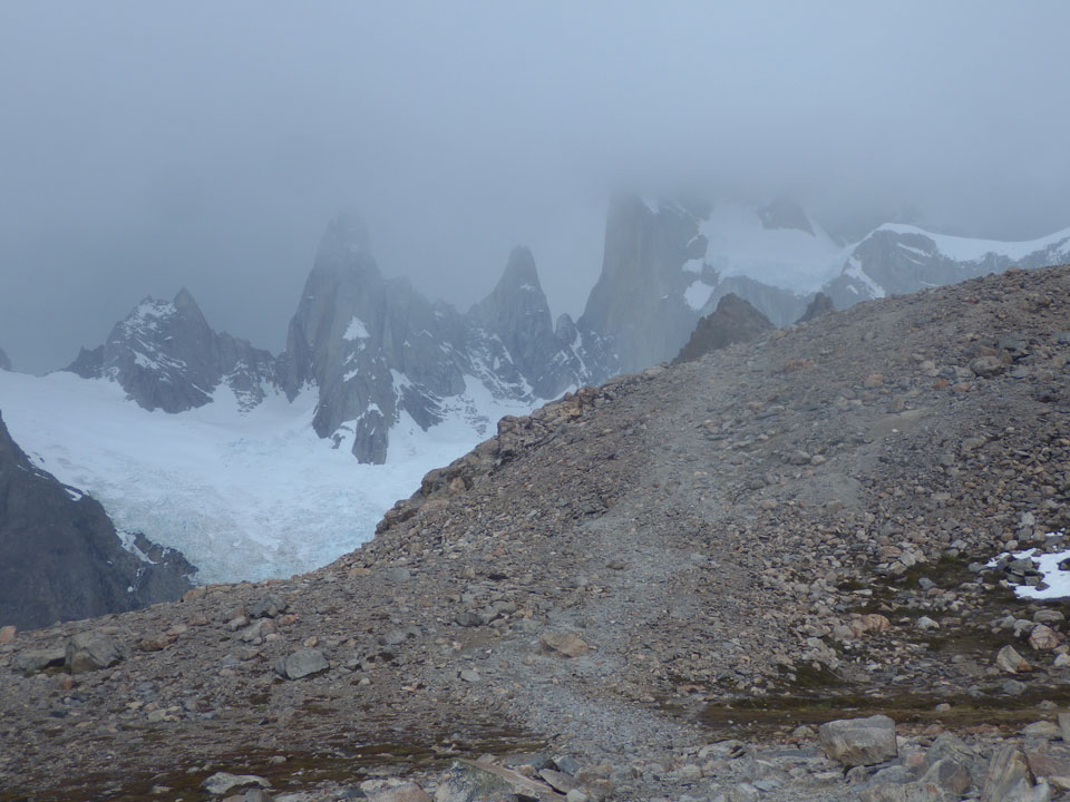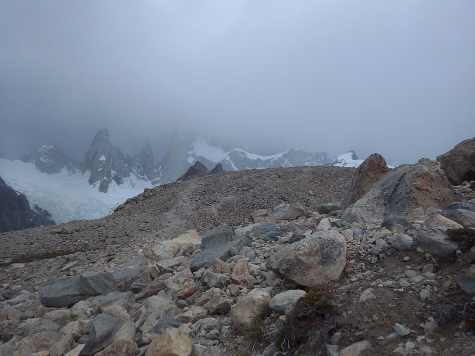 Nach unten ging’s auch OK, langsam aber sicher. Die Strecke zurück kannte ich, nur ging ich eine Alternativ-Route zum Mirador Fitz Roy. Da Sah ich dann nach ein paar Stunden doch noch den Berg. Tja, 2 Stunden später wäre vielleicht doch noch ein nettes Photo herausgekommen aber so ist das mit dem Wetter.