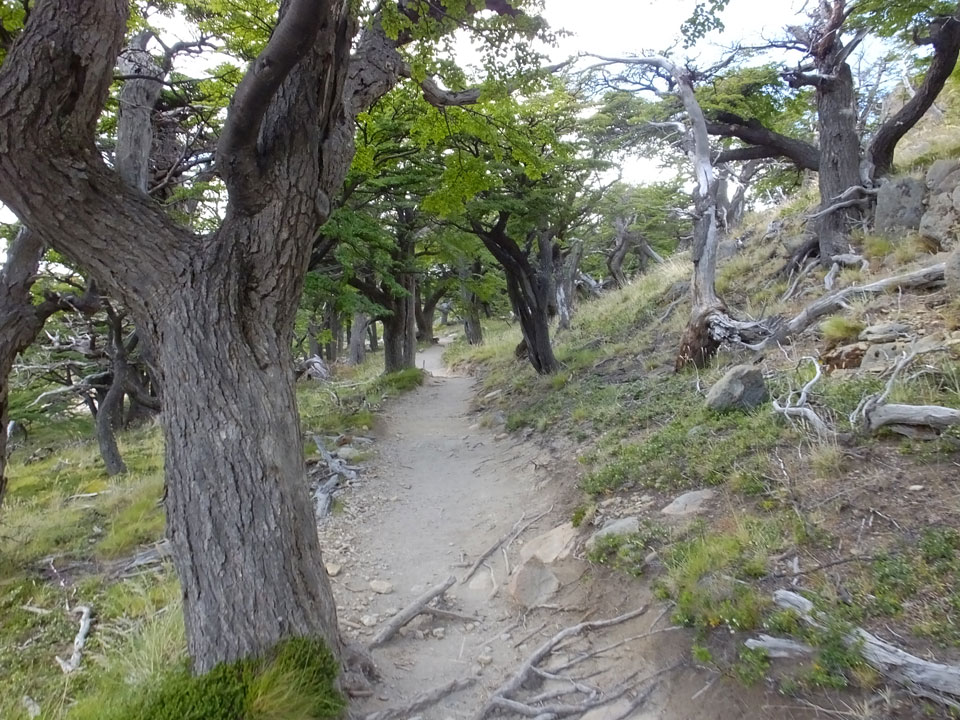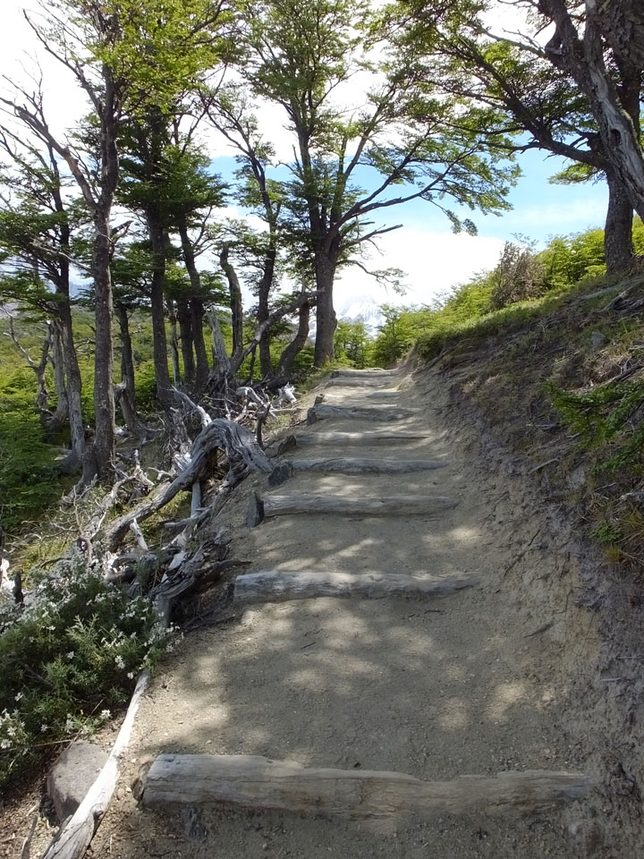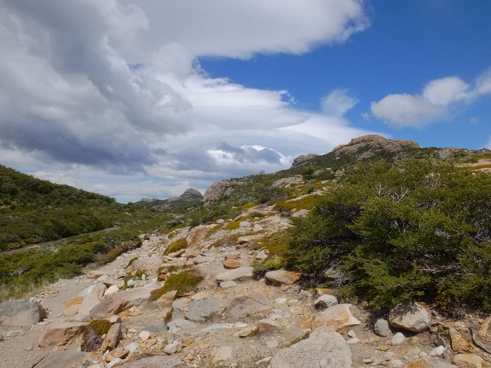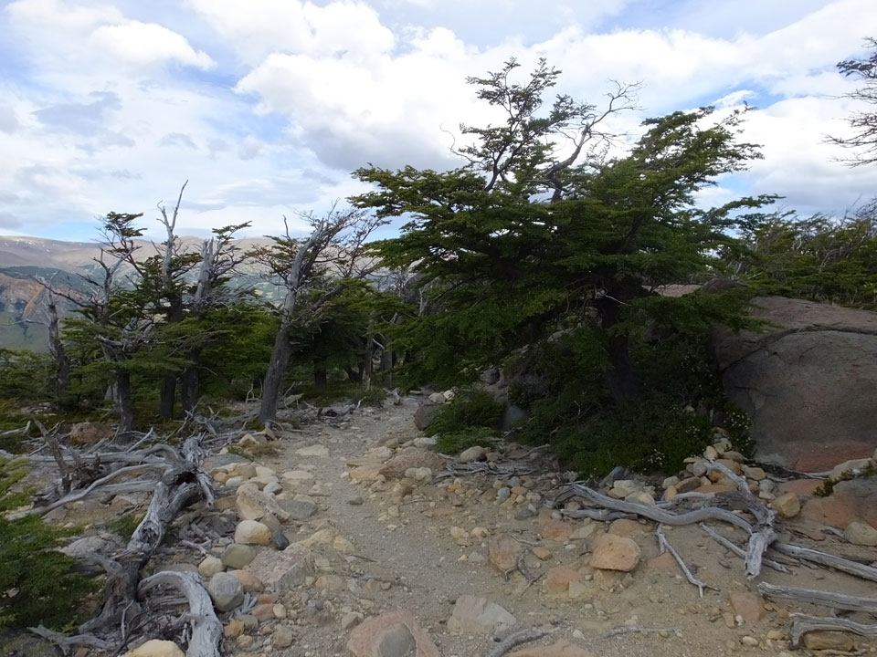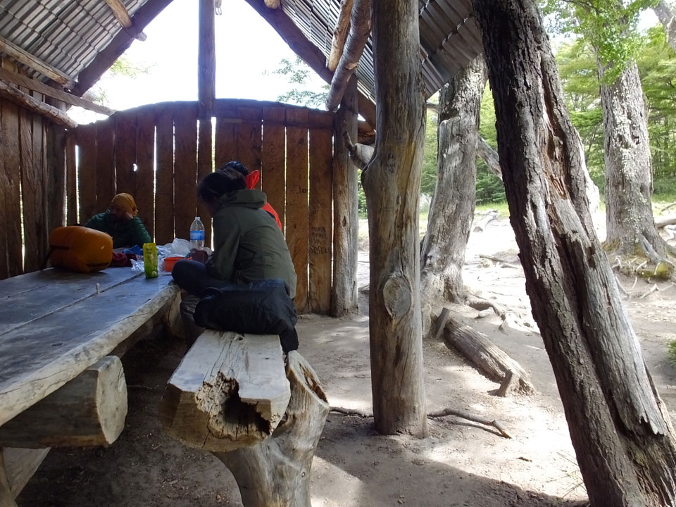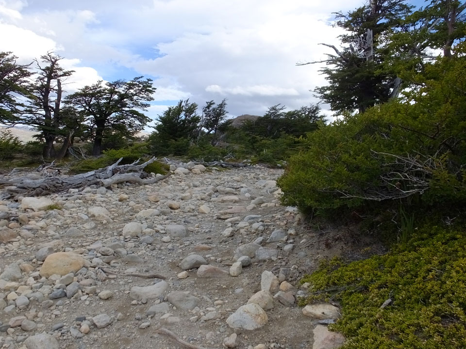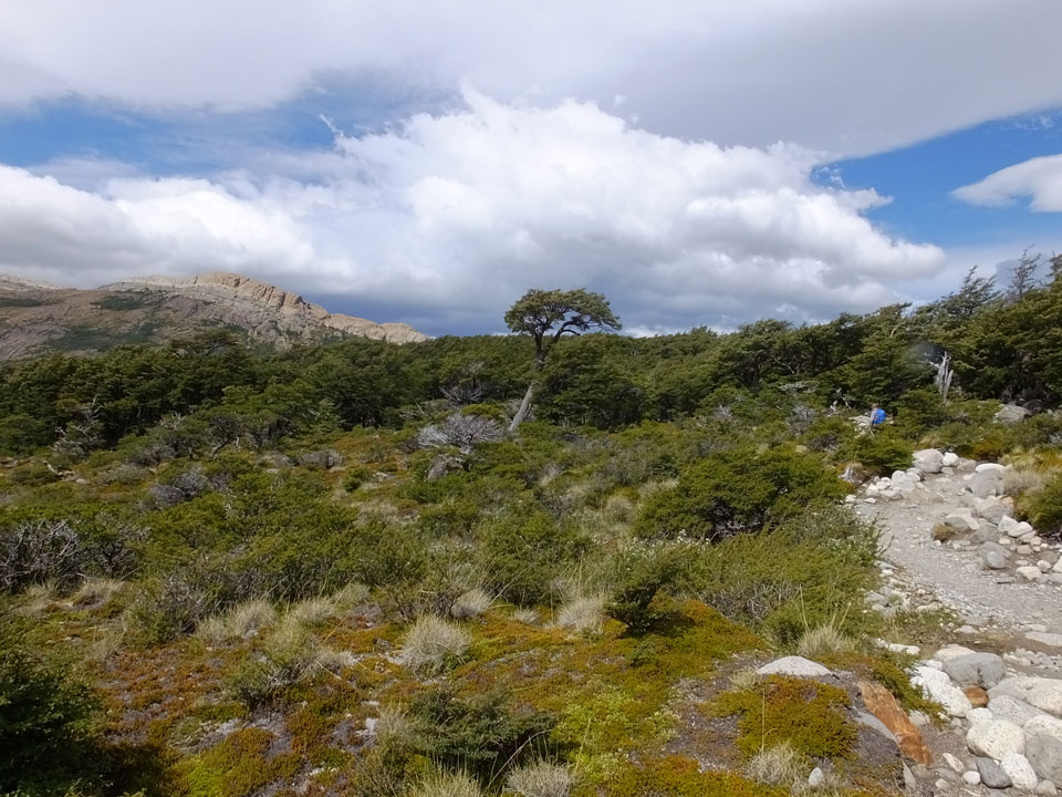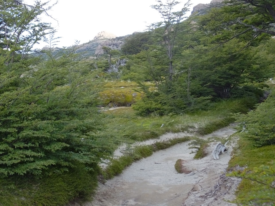 Nach dem Campingplatz Poincenot dann war ich fand am Aufstieg. Nur gut, dass ich hiernicht campe bei dem Wind. Vor dem Aufstieg, der letzten Stunde hoch zur Lagune, machte ich eine kleine Pause. Es nieselte inzwischen und Fitz Roy war heute komplett von Wolken umgeben. Da wird man oben auch nichts sehen aber nach nun 3h Wanderung machte ich auch die letzte Etappe.