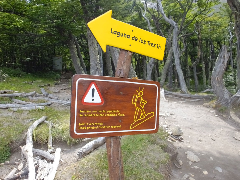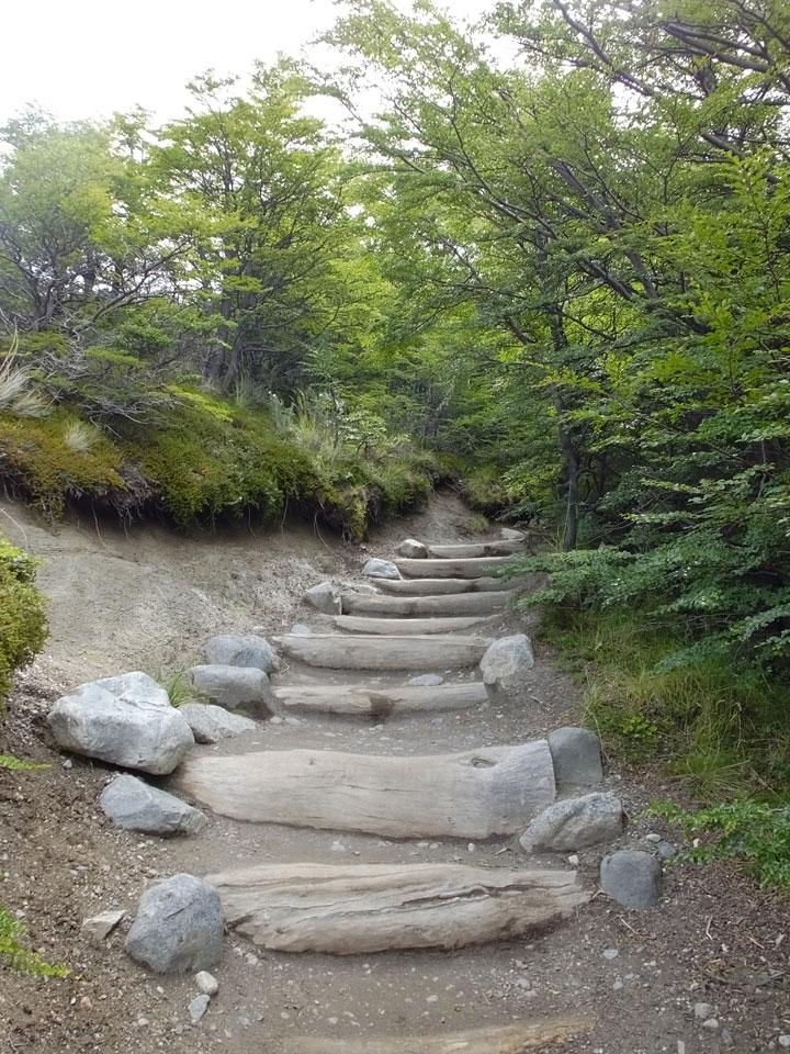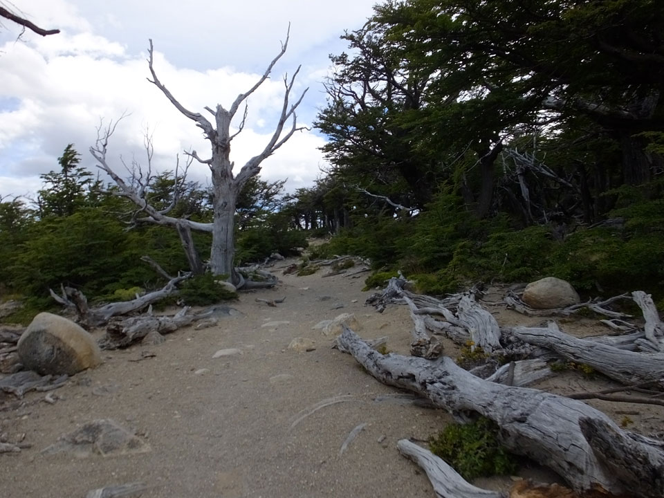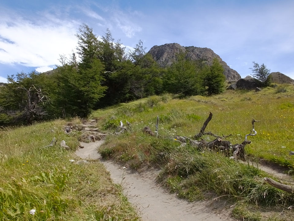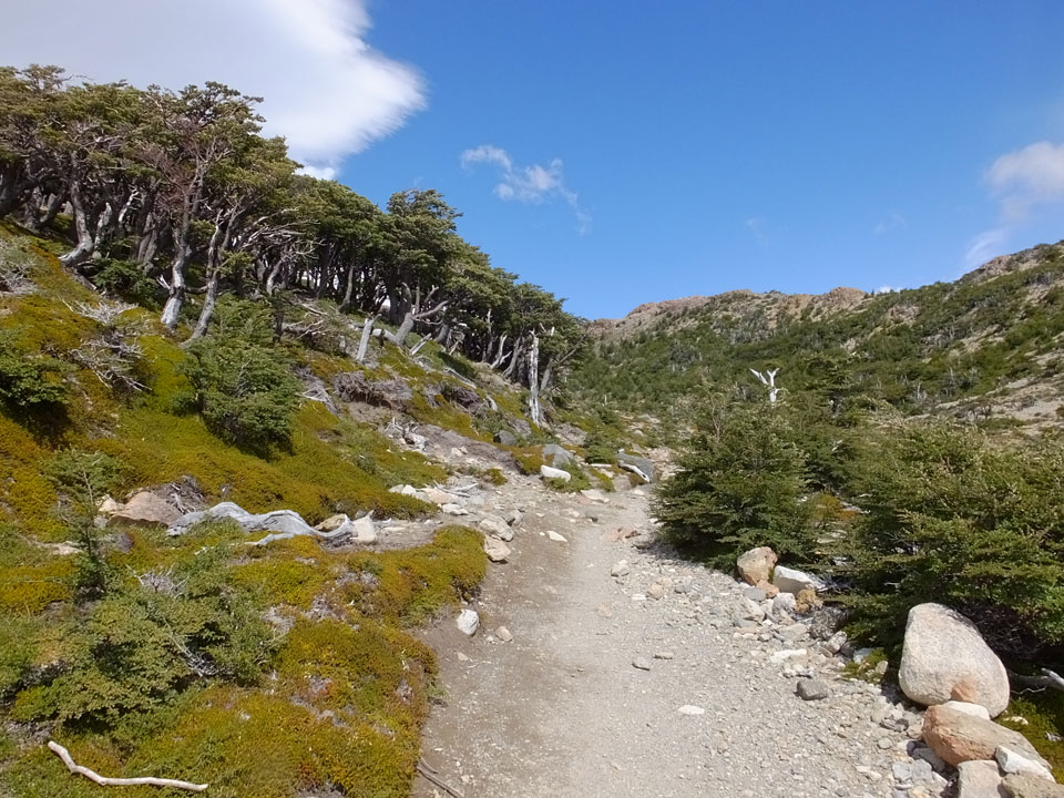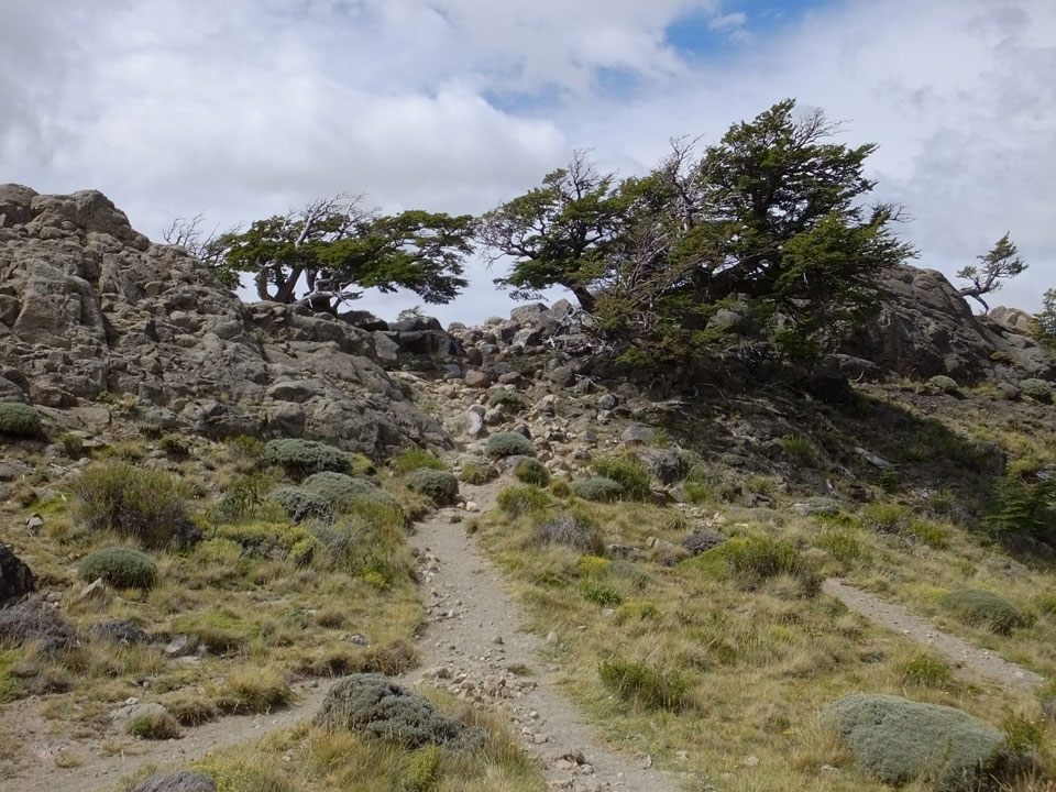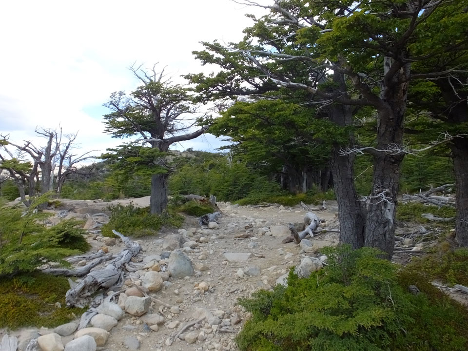 Nach dem Campingplatz Poincenot dann war ich fand am Aufstieg. Nur gut, dass ich hiernicht campe bei dem Wind. Vor dem Aufstieg, der letzten Stunde hoch zur Lagune, machte ich eine kleine Pause. Es nieselte inzwischen und Fitz Roy war heute komplett von Wolken umgeben. Da wird man oben auch nichts sehen aber nach nun 3h Wanderung machte ich auch die letzte Etappe.
