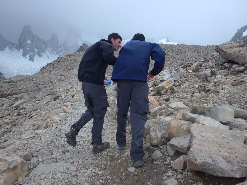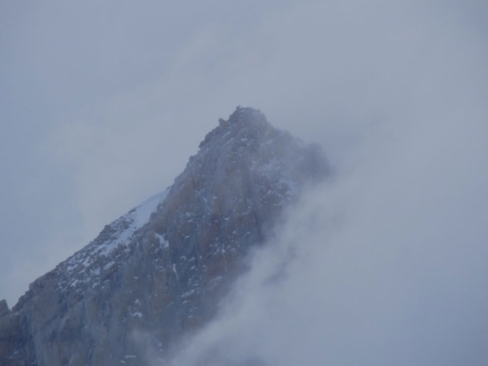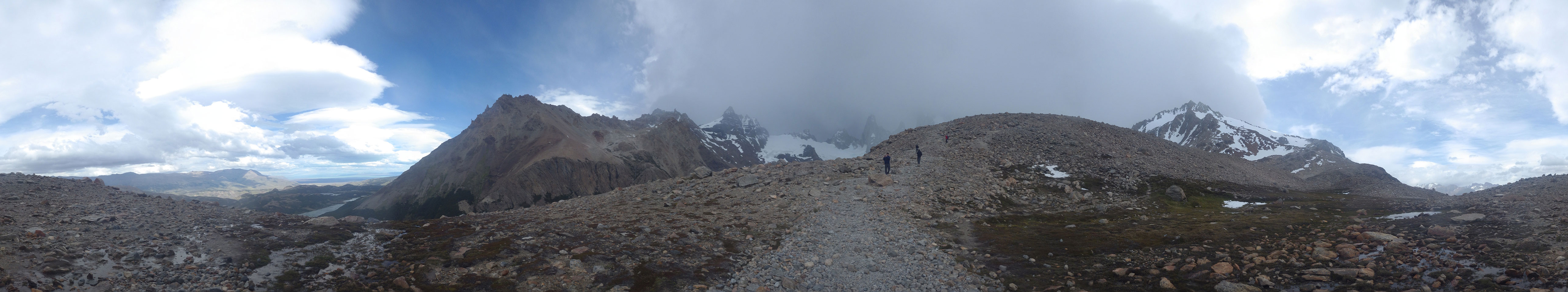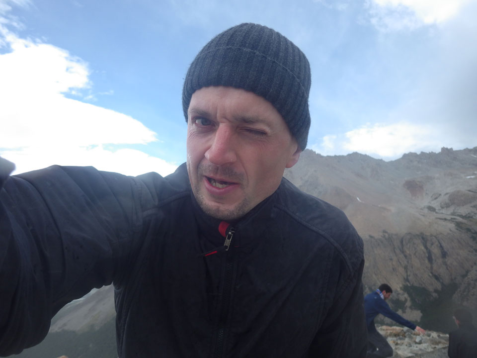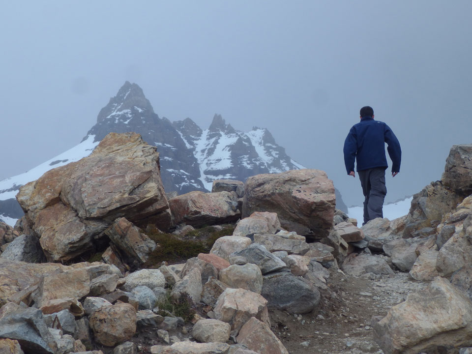 Es wurde rutschig kalt und immer windiger. Dann oben wehte ein Wind, wie ich ihn in der Stärke persönlich noch nie erlebt hatte. Ich kauerte mich hin. ein paar Israelis waren auch daber. Unten auf der Erde schoben mich Böen einfach so dahin. Ich hielt mich an Felsbroken fest und war vorsichtig. Hier konnte man heute echt fort geweht werden. Der petschende Sturm schoß Hagel in mein Gesicht. Schmerzhafte Angelegenheit. Heute war bei dem Wetter auch fast nichts zu sehen. Das vermeintlich Highlight hier in der Gegend versteckte sich ebenfalls wie die Torres hinter der Wetterwand.