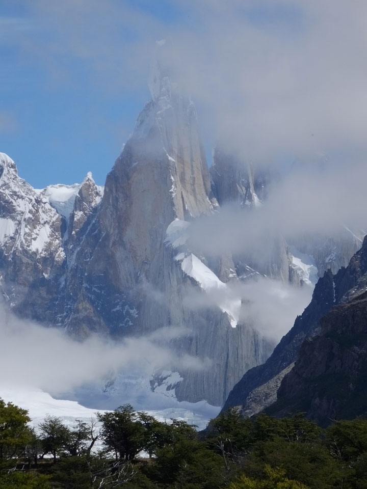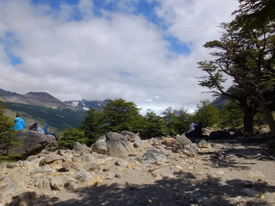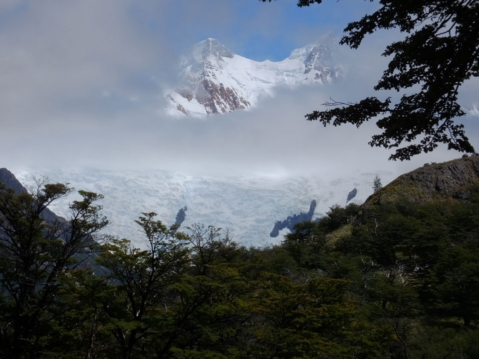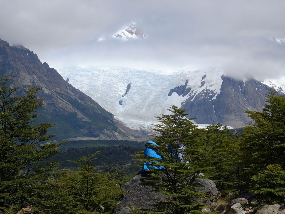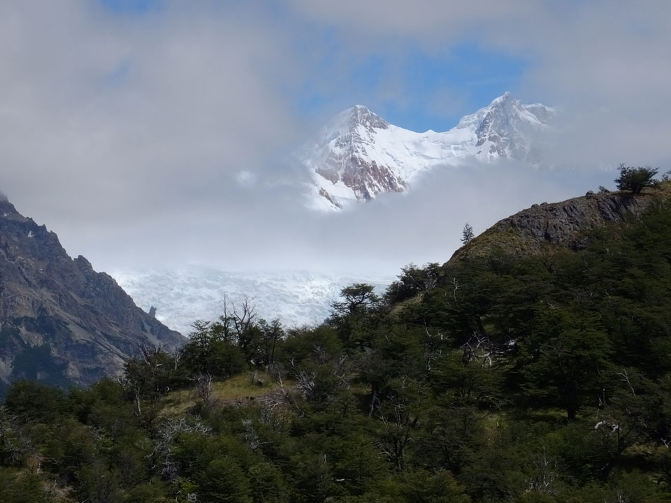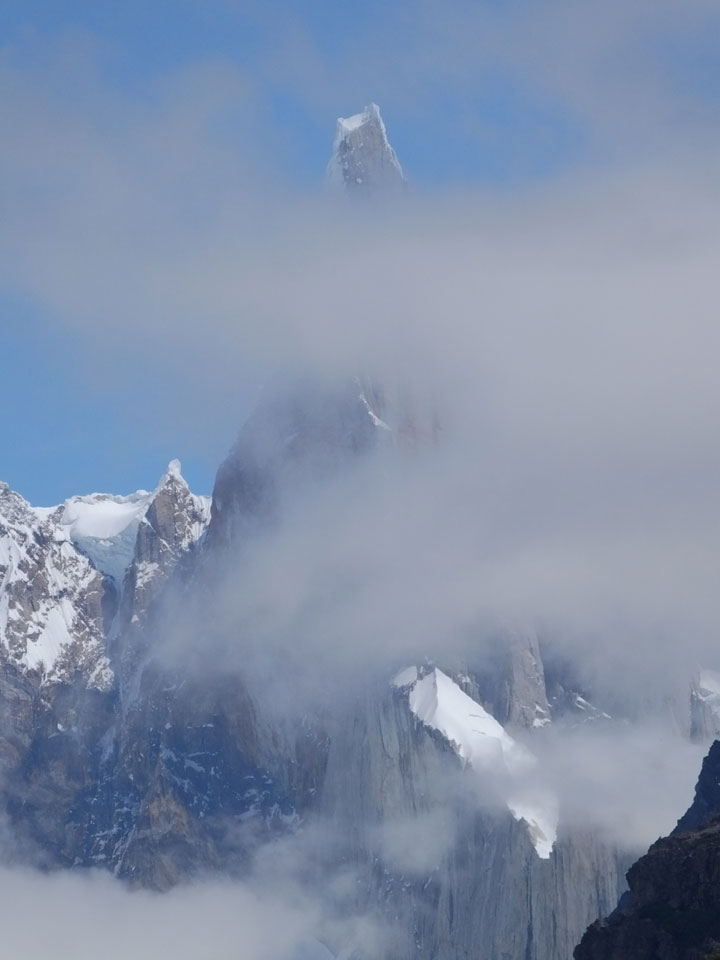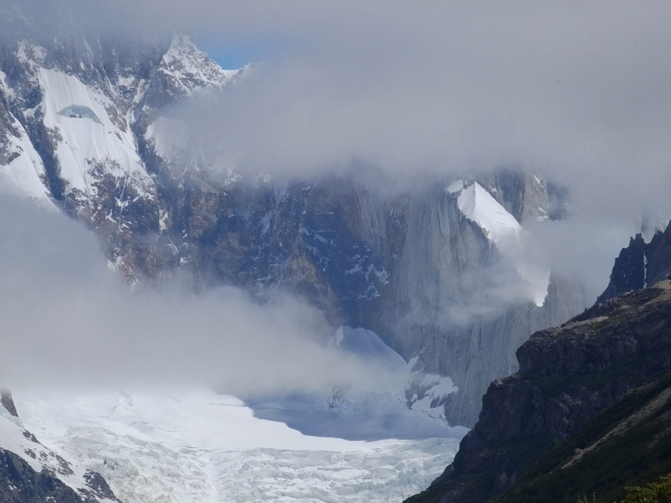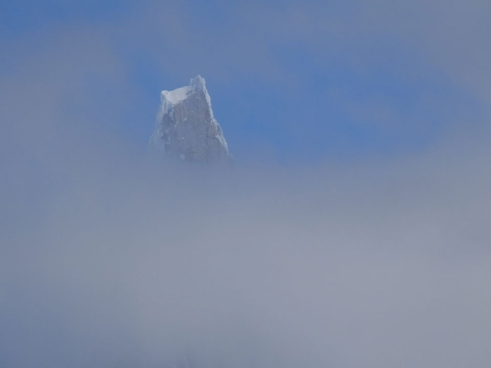 Nach einer Stunde an einem Aussichtspunkt sah ich ein Loch in der Wolkendecke. Es sollte aber aufklaren. Das Wetter war super und wurde immer besser. Klare Sicht auf Cerro Torre schließlich und nach 3 Stunden, wie geplant an der Lagune.