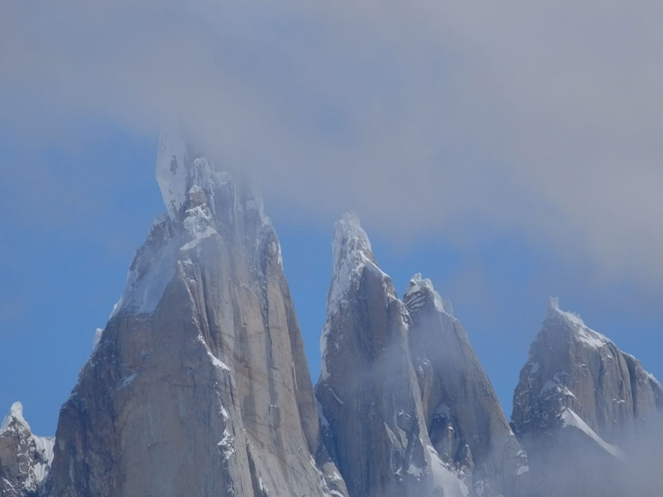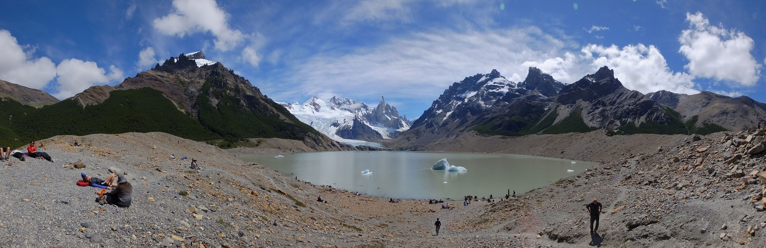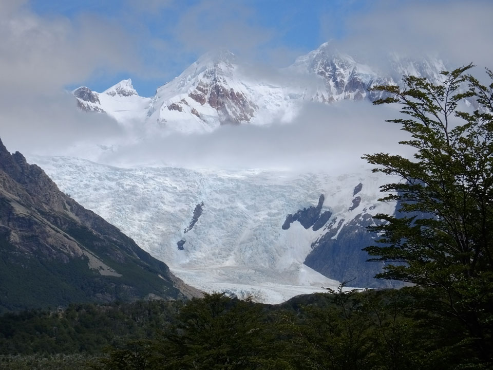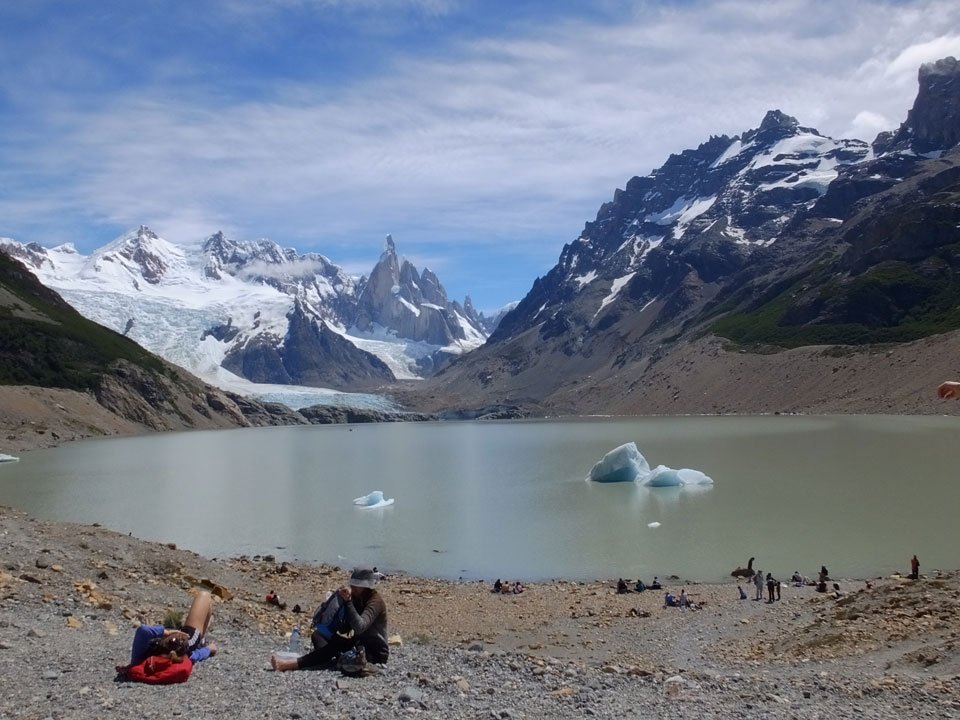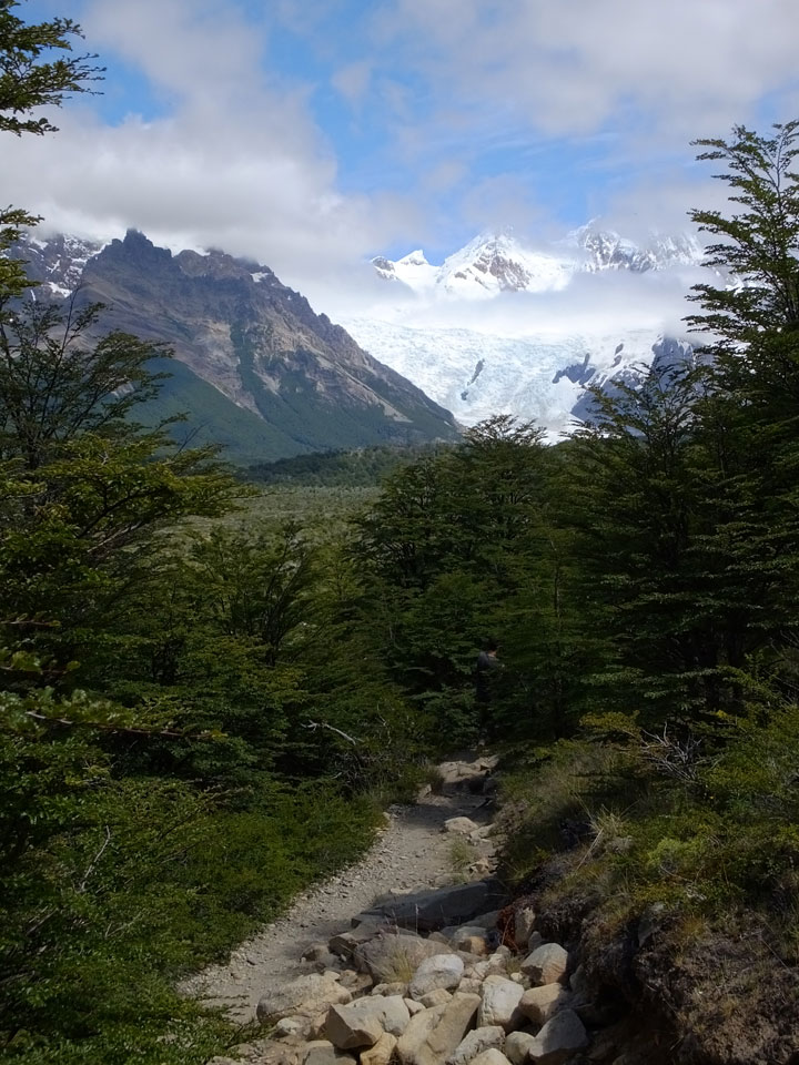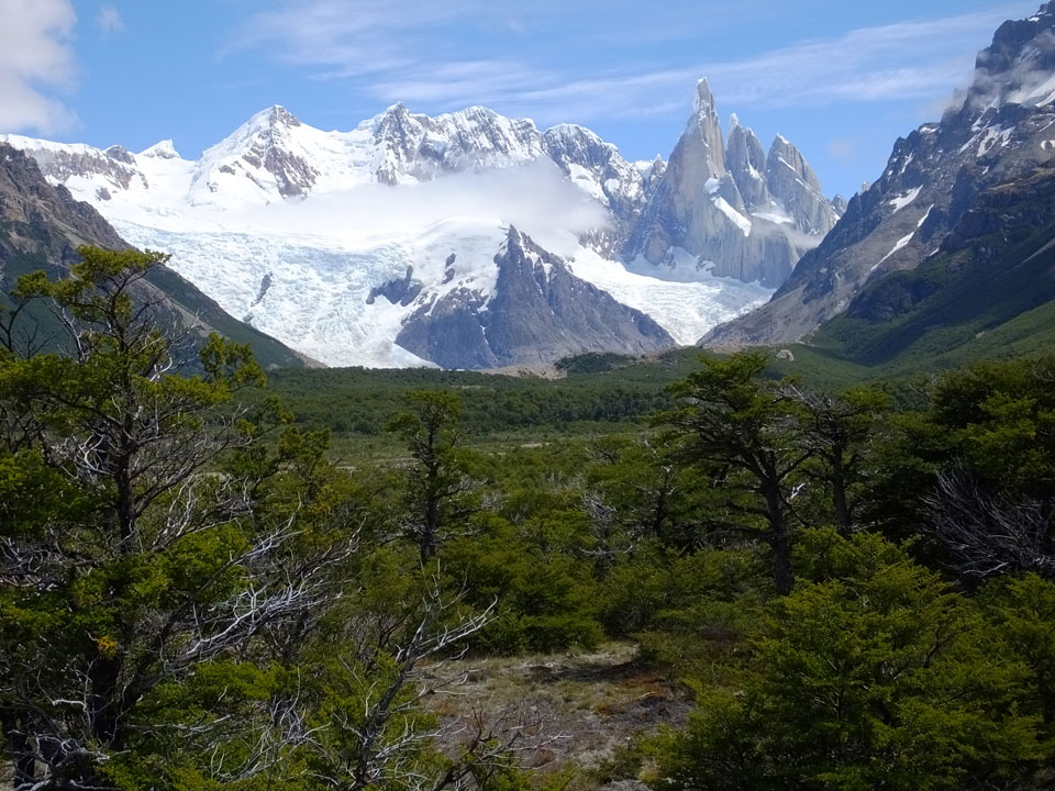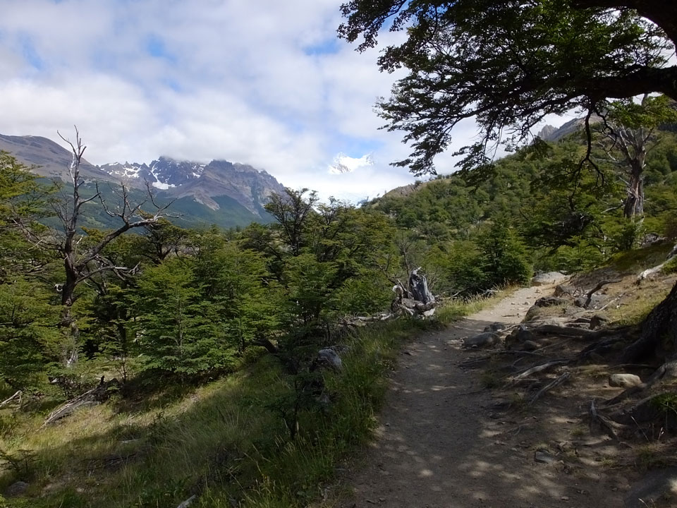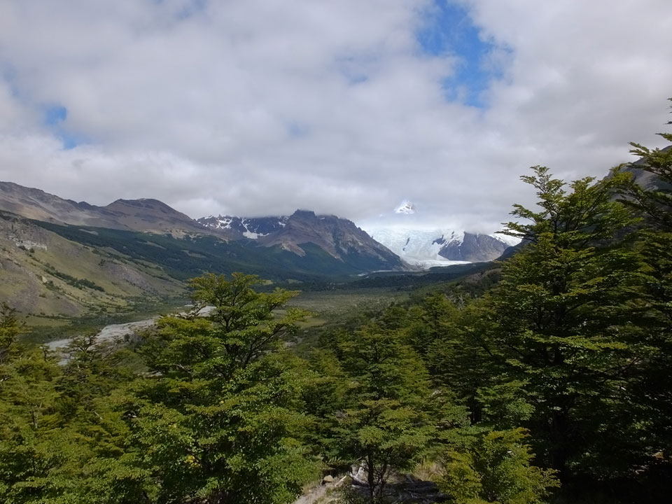 Nach einer Stunde an einem Aussichtspunkt sah ich ein Loch in der Wolkendecke. Es sollte aber aufklaren. Das Wetter war super und wurde immer besser. Klare Sicht auf Cerro Torre schließlich und nach 3 Stunden, wie geplant an der Lagune.