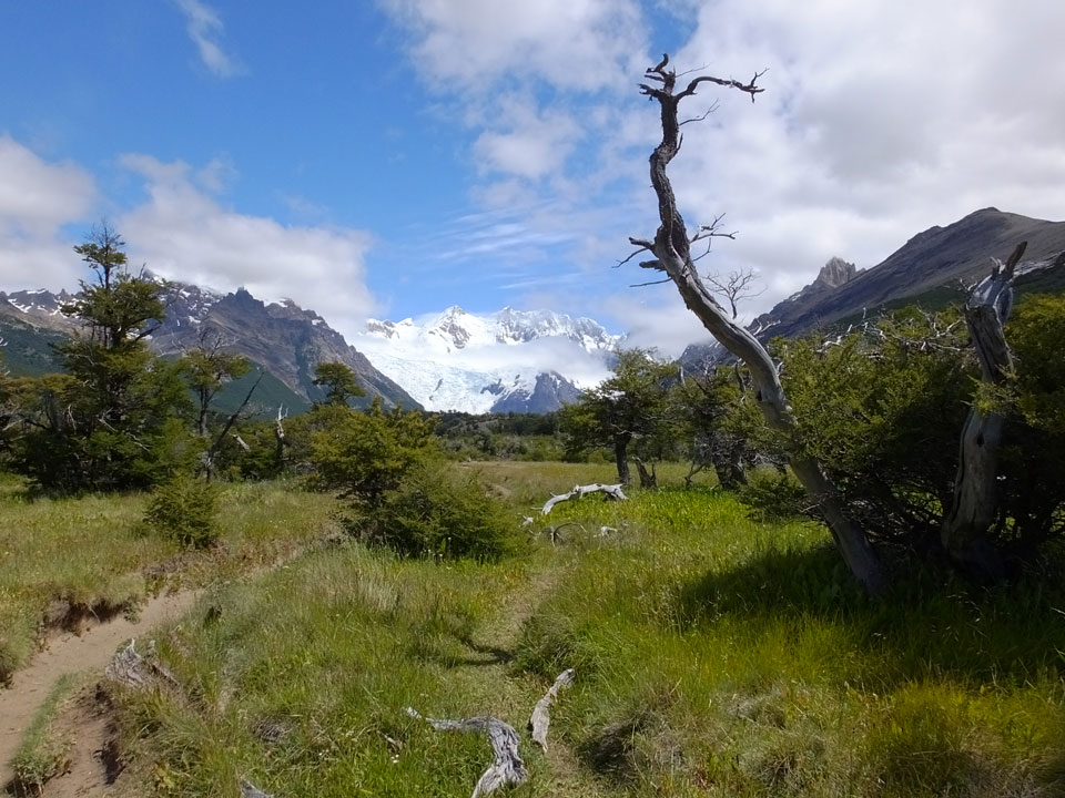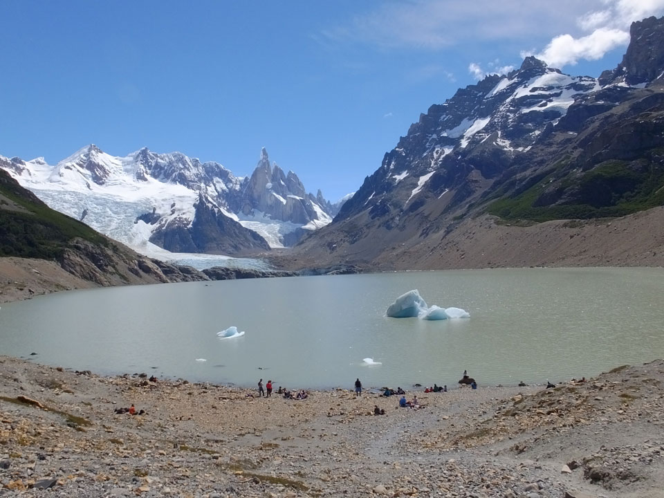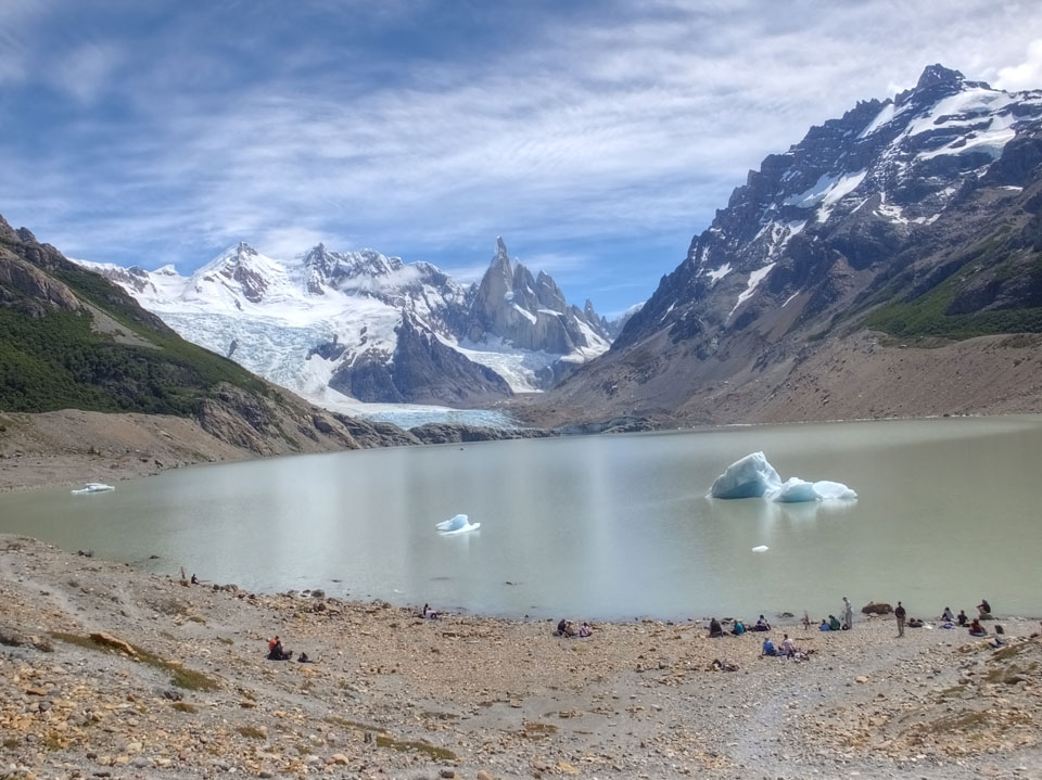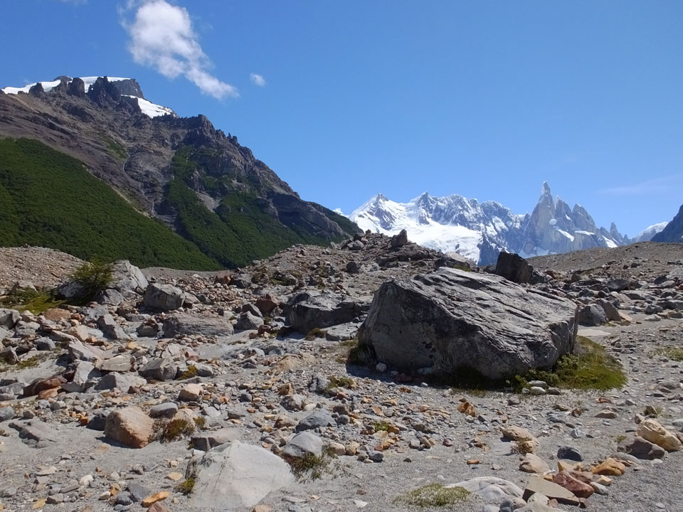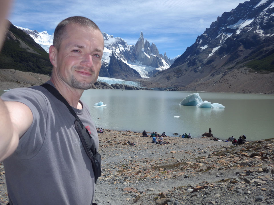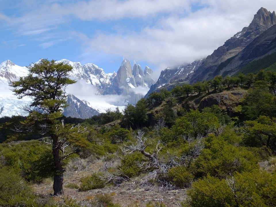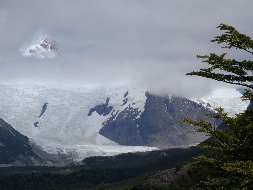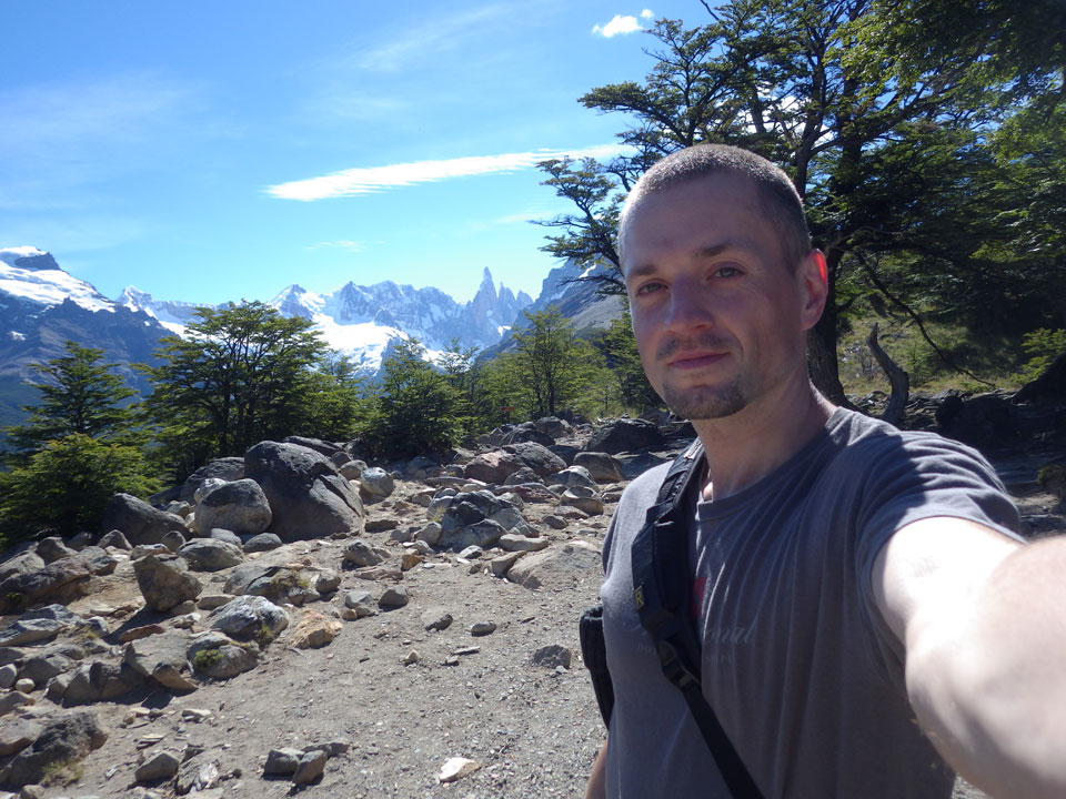 Nach einer Stunde an einem Aussichtspunkt sah ich ein Loch in der Wolkendecke. Es sollte aber aufklaren. Das Wetter war super und wurde immer besser. Klare Sicht auf Cerro Torre schließlich und nach 3 Stunden, wie geplant an der Lagune.