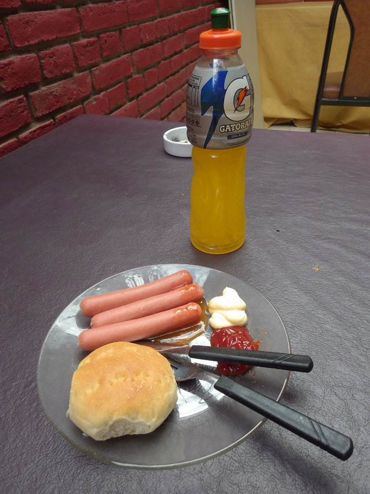 Kein Internet und keine Ahnung, wie ich zum Hostel komme. Ich fand ein Café, hatte Frühstück. Zuerst die Version mit Medialunas (Hörnchen mit Zucker) – ARS 20, dann Internet und nochmal eins mit den Brötchen (ARS 18). Die Preise sind jetzt bezahlbarer.